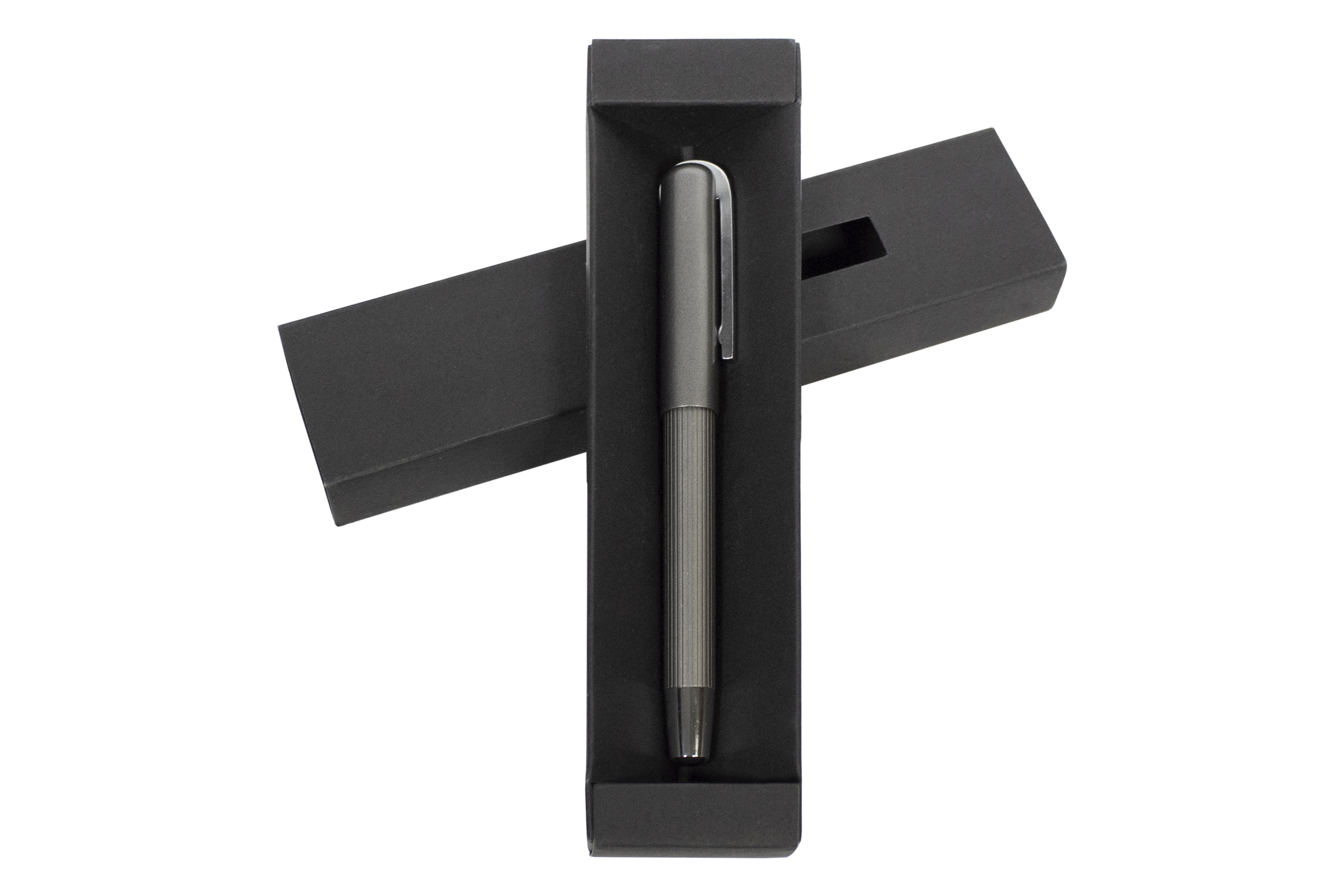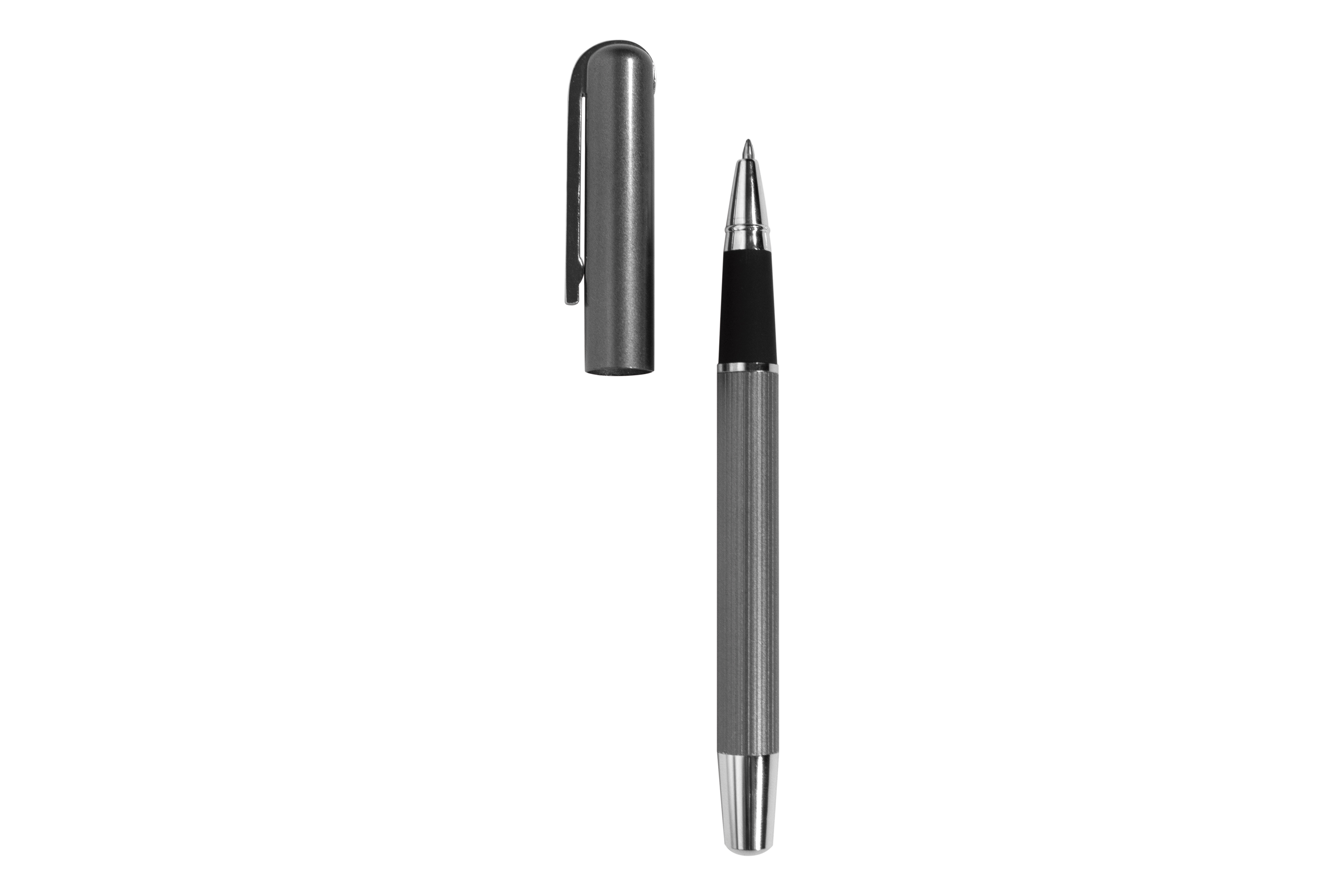 Metal. Cuerpo color plata con detalles, capuchon con clip plata brillante. Tinta gel color negra. Destapa color plata.