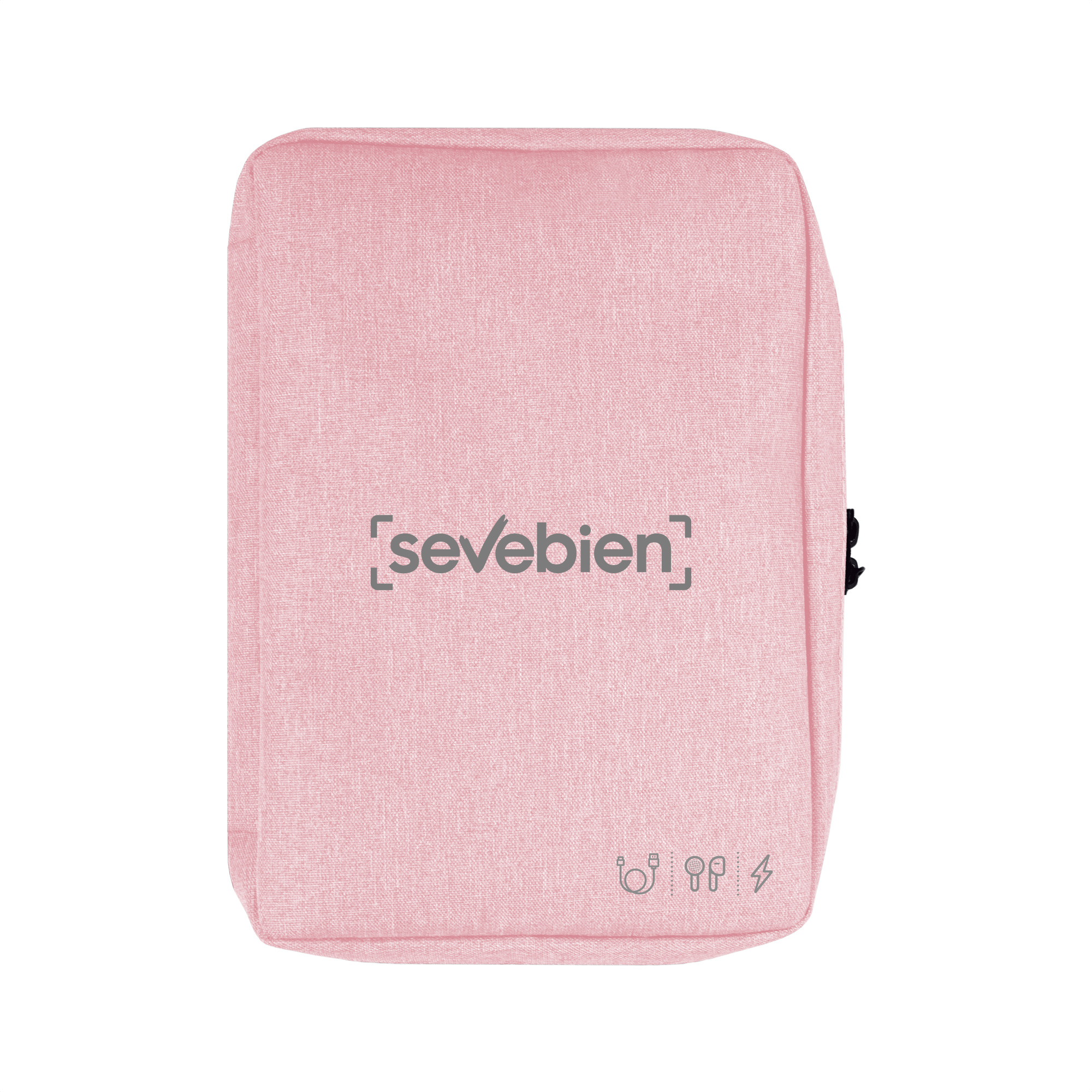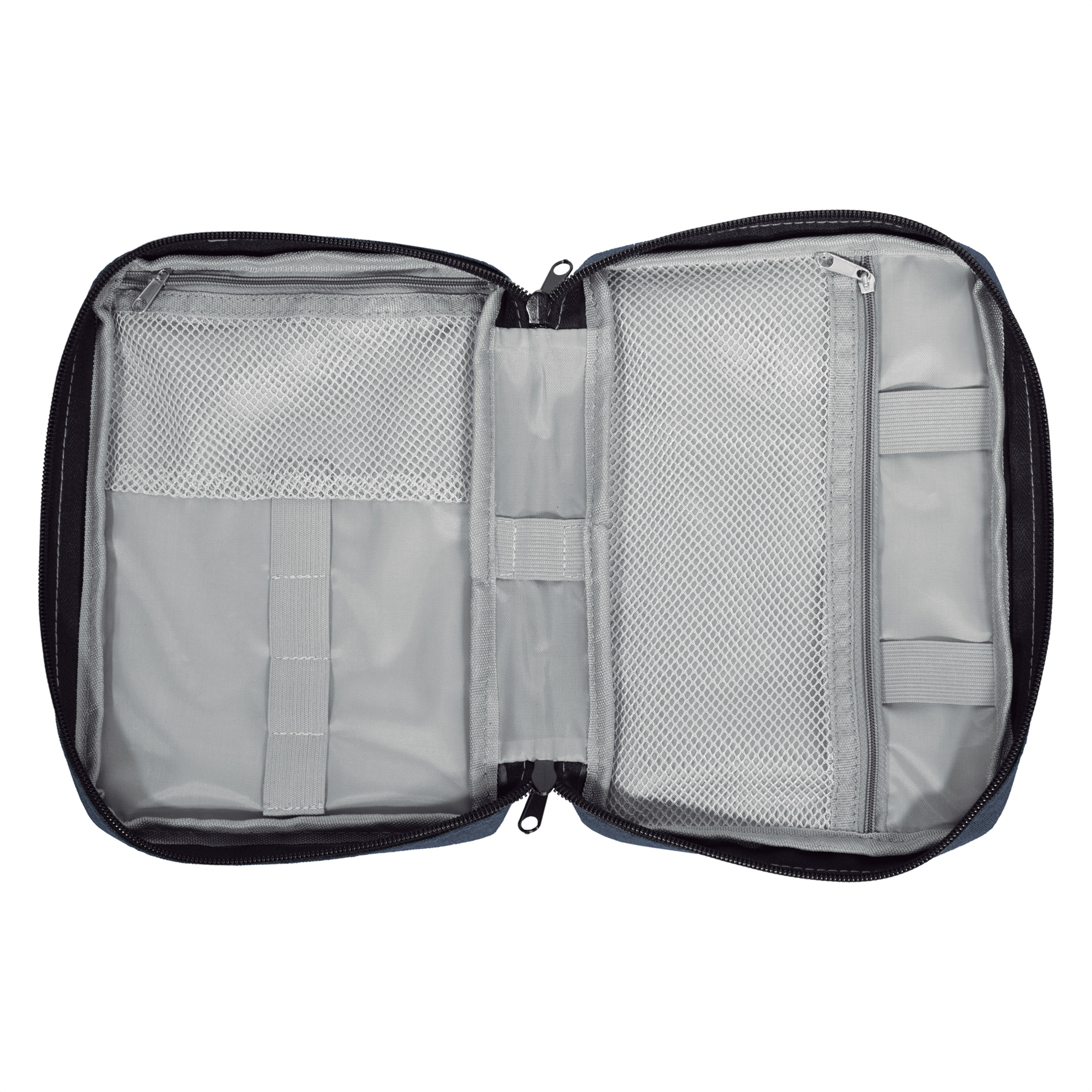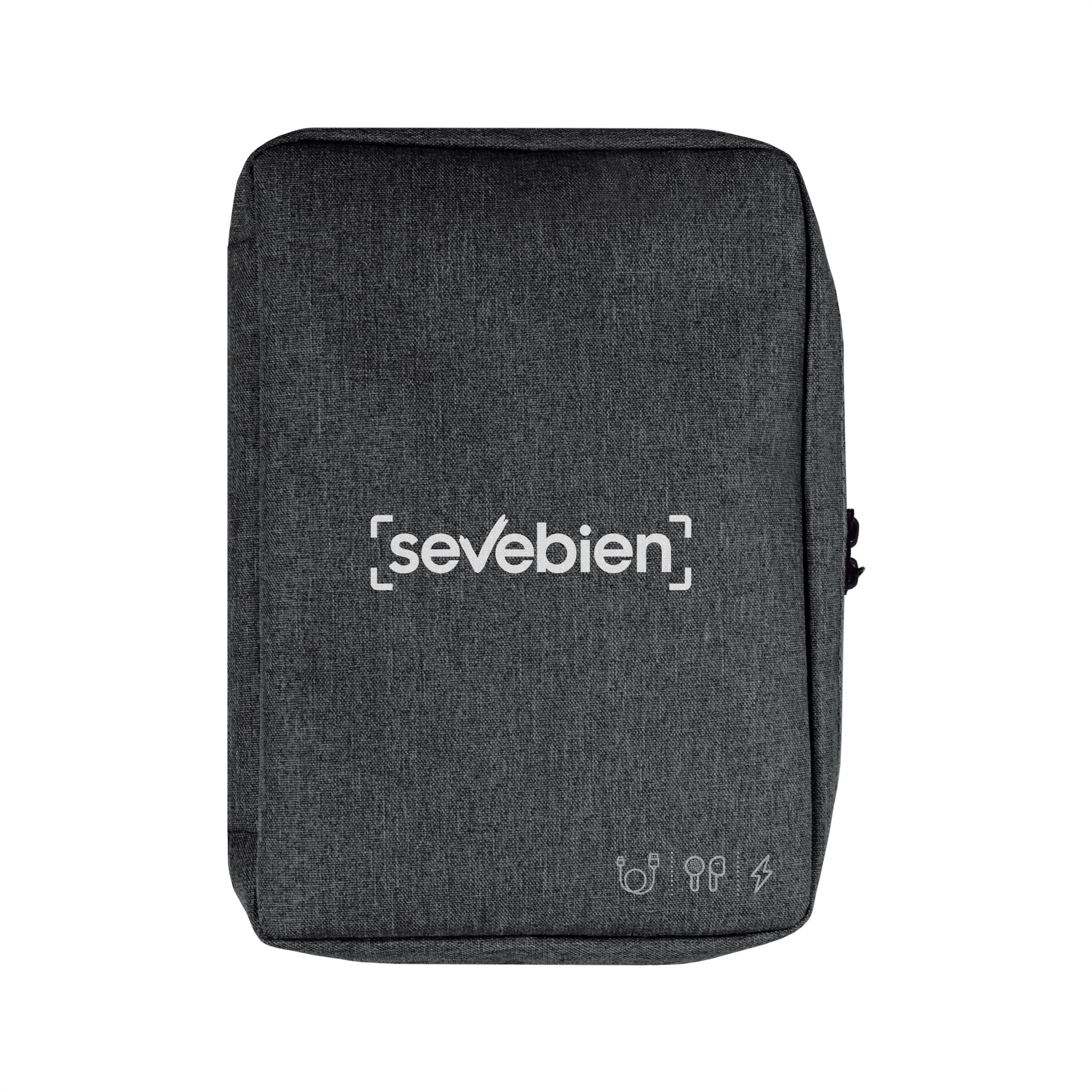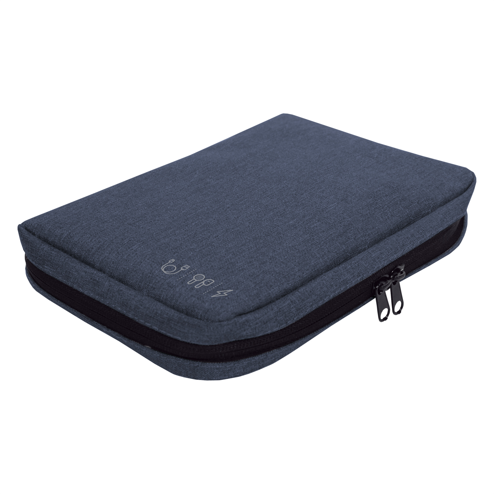 26 x 19 x 5 cm. Poliéster. Organizador para cables y accesorios. Cuenta con dos bolsillos de red con cierre. 4 elásticos que permiten arrollar y guardar los cables, 1 elástico porta bolígrafo y 2 elásticos amplios. NO INCLUYE ACCESORIOS.