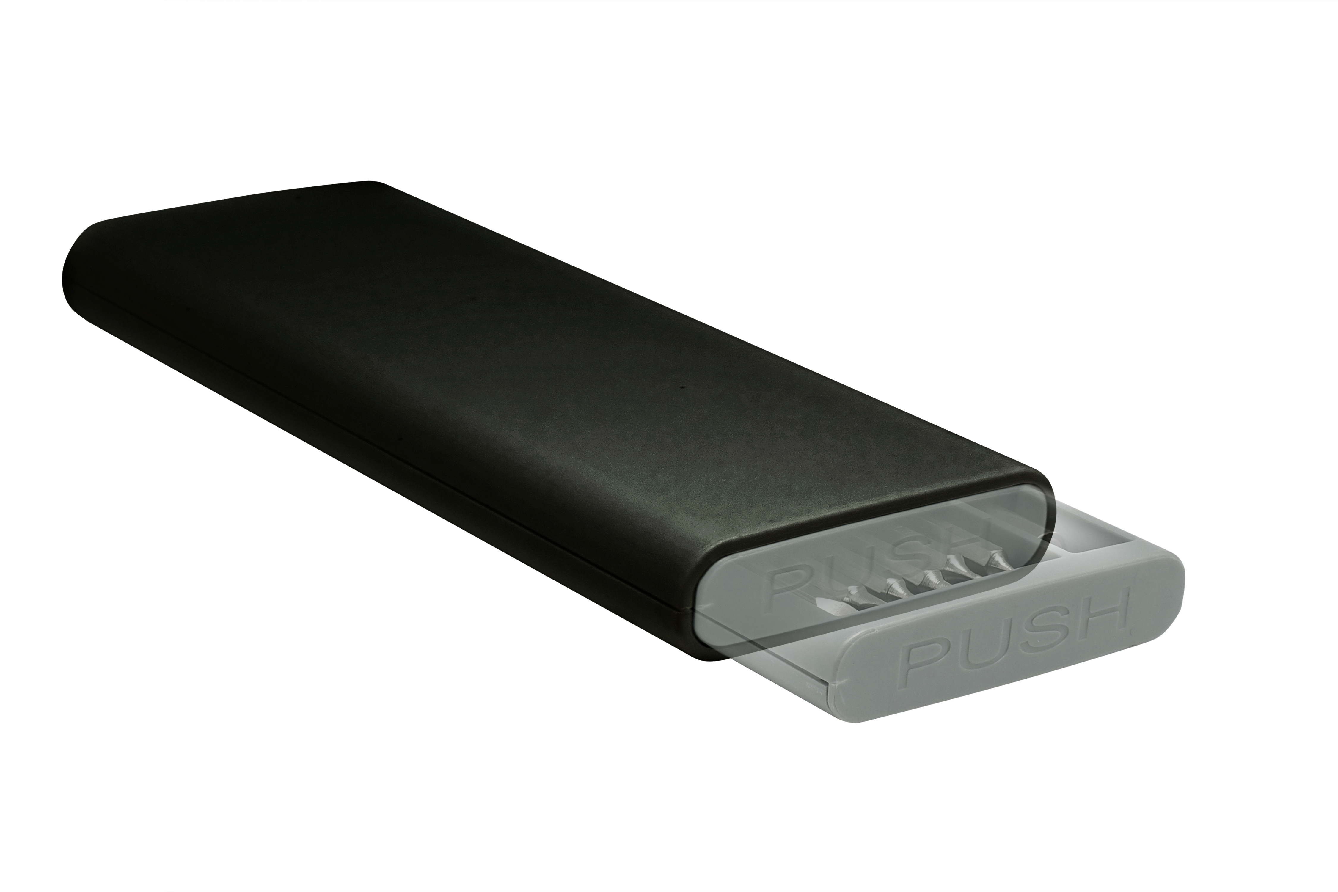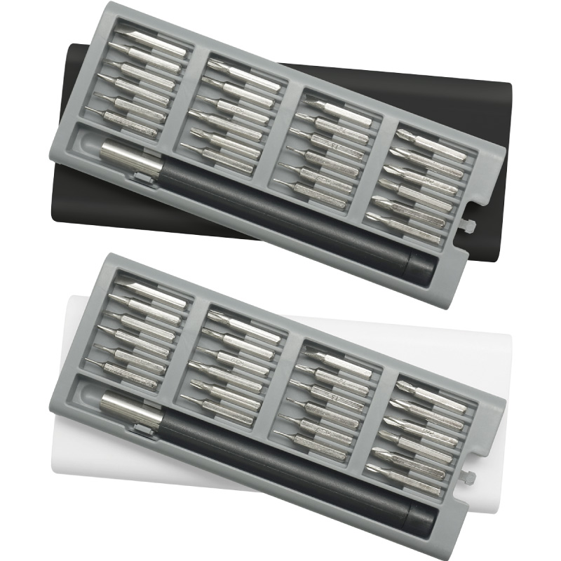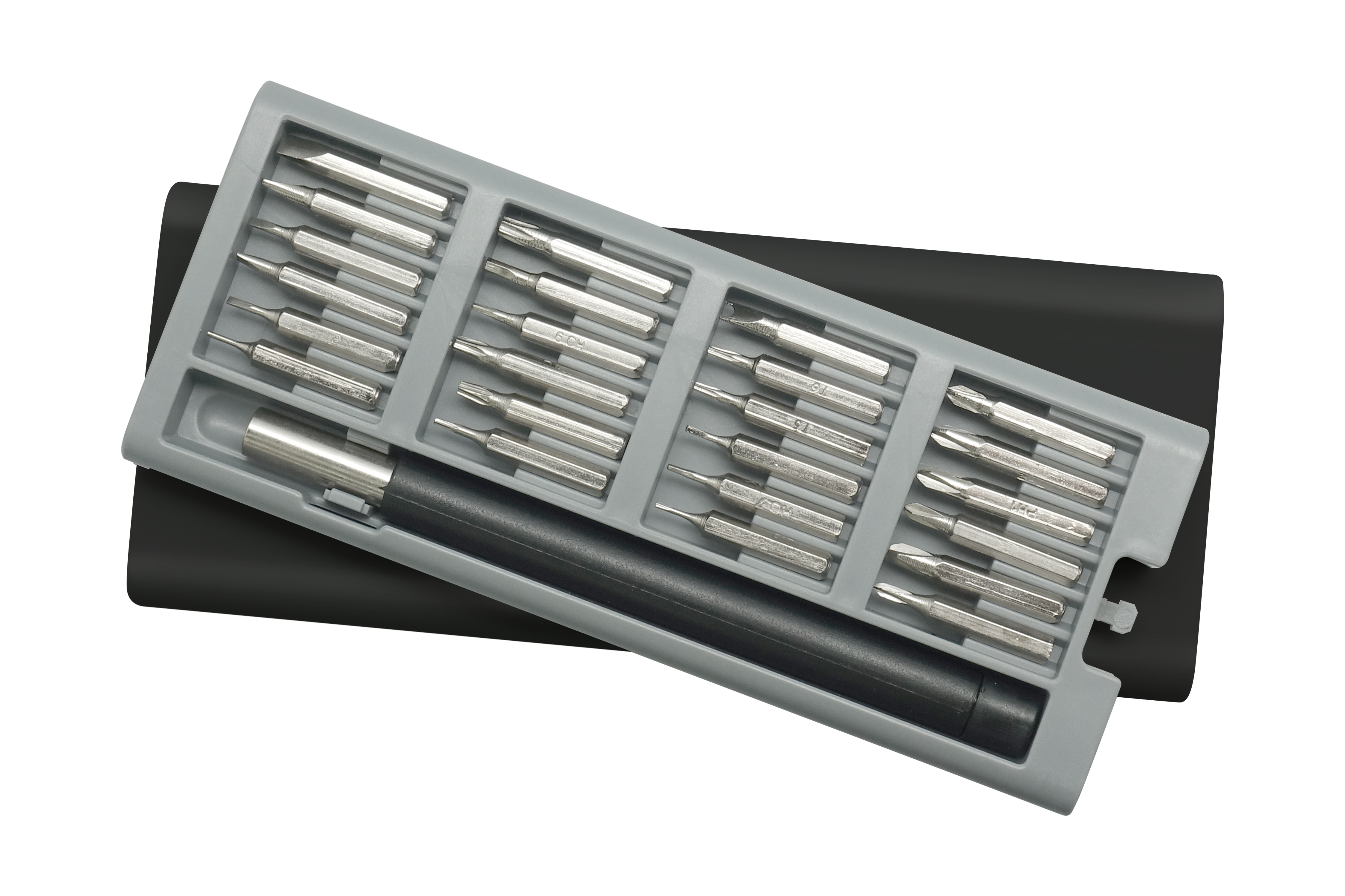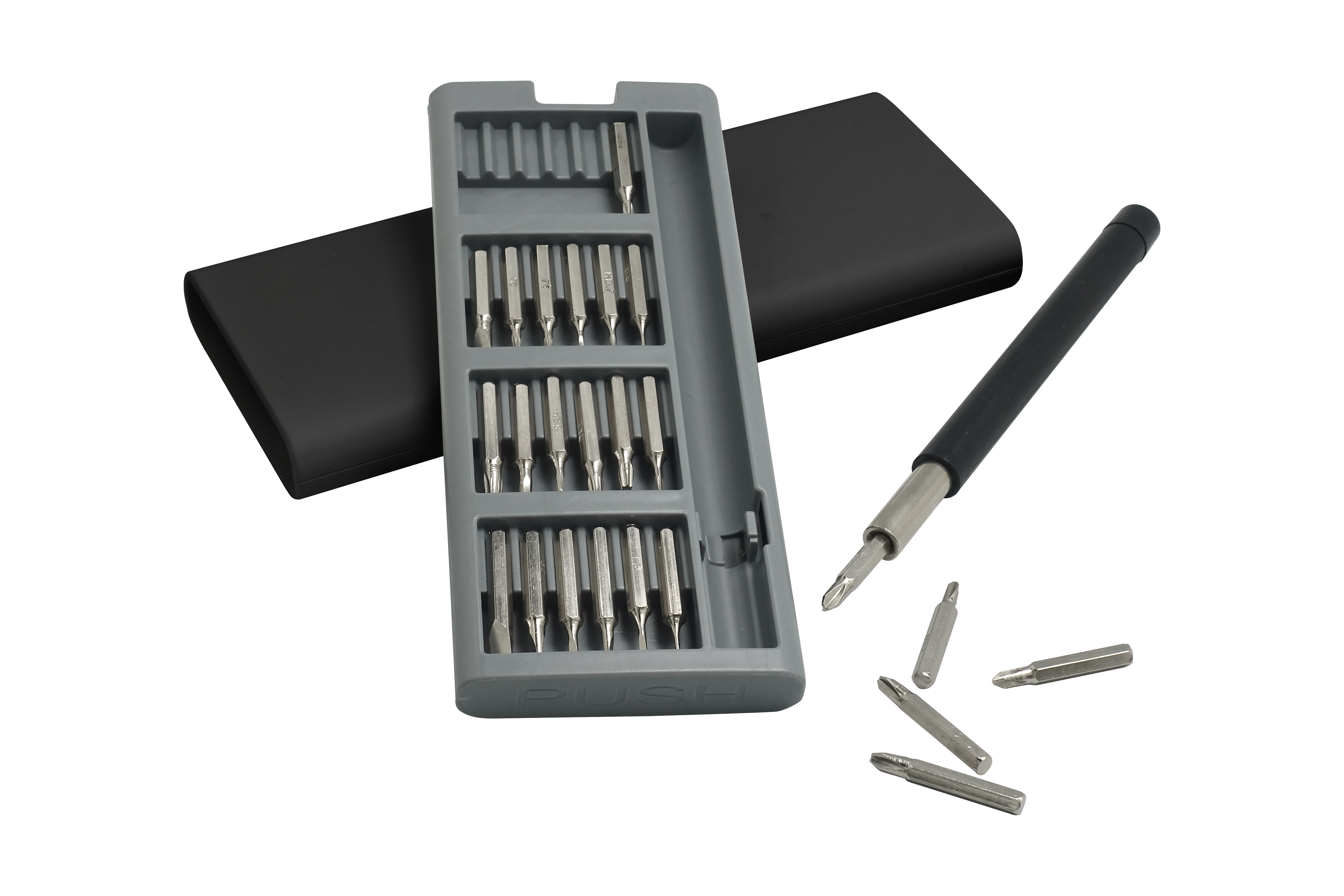 16,5 x 6,8 x 1,8 cm. Plástico y Acero. Mango con punta imantada con 24 puntas diferentes. La caja viene con cuatro compartimentos imantado que permite mantener ordenadas las diferentes puntas. La caja contiene apertura push.