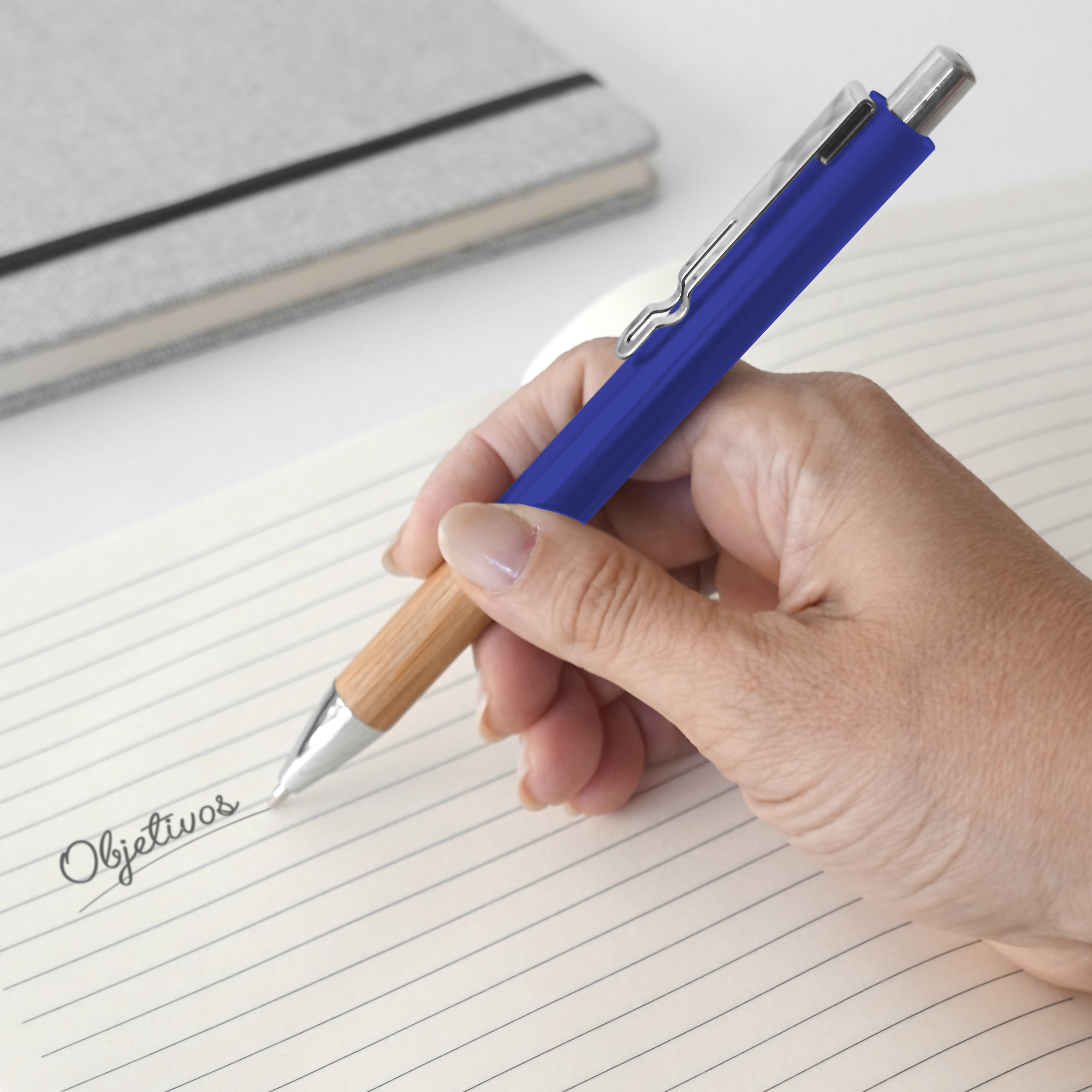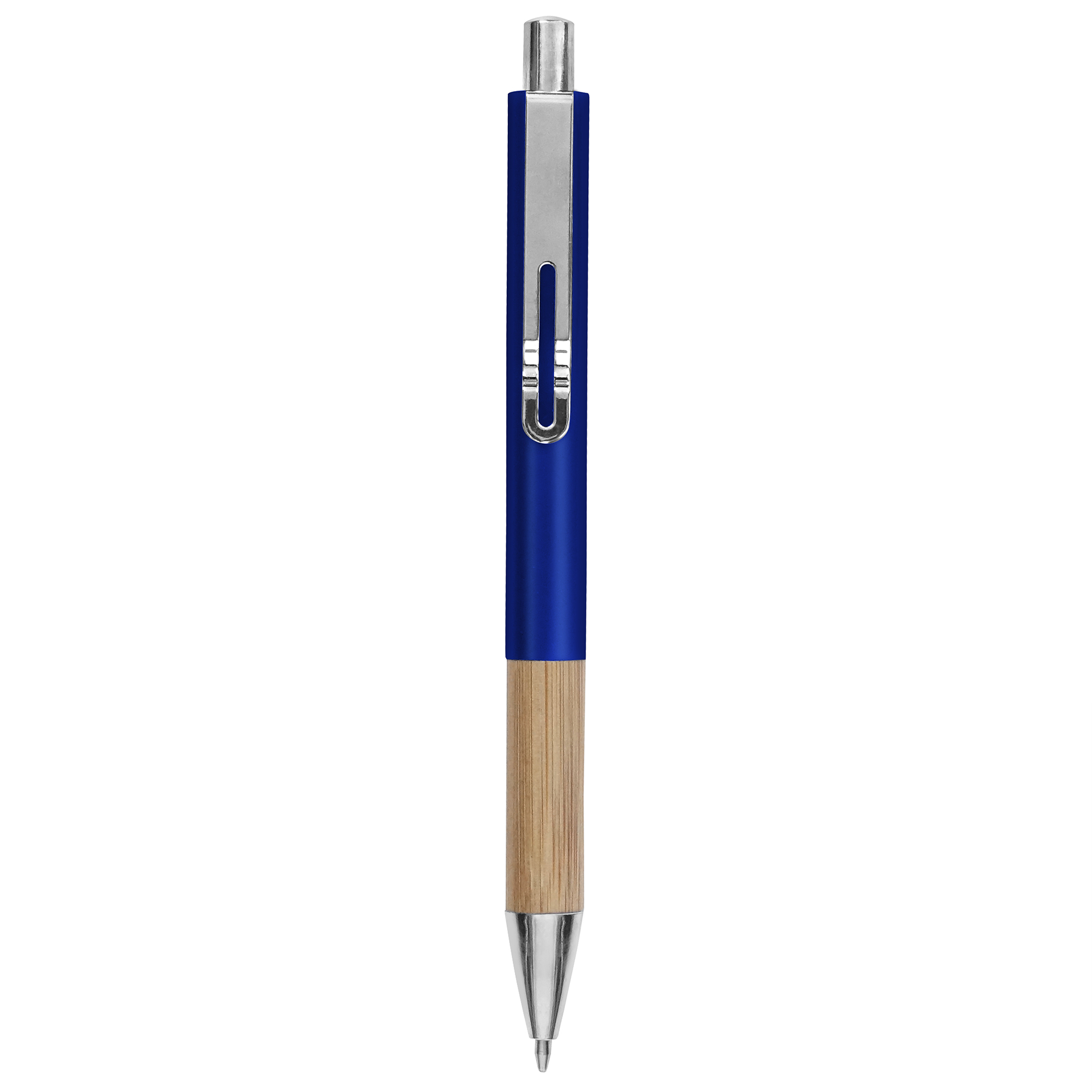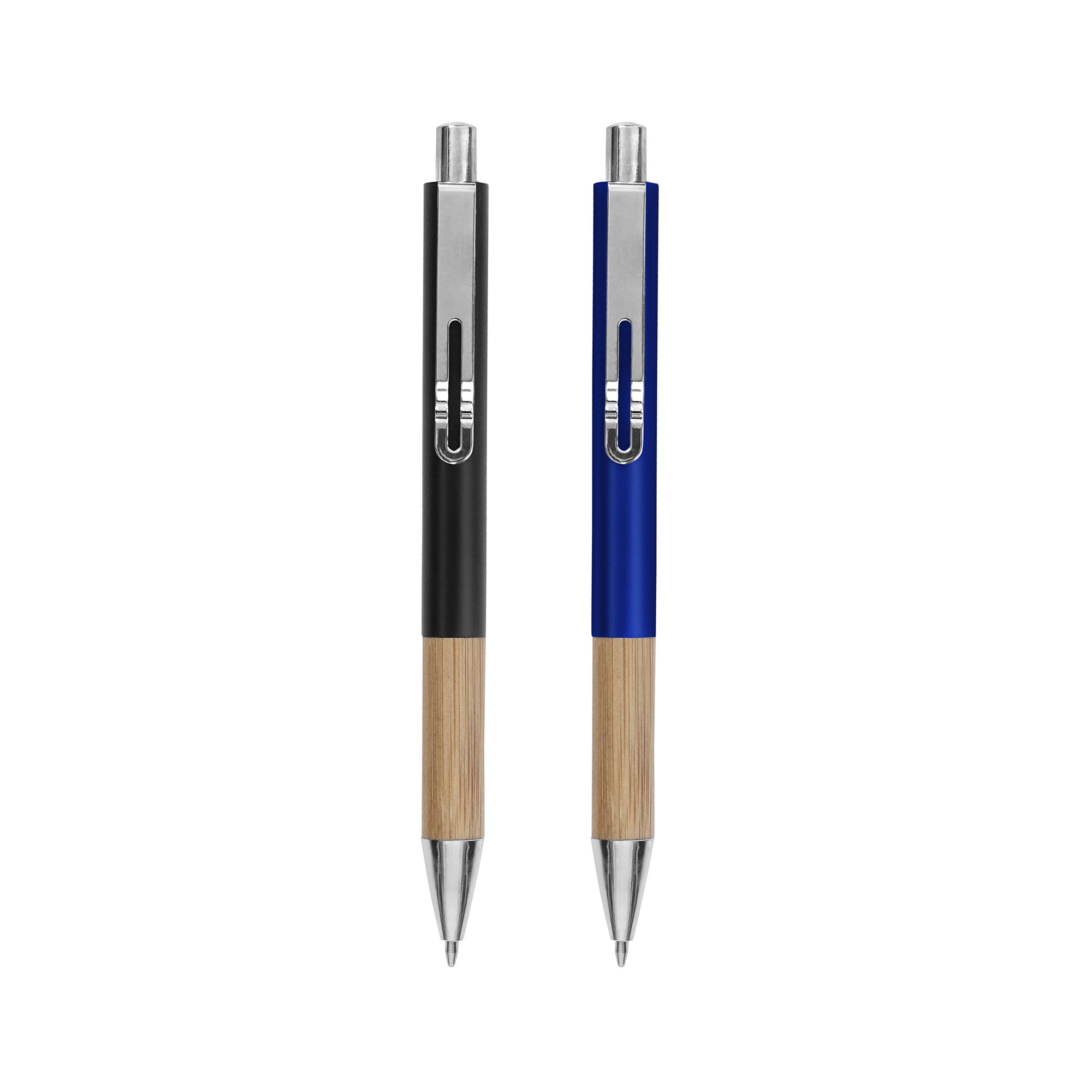 Metal. Cuerpo de aluminio en diferentes colores. Grip de bambú. Clip metálico. Pulsador y puntera plásticas color plata. Tinta negra. Decape color plata.