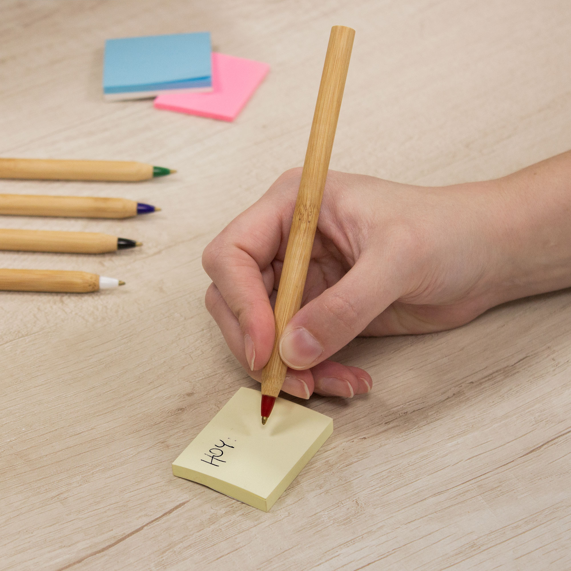Bolígrafo con cuerpo de bambú y punta plástica de diferentes colores. Tinta Negra.