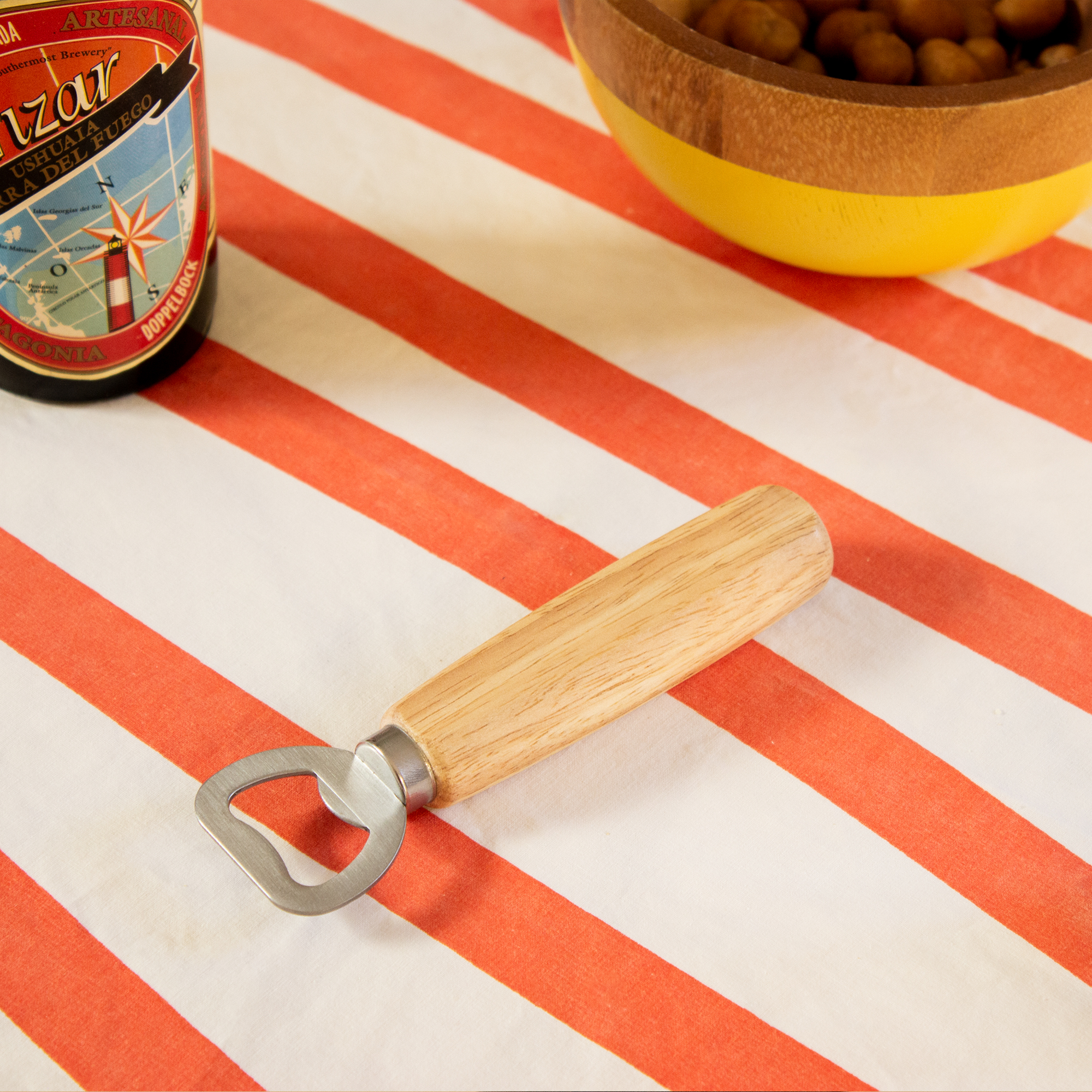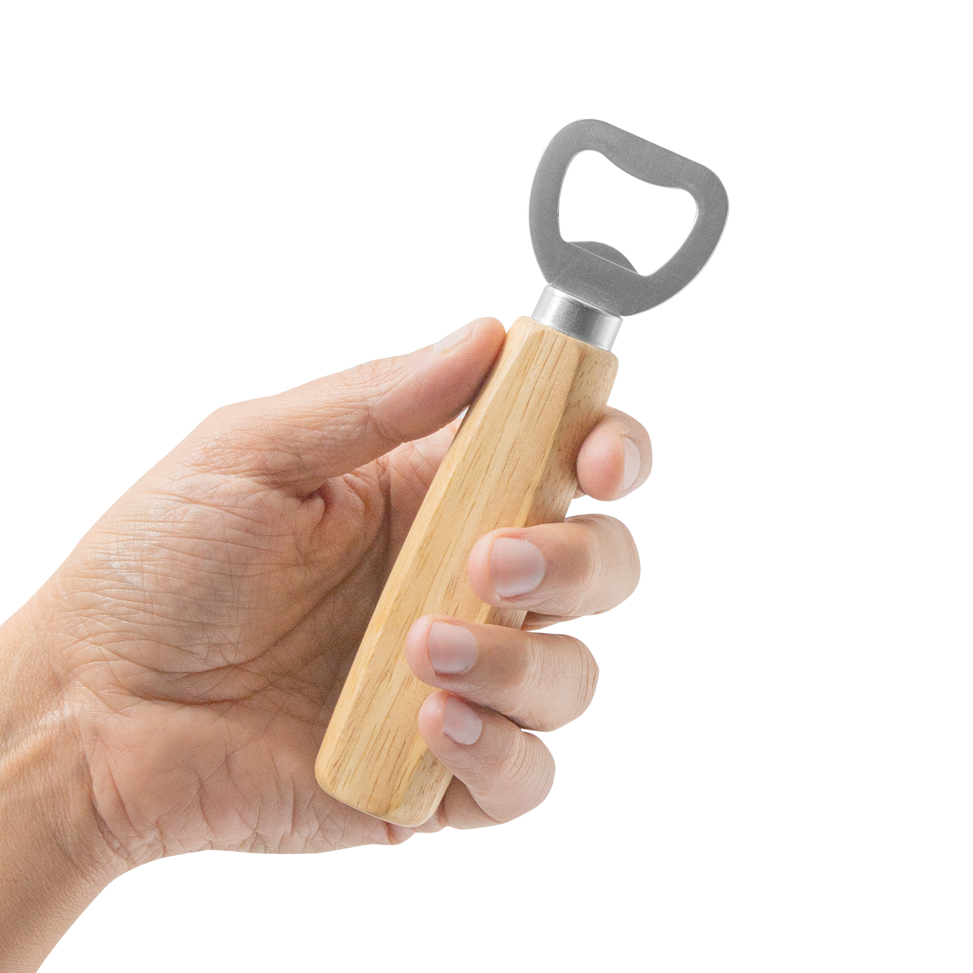 14,2 x 4 x 2 cm. Acero inoxidable 420 + Madera. Peso 45g. Destapador con mango de madera barnizada. Presentación en caja de regalo kraft.