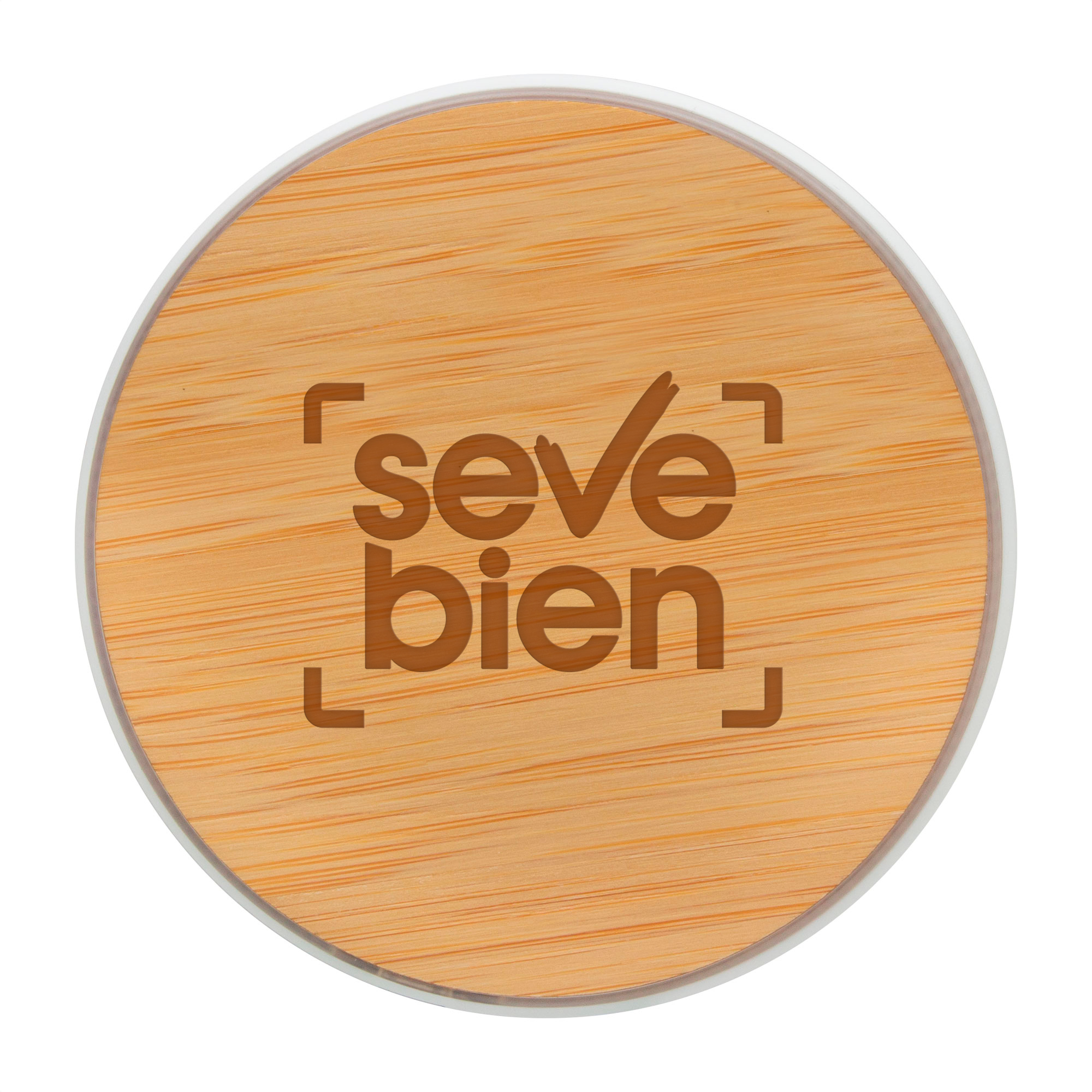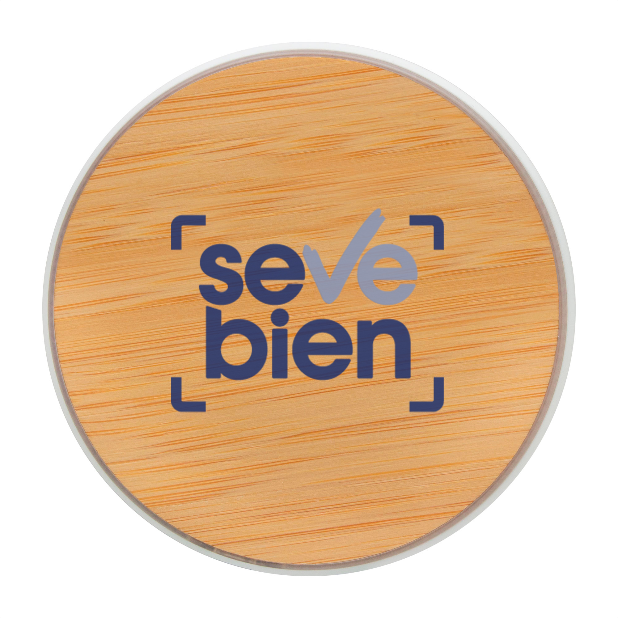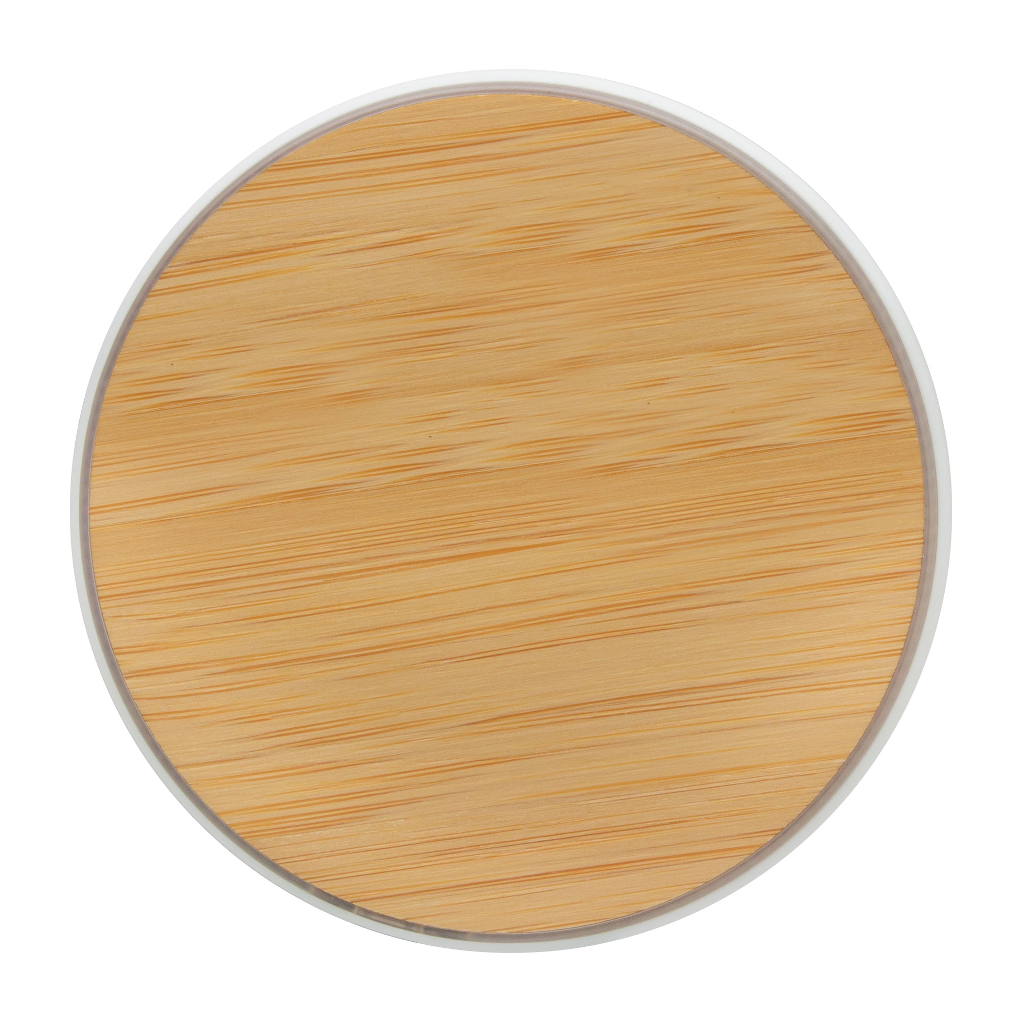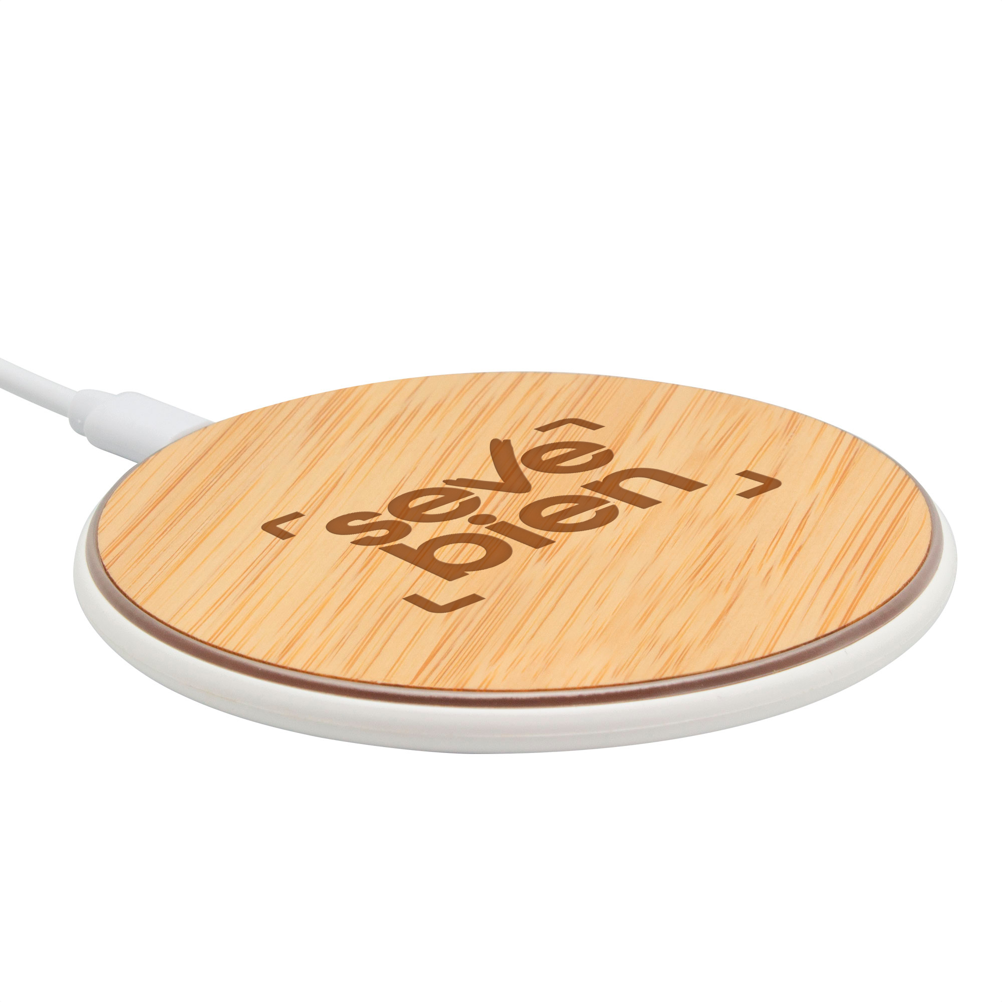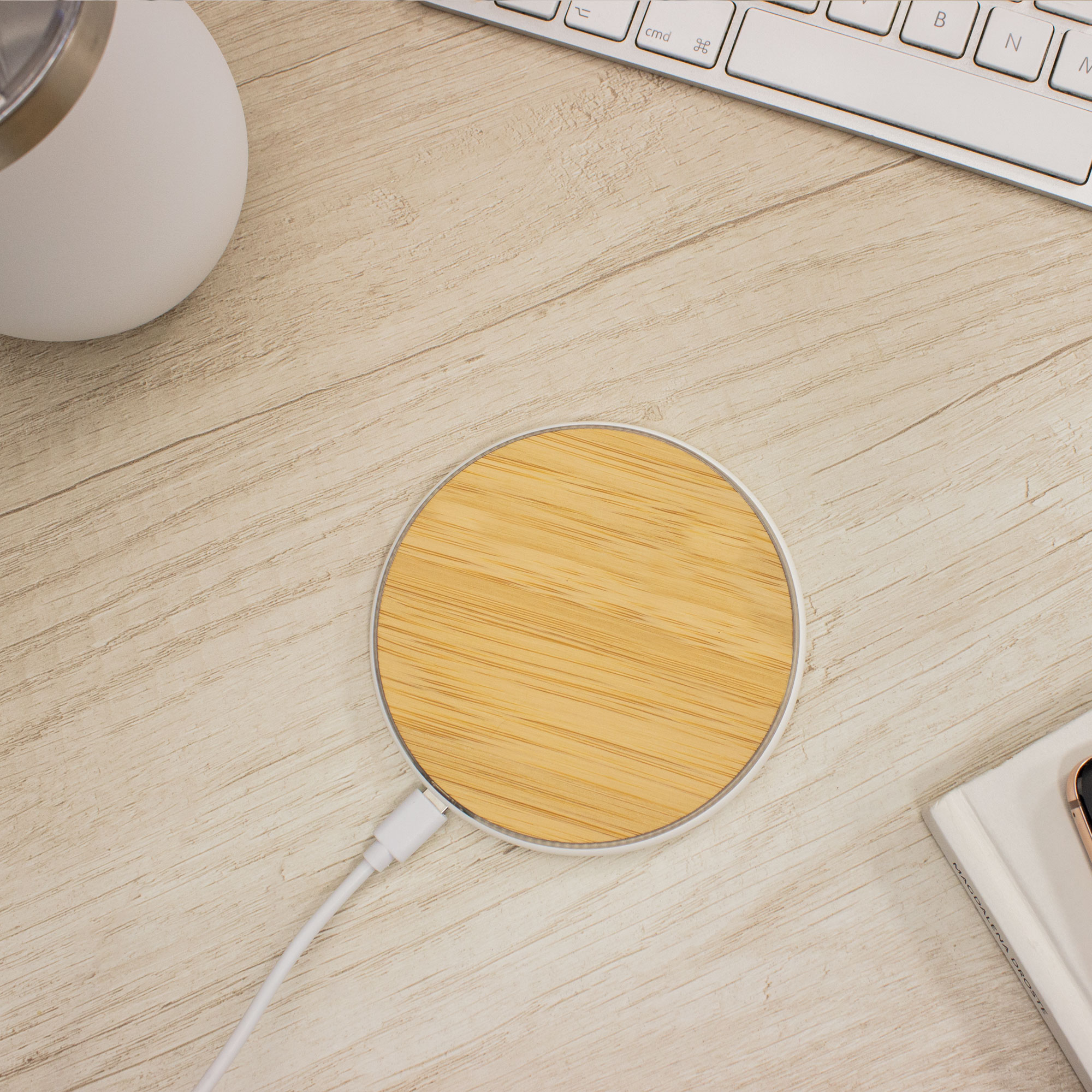 Ø 10 x 0,9 cm. Bambú + Plástico ABS. Cargador inalámbrico. Base plástica color blanco con antideslizantes. Entrada: 5V/2A, 9V/1.1A. Salida: 10 watts. Distancia de transmisión: <=8 mm. Eficiencia de Carga: >=73%. Control de temperatura. Detección de objetos extraños. Luces indicadoras de carga. Cable de carga USB-C en color blanco de 50 cm de largo. Presentación en caja de regalo kraft.