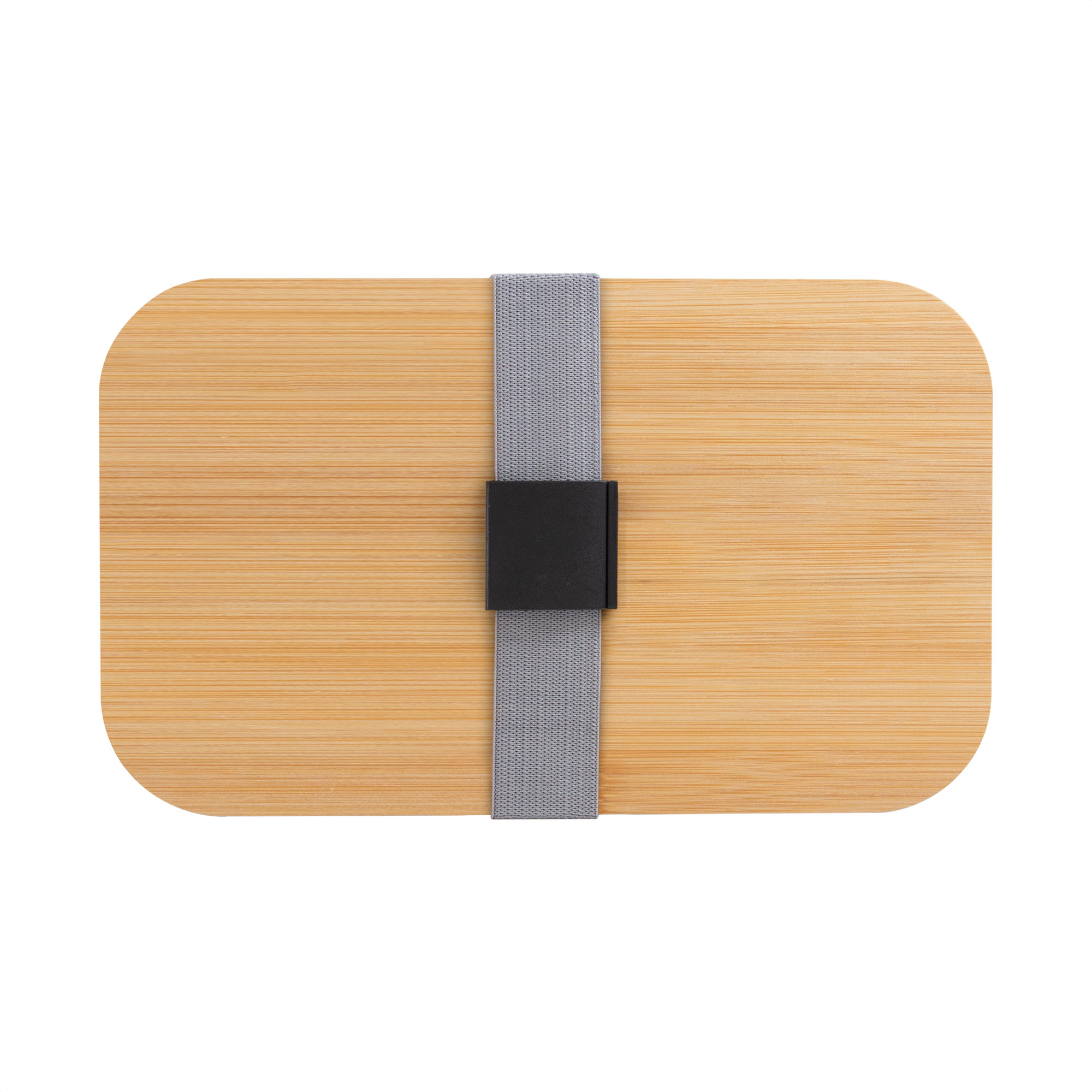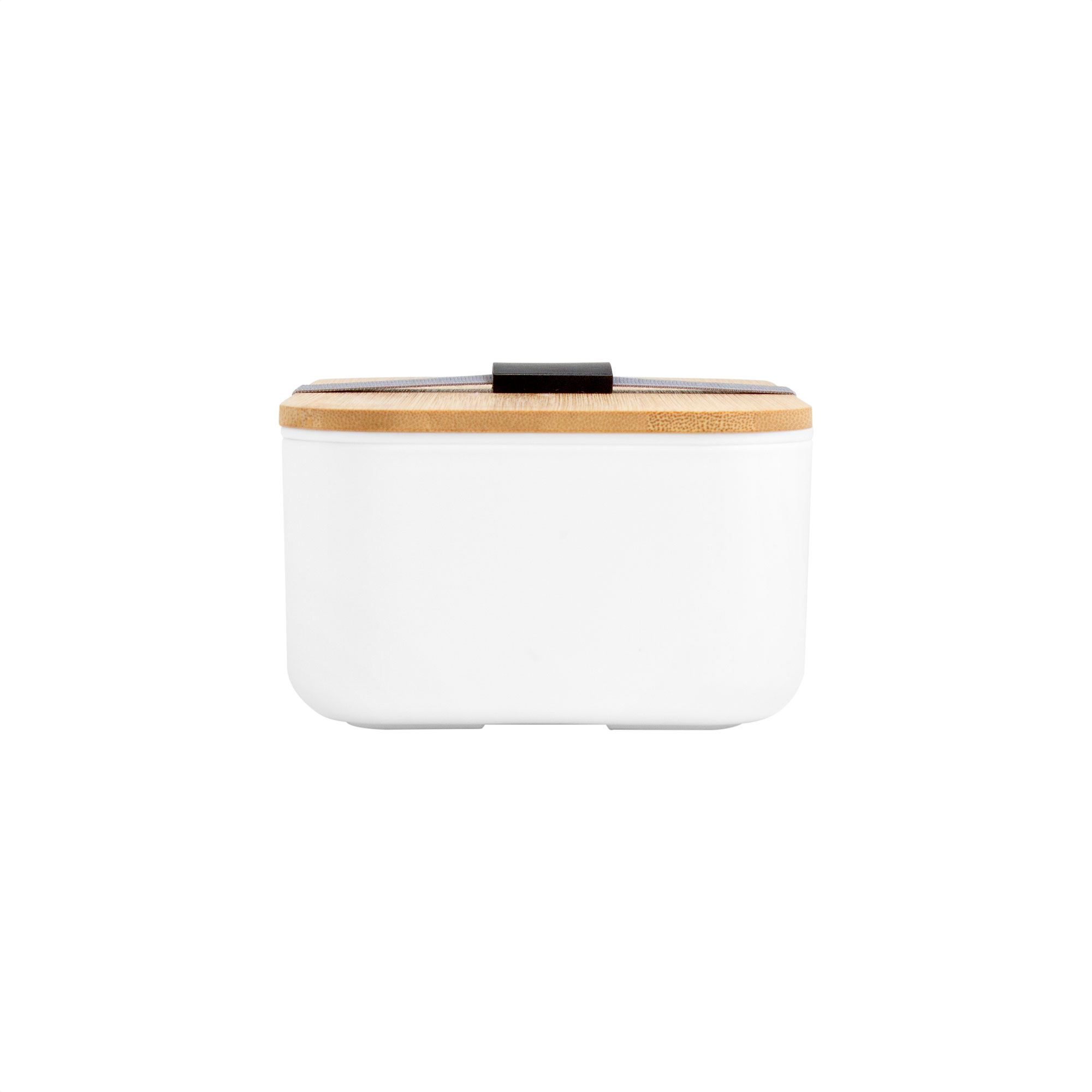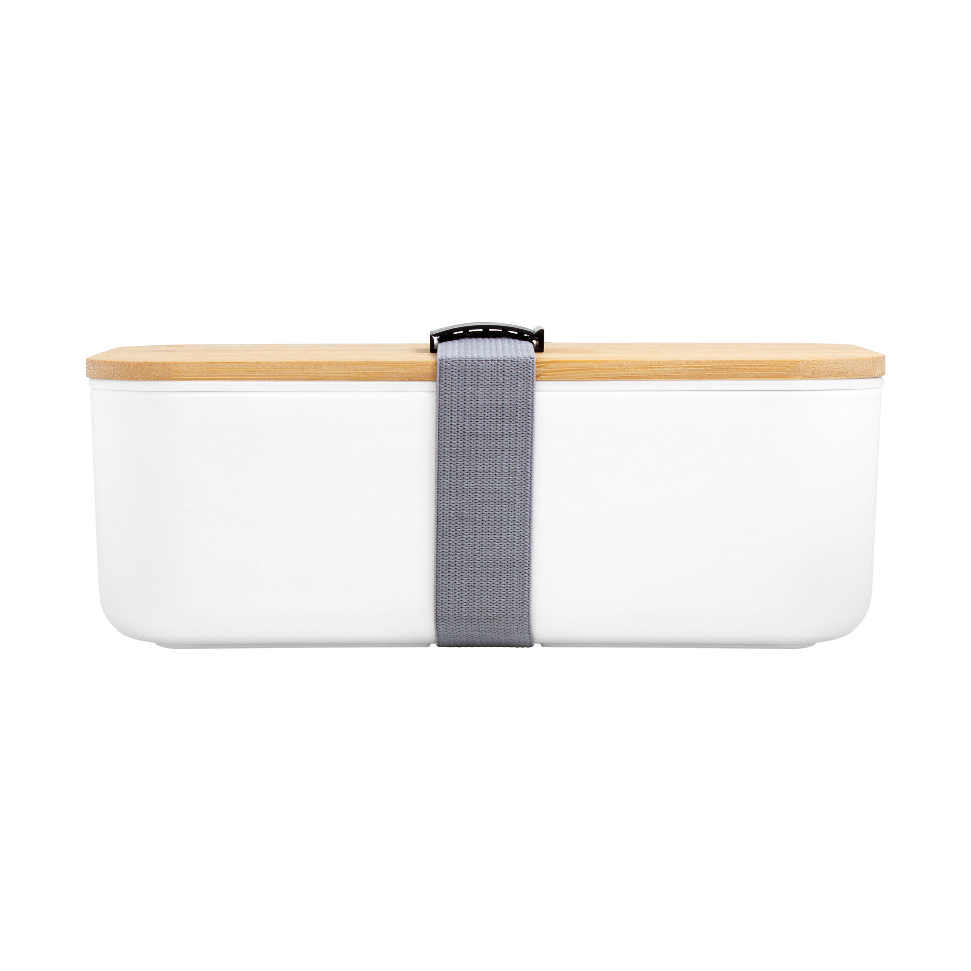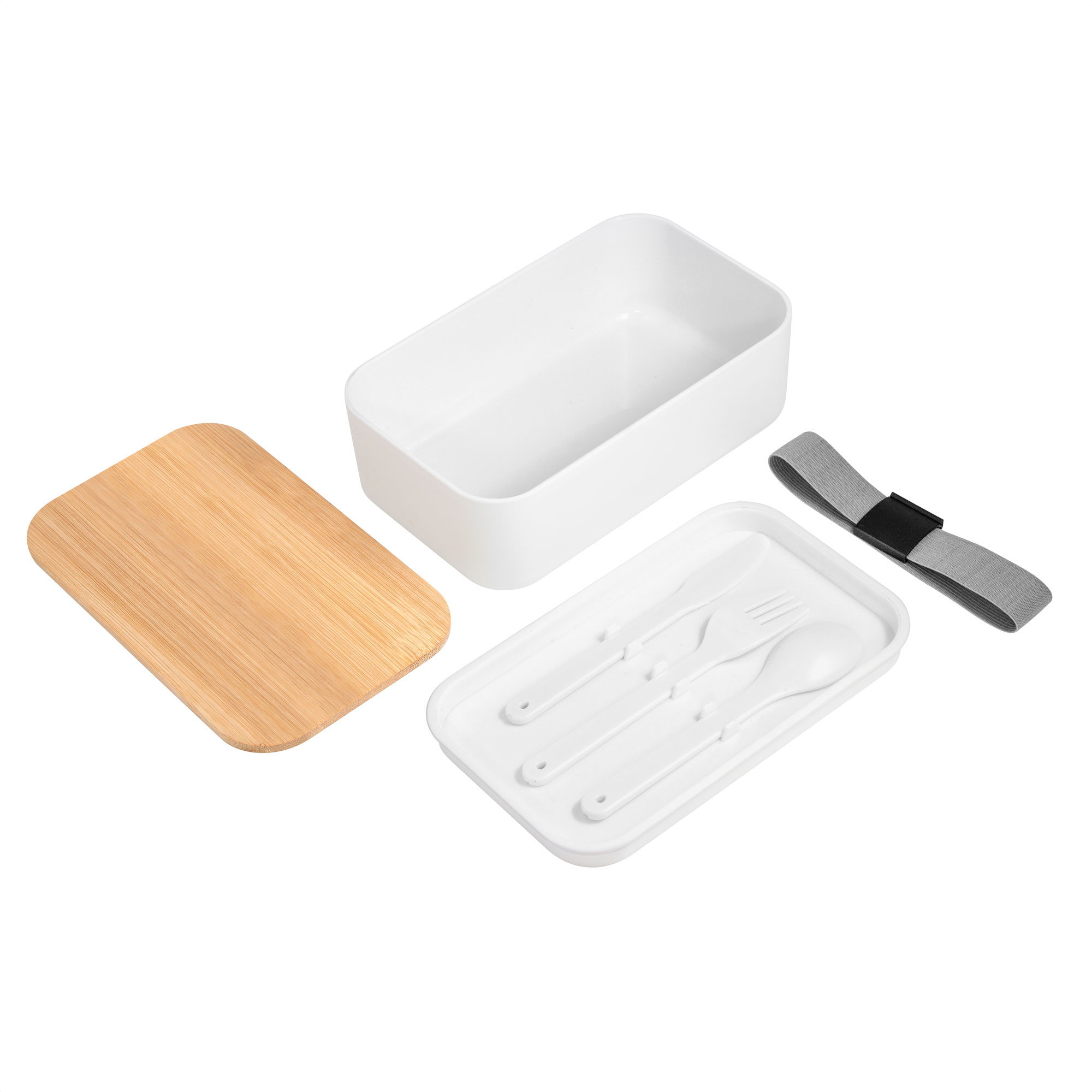 19,2 x 11,5 x 7 cm. Bambú + PP. Contenedor de alimentos con tapa de Bambú. Posee un compartimento plástico y bandeja porta set de 3 cubiertos (cuchillo, tenedor y cuchara). La tapa de bambú debe presionar firmemente la bandeja donde se fija el juego de cubiertos. Cierre con sujeción elástica color gris y hebilla plástica color negro. Producto apto para microondas (sin la tapa). Importante: solo se puede calentar la comida, NO sirve para cocinarla.