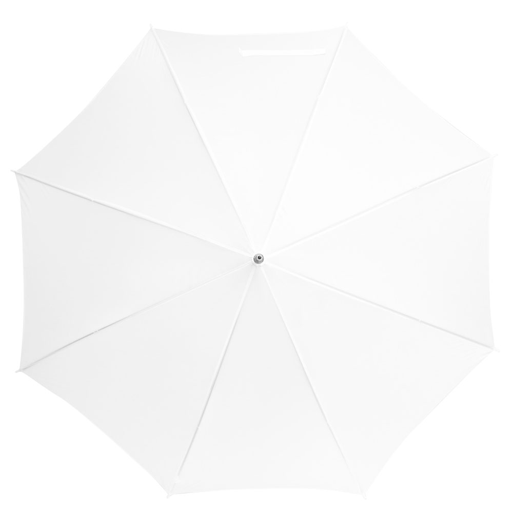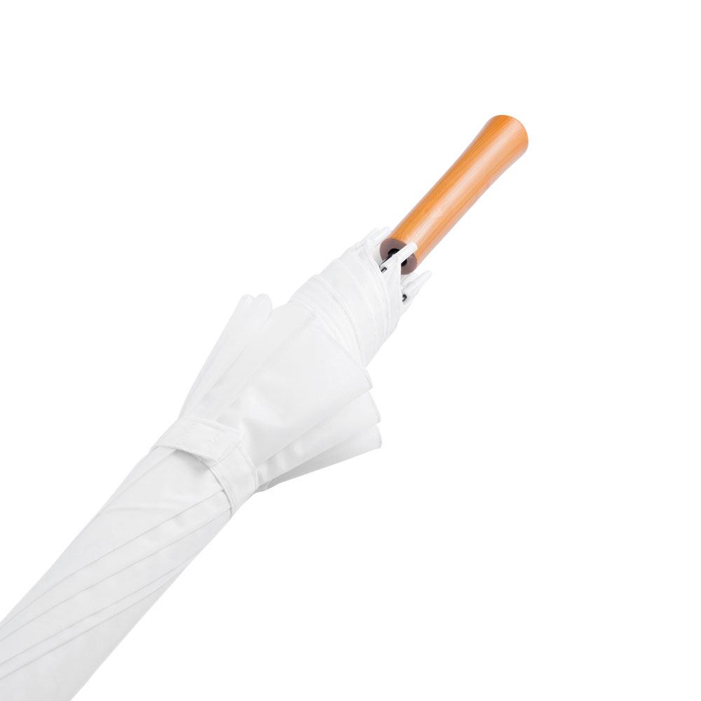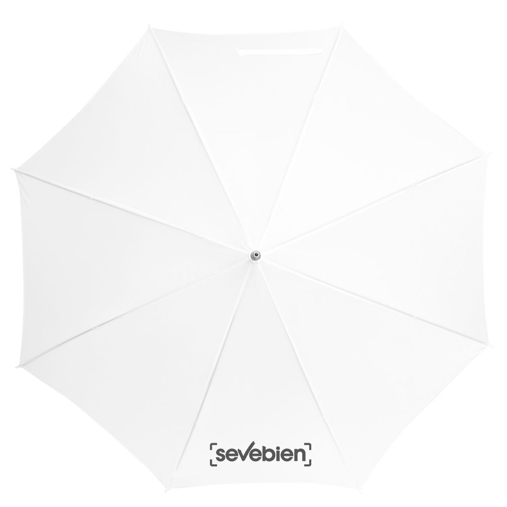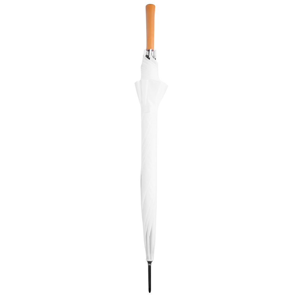 Ø 100 cm. 8 gajos. Ancho gajo 40 cm. Largo total 84 cm. Poliéster, metal y PVC. Paraguas APERTURA AUTOMÁTICA Y CIERRE MANUAL. Eje, varillas y punta metálicas y mango en PVC, símil madera. Botón a presión. Cierre con correa de velcro.