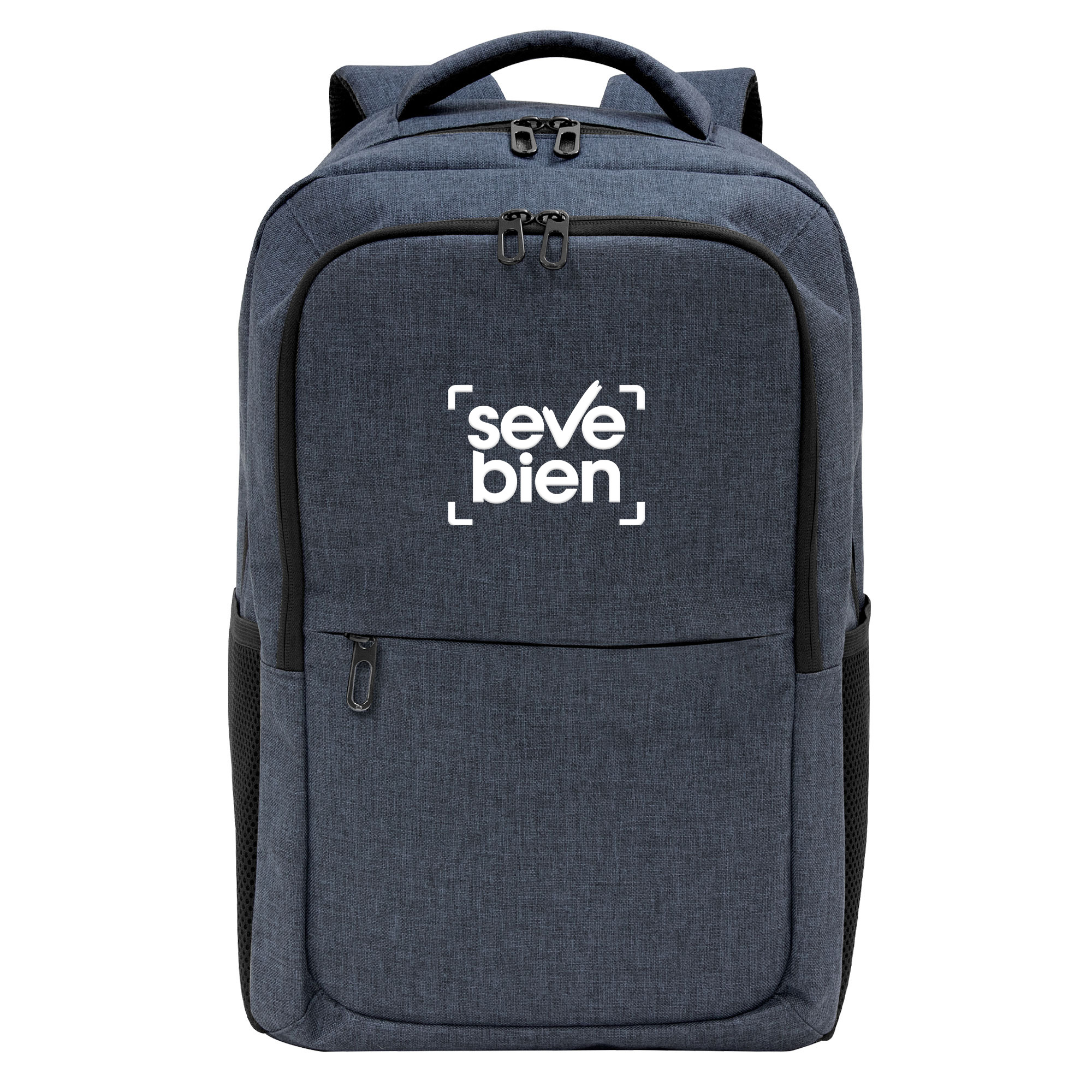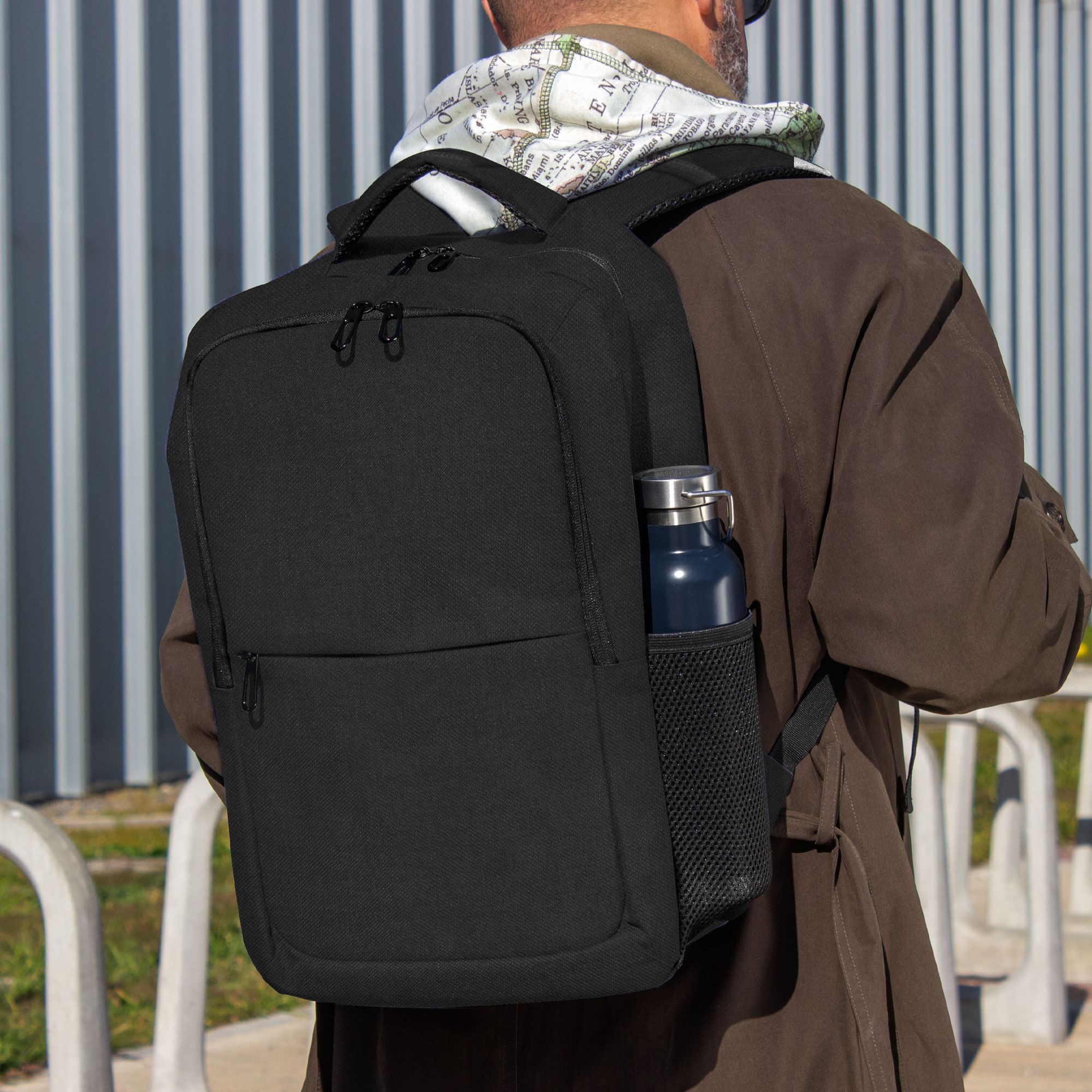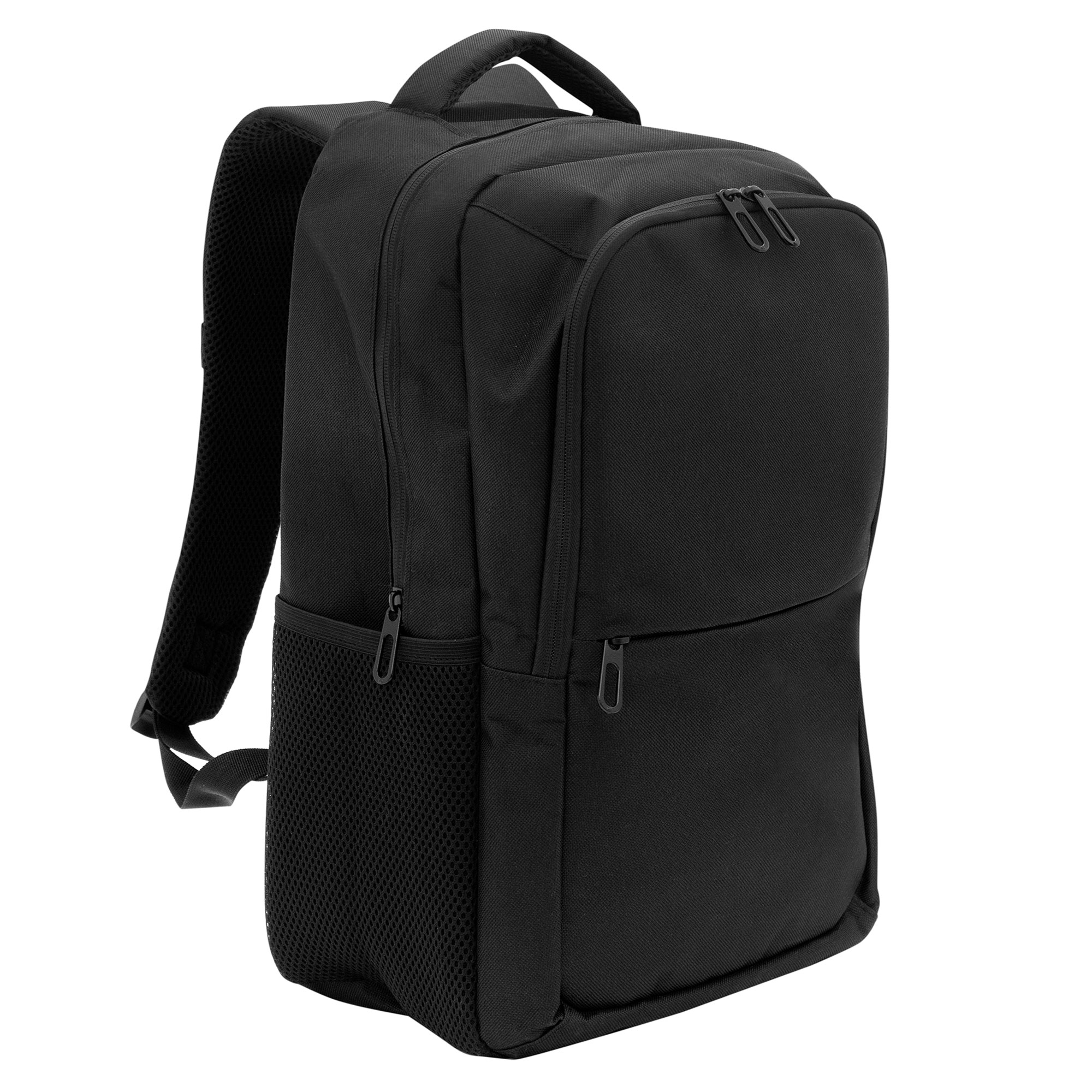 Capacidad 20 litros. Poliéster wulong 600D. Interior forrado impreso en 210D en color negro. Mochila portanotebook de hasta 16 pulgadas. Cuenta con dos compartimentos, el compartimento principal con bolsillo acolchado para la notebook y bolsillo organizador. frente con bolsillo horizontal con cierre y 2 bolsillos laterales de malla porta botellas y accesorios. Asa superior, correas y respaldo acolchados. Correas ajustables. Tira para sujetar la mochila en la manija extensible de un equipaje de mano. Tiradores de cierres metálicos color negro.