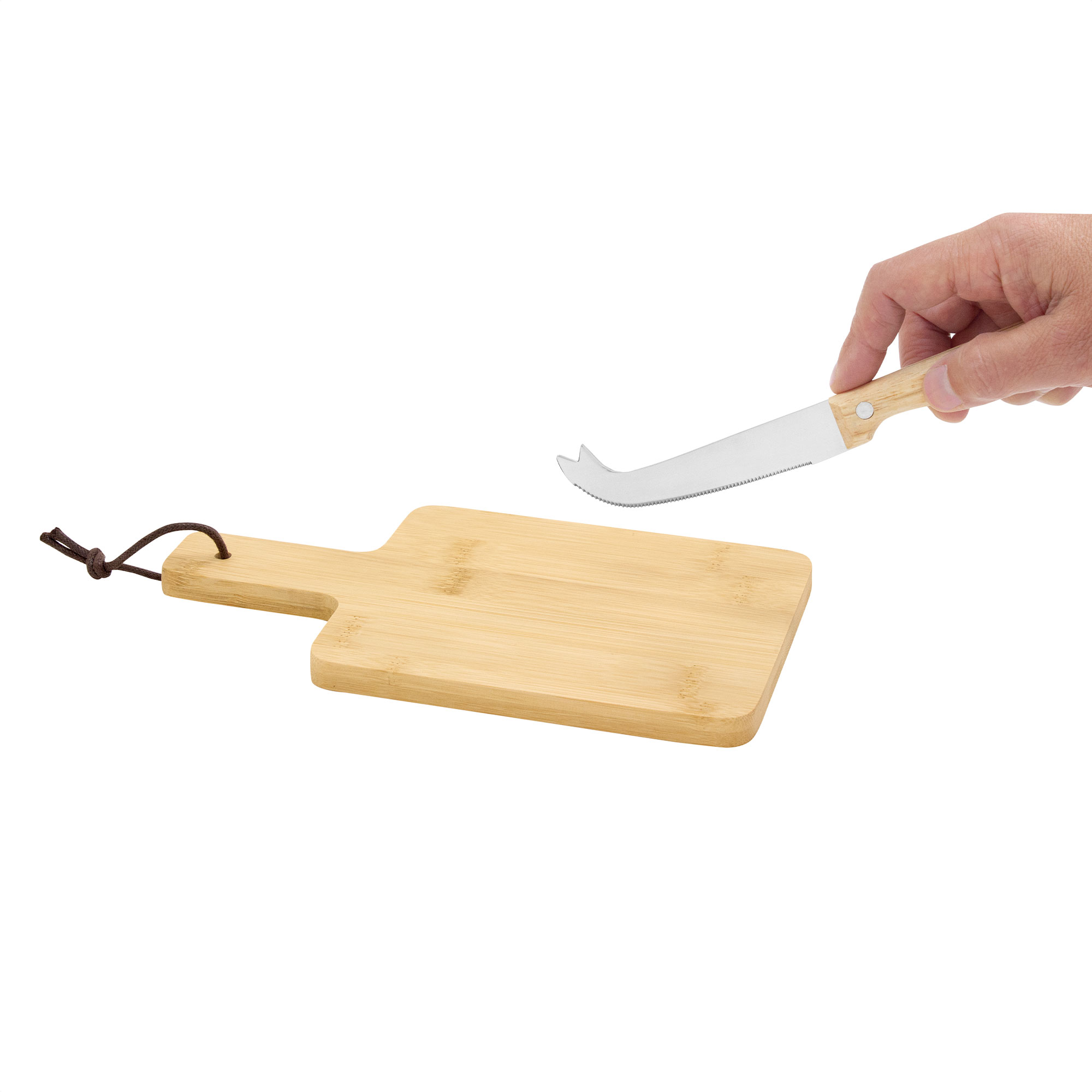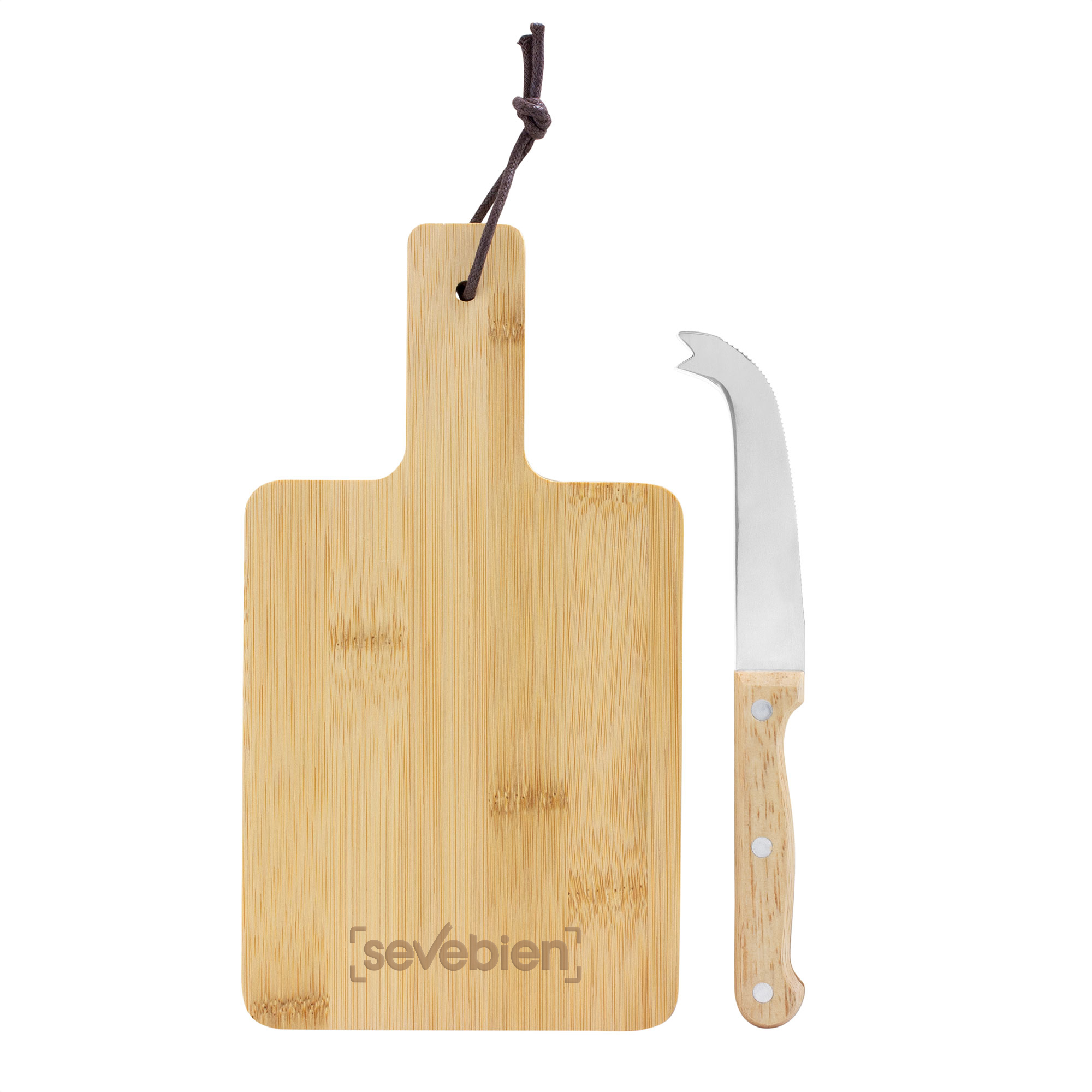 Bambú + Acero inoxidable. Set de tabla de corte para quesos y cuchillo. Tabla con recubrimiento de aceite vegetal y correa en el mango. Cuchillo de 19,5 cm de largo, de acero inoxidable 420 y mango de madera . Presentación en caja de regalo kraft.