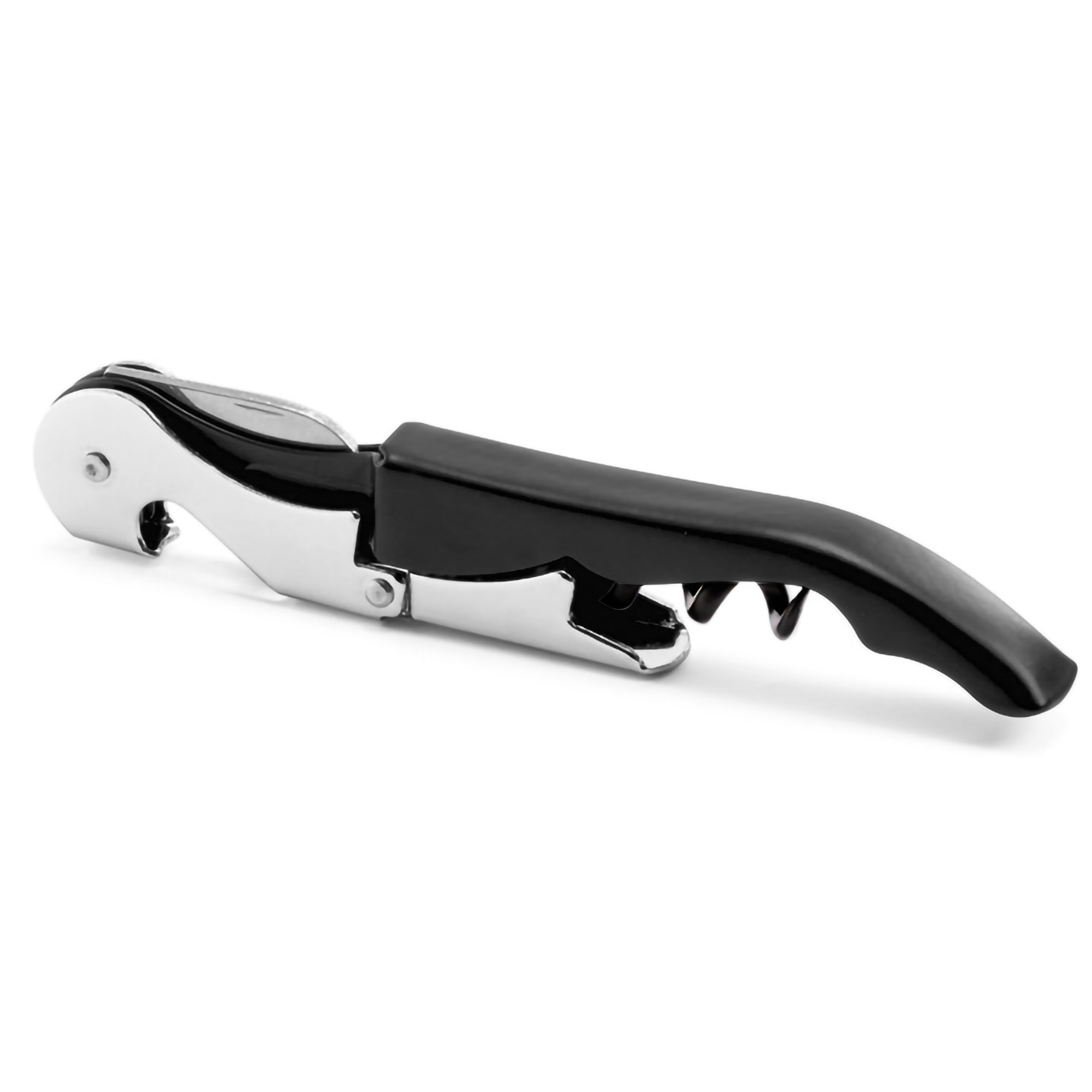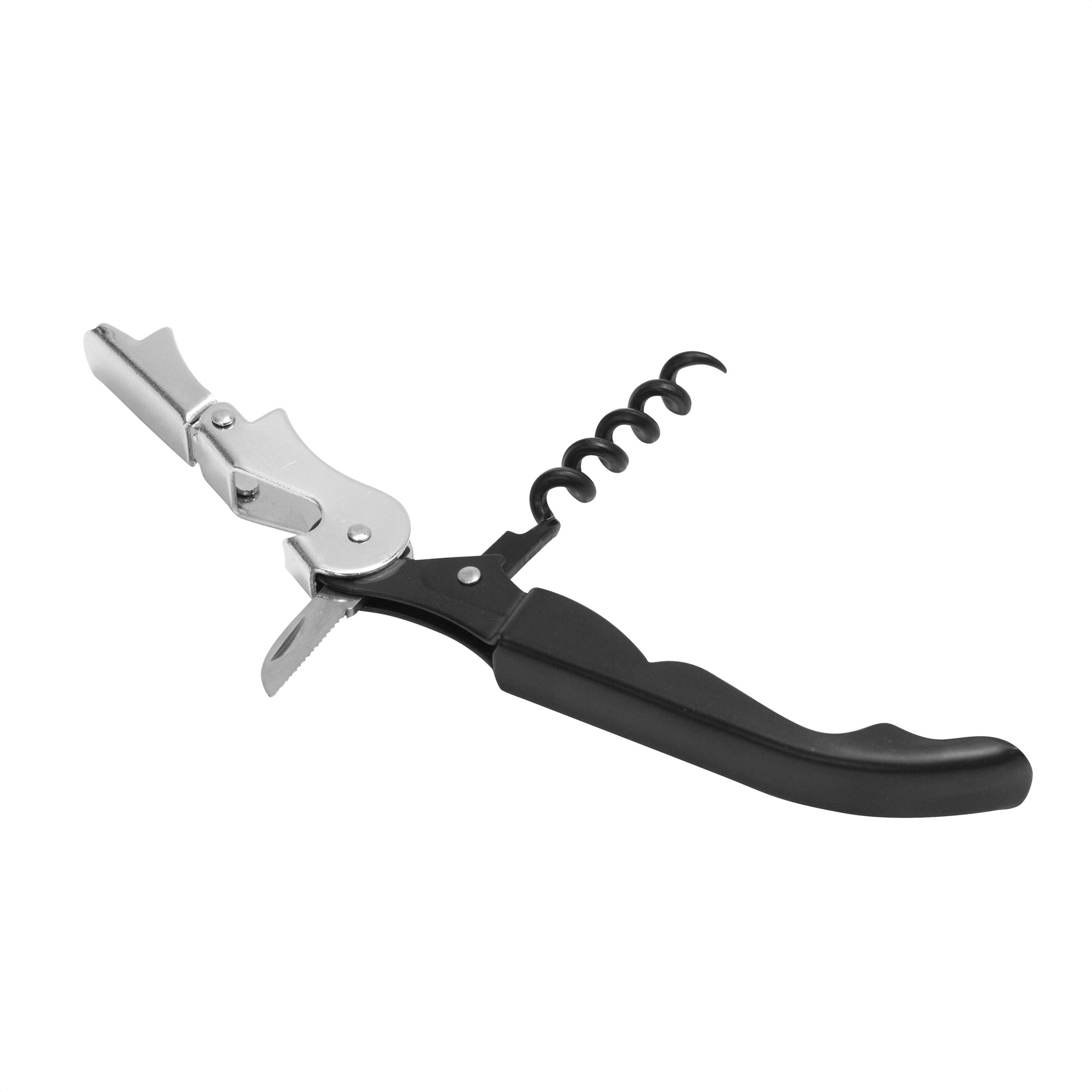 Capacidad 350 ml. cada copa. Vidrio + Acero inoxidable. Set de 2 copas para vino y sacacorchos. Abridor de botellas en acero inoxidable 430 + acero cromado con acabado negro mate. Incluye espuma protectora donde encajan las piezas para su guardado y traslado. Presentación en caja de regalo kraft.