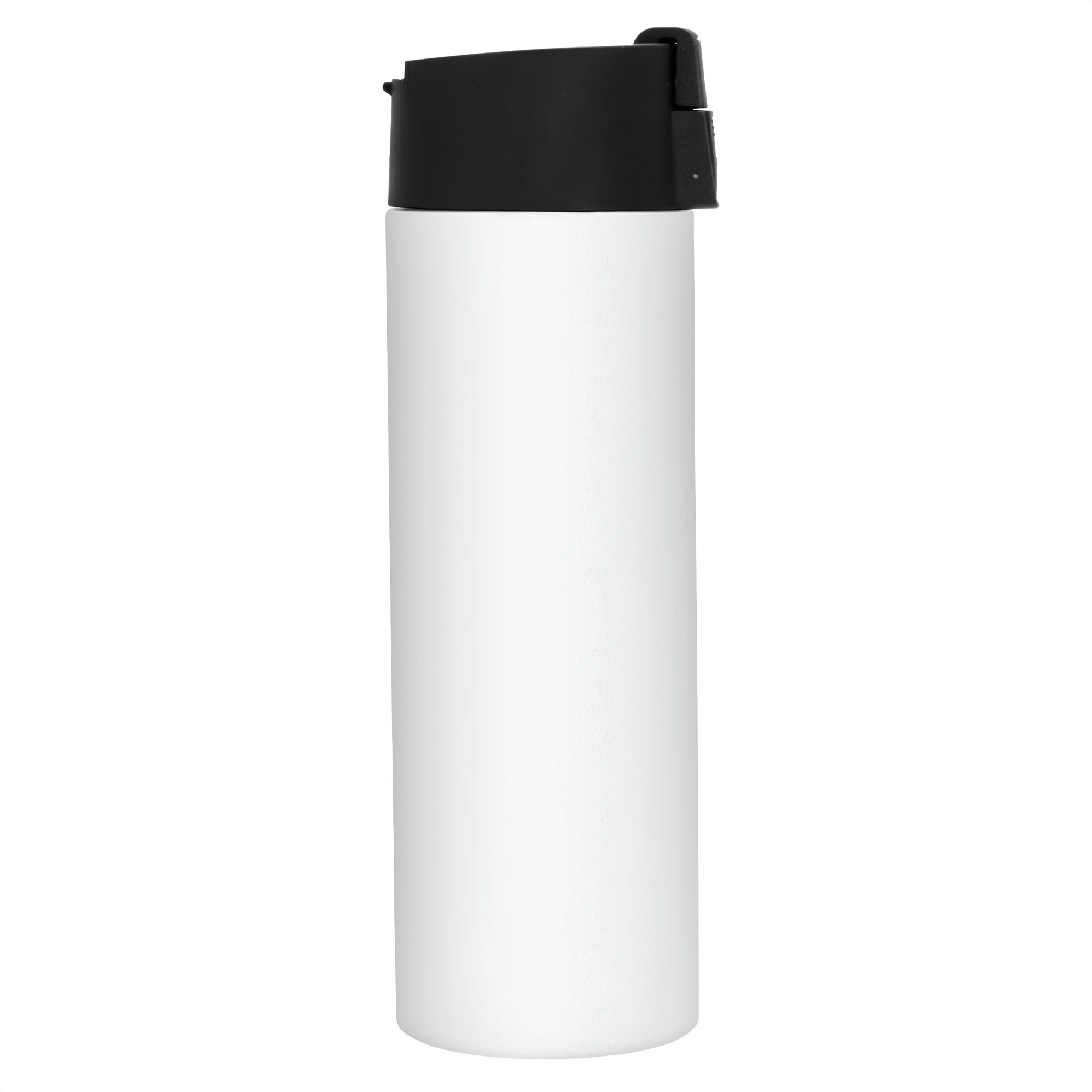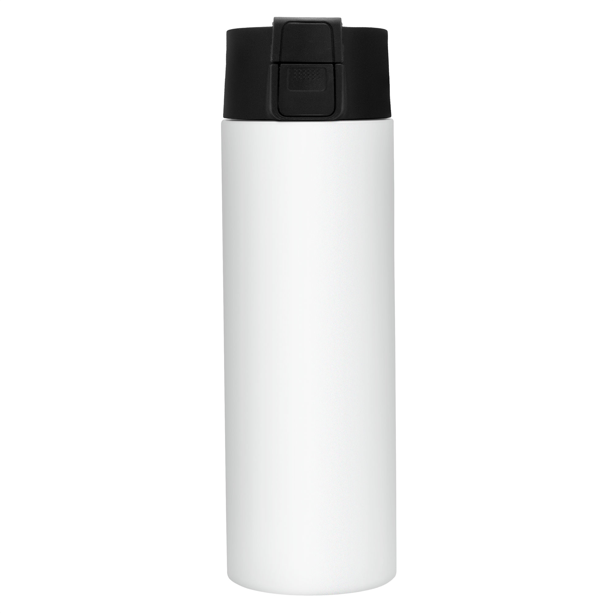 Acero inoxidable. Capacidad 450 ml. Botella con aislamiento térmico vacuum. Interior de acero 304 y exterior de acero 201. Pintura color blanco brillante apta para sublimado. Tapa en PP con traba de seguridad y botón pulsador de apertura. Mantiene por más de 12 hs la temperatura de las bebidas calientes y 24 hs de las bebidas frías. Presentación en caja de regalo kraft.