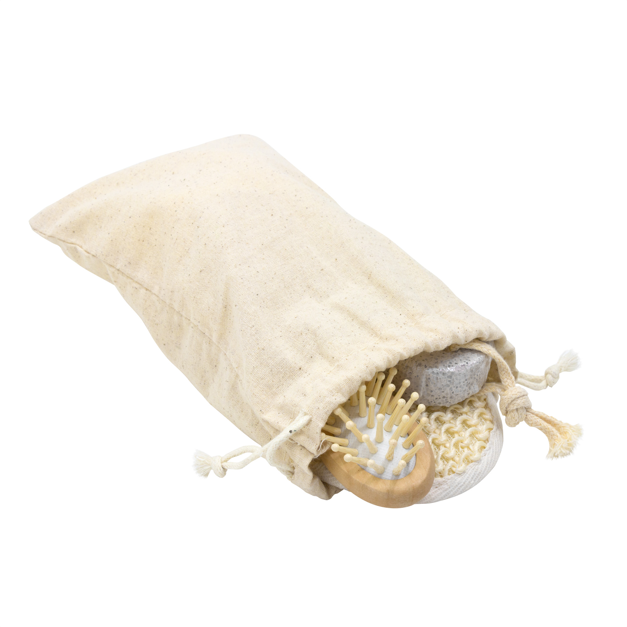 Lujo en tu rutina.Set de baño / Spa. Incluye: 5 accesorios de belleza y limpieza. Espejo de bambú (Ø 7,2 x 0,8 cm.); Cepillo de madera (12,5 x 3,7 x 3,5 cm.); Piedra pómez con cordón de algodón (9,5 x 4,5 x 2cm.); Esponja bola de red con cordón de poliéster (Ø 9 cm.); Esponja de mano con elástico, recubierta en algodón y tejido exfoliante (14,7 x 9,7cm.). Medidas: 14,5 x 20 cm. Materiales: Algodón, Bambú, TPE, Madera y PE. Presentación: El set se entrega en bolsa contenedora con cordón de algodón y bolsa de polietileno para su protección.