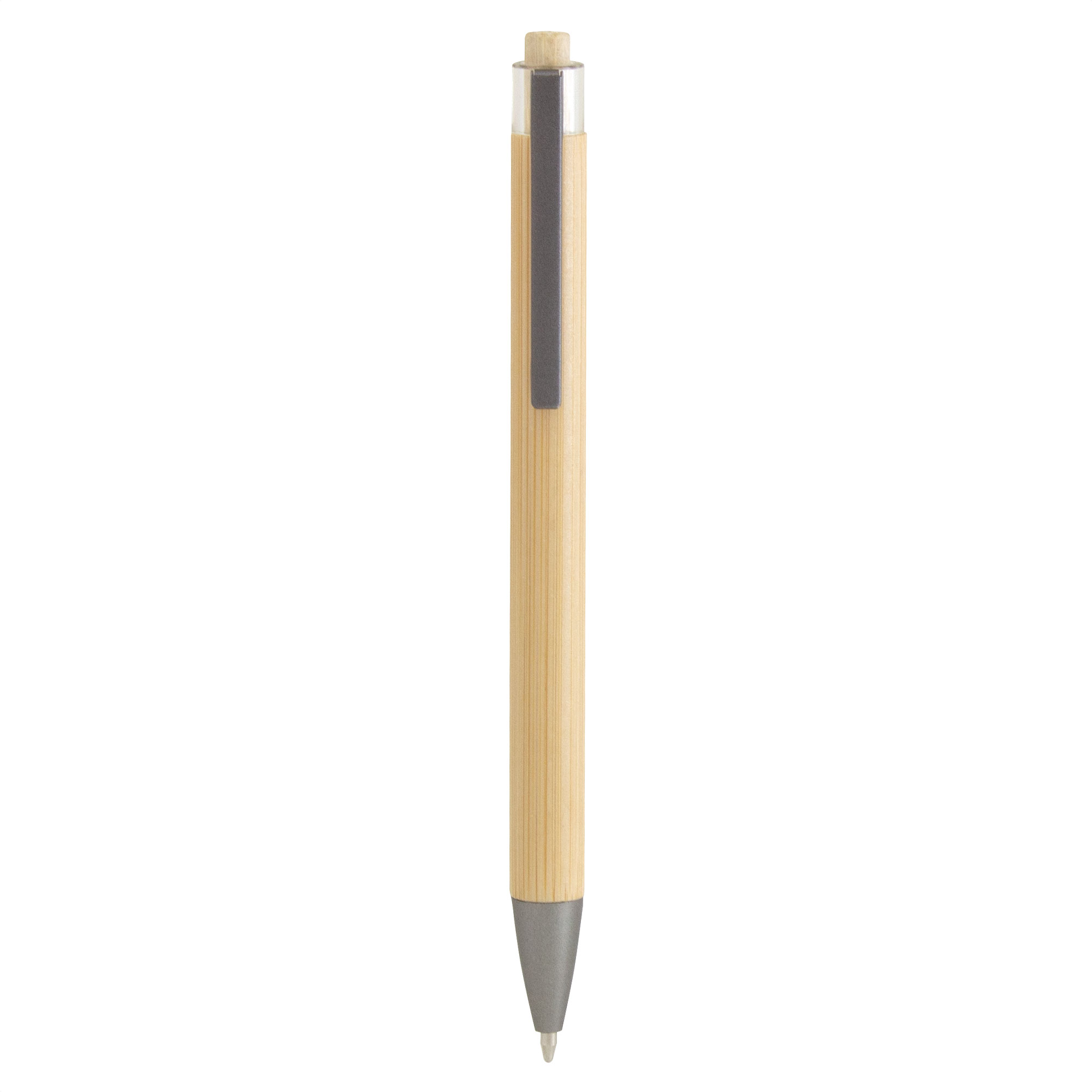 Sostenible y sofisticado.Bolígrafo retráctil. Cuerpo y botón pulsador de bambú. Clip metálico y puntera plástica en color gris gun. Medidas: 1 x 14,1 cm. Materiales: Bambú, plástico ABS y acero. Peso: 7,6 g. Tinta: negra.
