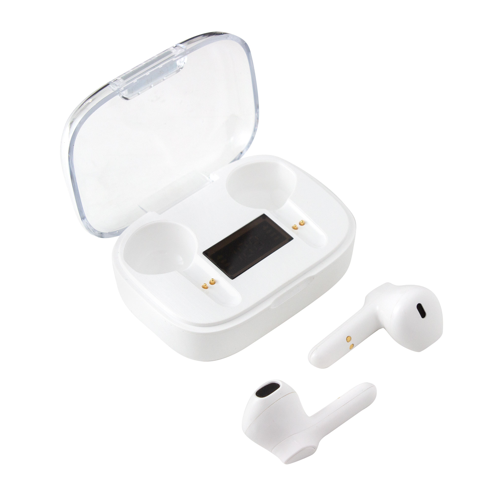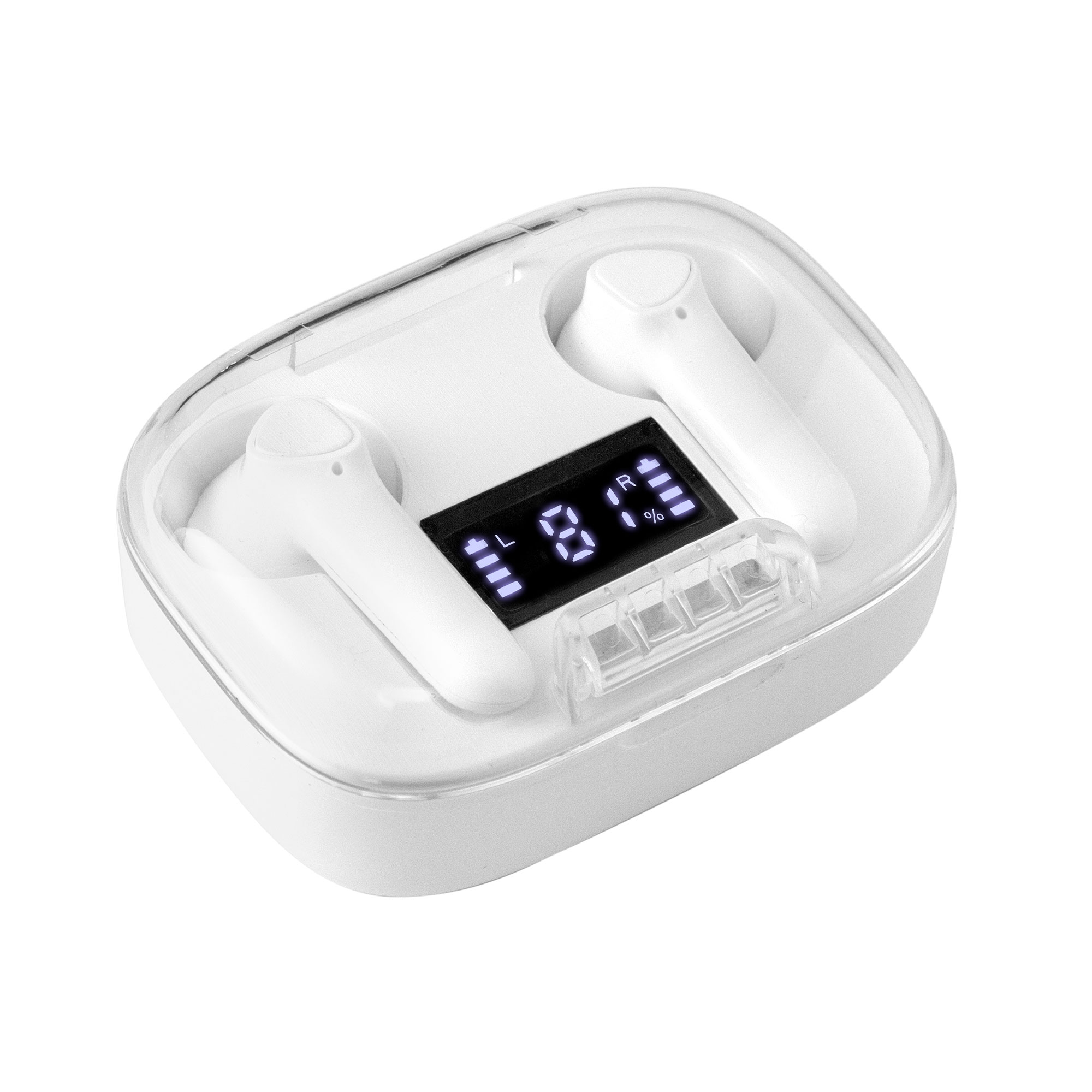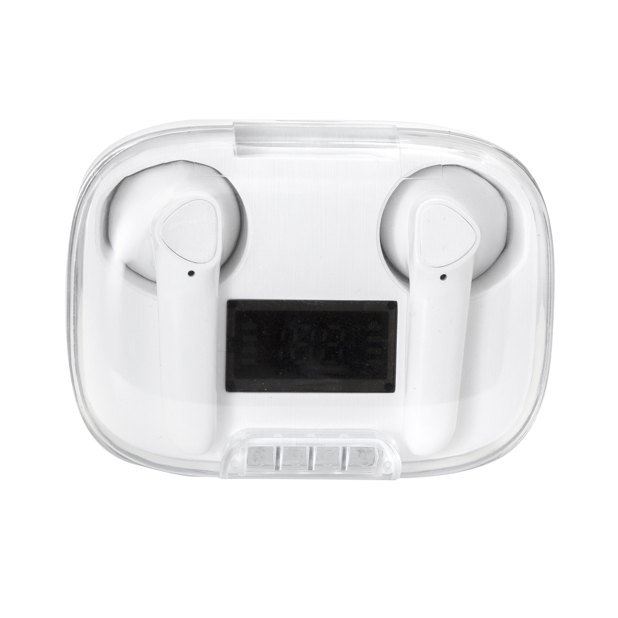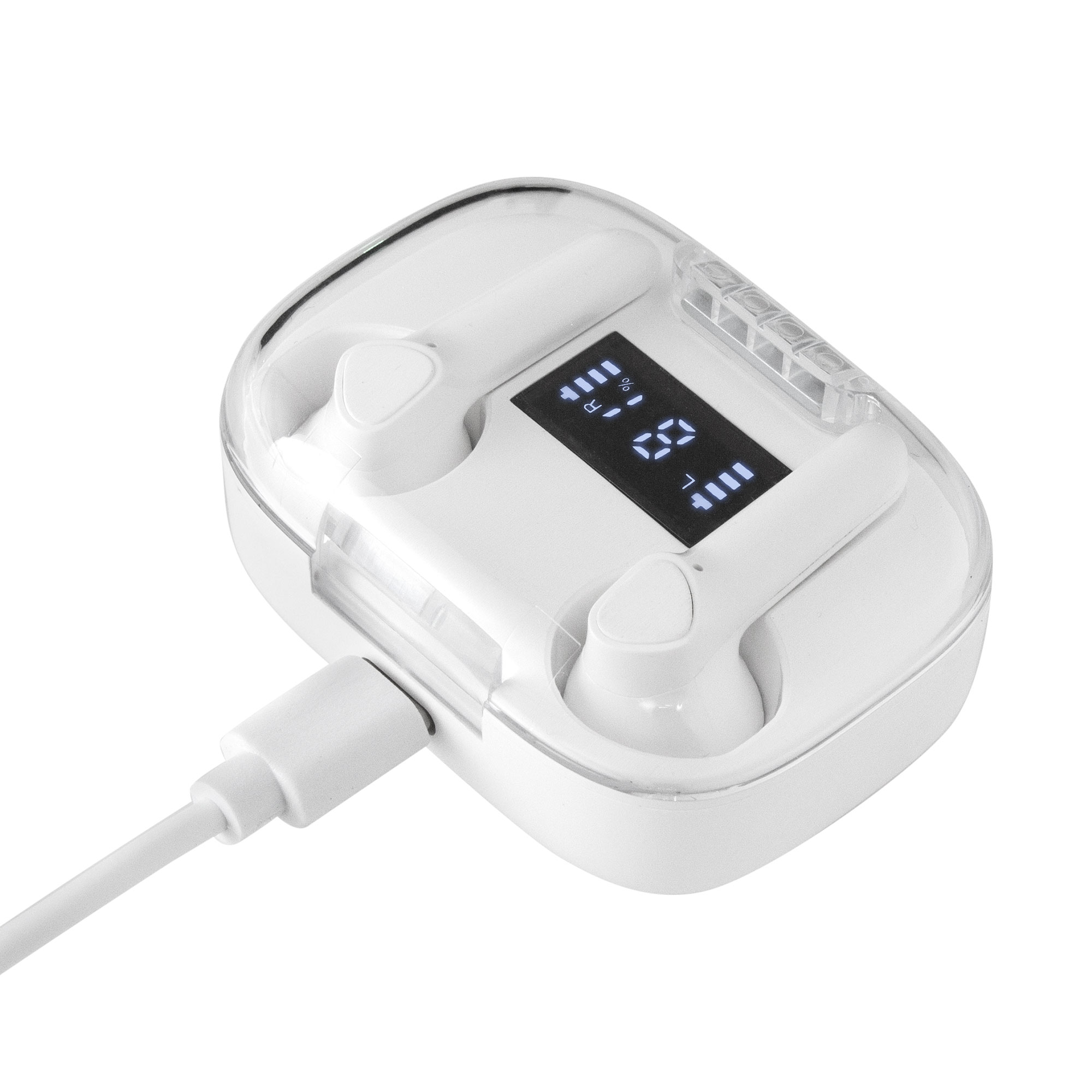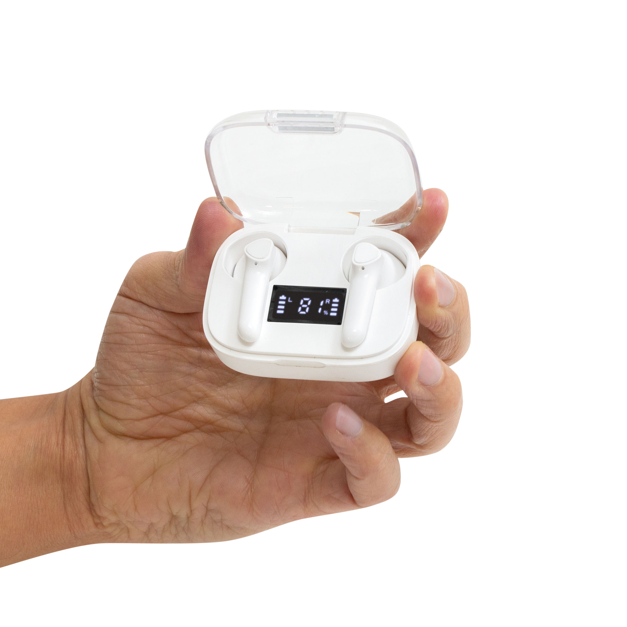 Sonido nítido, sin cablesAudífonos Bluethooth. Pantalla digital y tapa transparente. Rango de alcance: 15 metros. Tiempo de reproducción: aprox. 3 horas. Tiempo de Carga: 1 hora Duración de la carga en inactividad: 200 horas. Cable de carga USB tipo C en color blanco para audífonos blancos, y en color negro para la versión en negro. Medidas: 6 x 4,5 x 2,5 mm. Material: Plastico ABS. Versión Bluetooth: 5.1 Capacidad Batería: 30 mAh para cada auricular. Capacidad Batería caja de carga: 250 mAh Presentación: en caja de regalo blanco mate para audífonos blancos y en caja de regalo negro mate para audífonos negros.