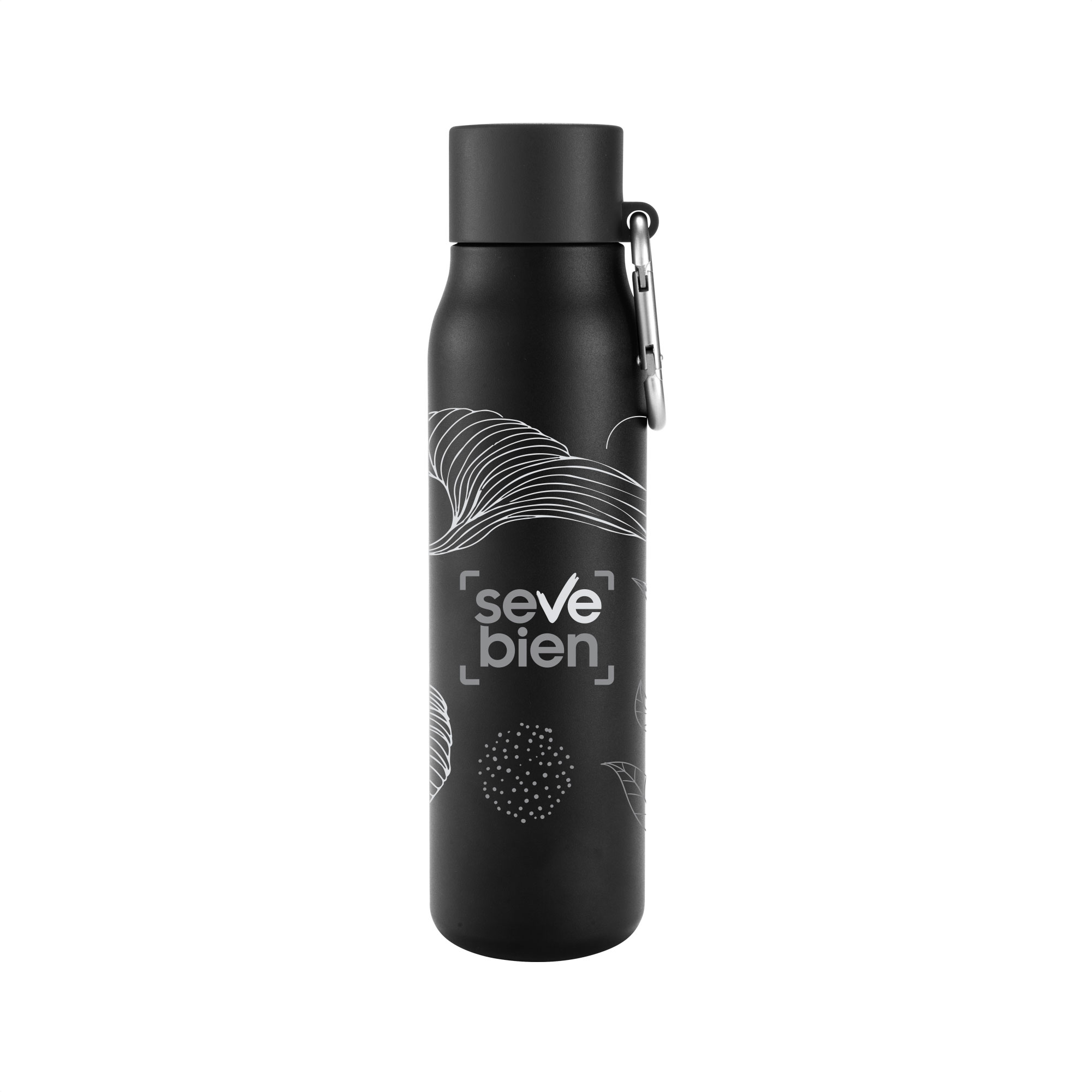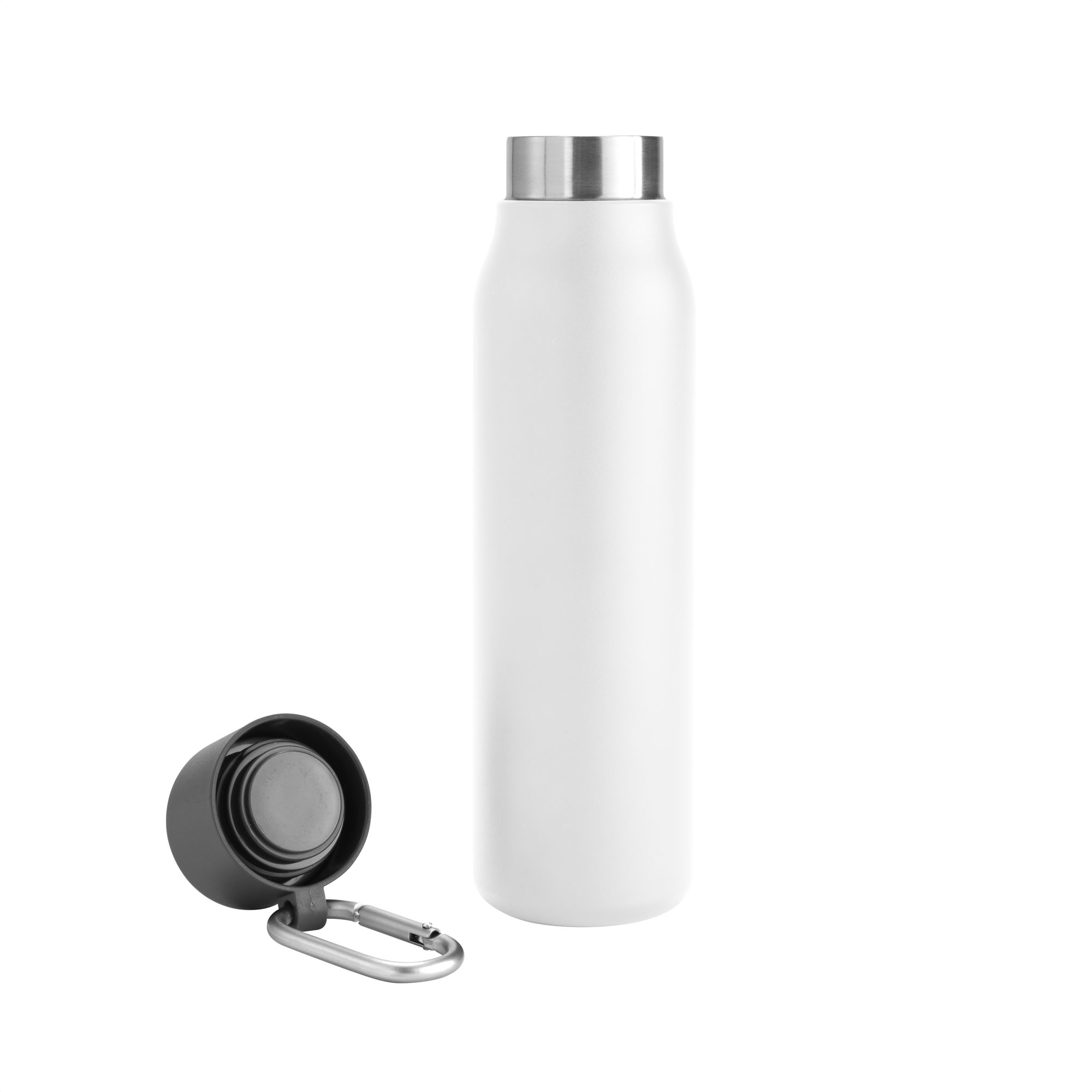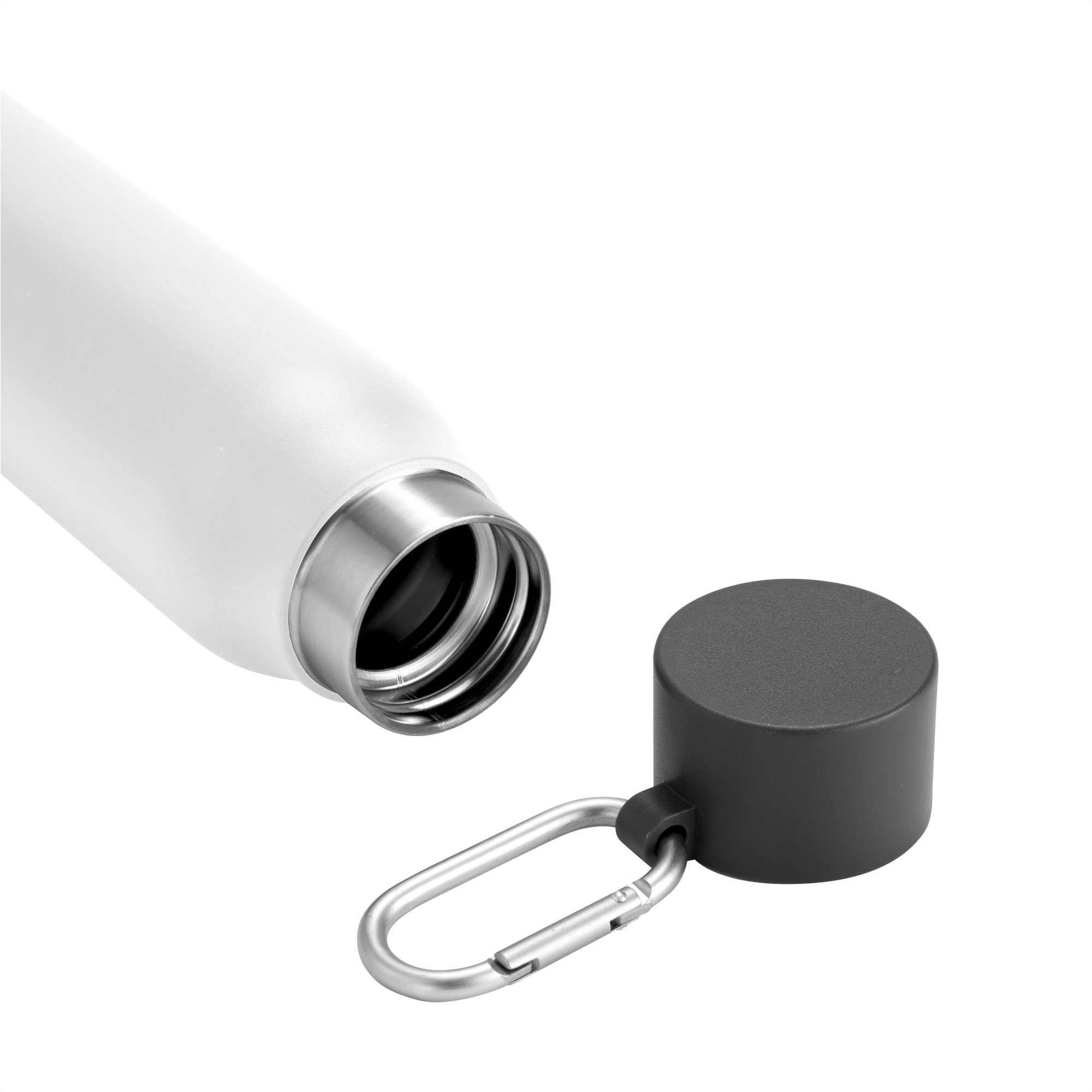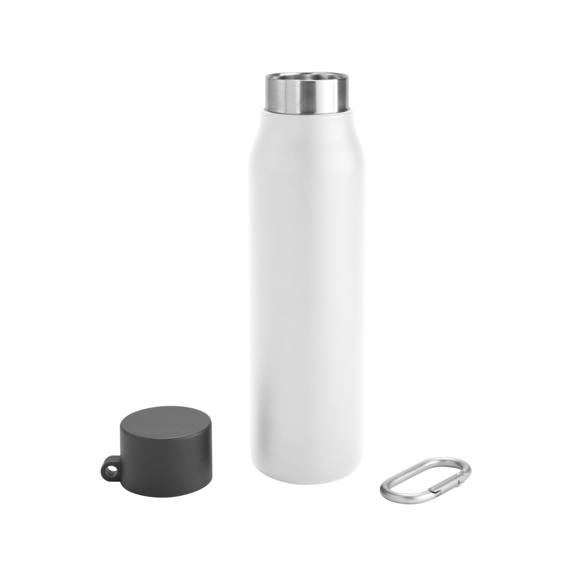 Acero reciclado, resistencia aseguradaBotella doble pared, sellada al vacío. Interior en acero 304 reciclado y exterior en acero 201. Pintura powder coat (pintura más duradera y resistente a la corrosión y el paso del tiempo). Tapa plástica de polipropileno y anillo de silicona con mosquetón de aluminio. Mantiene hasta 12 hs la temperatura de las bebidas calientes y 24 hs de las bebidas frías. Medidas: Ø 6,5cm x 25 cm. Capacidad: 550 ml. Materiales: Acero inoxidable reciclado, polipropileno y aluminio. Presentación: en caja de regalo Kraft.