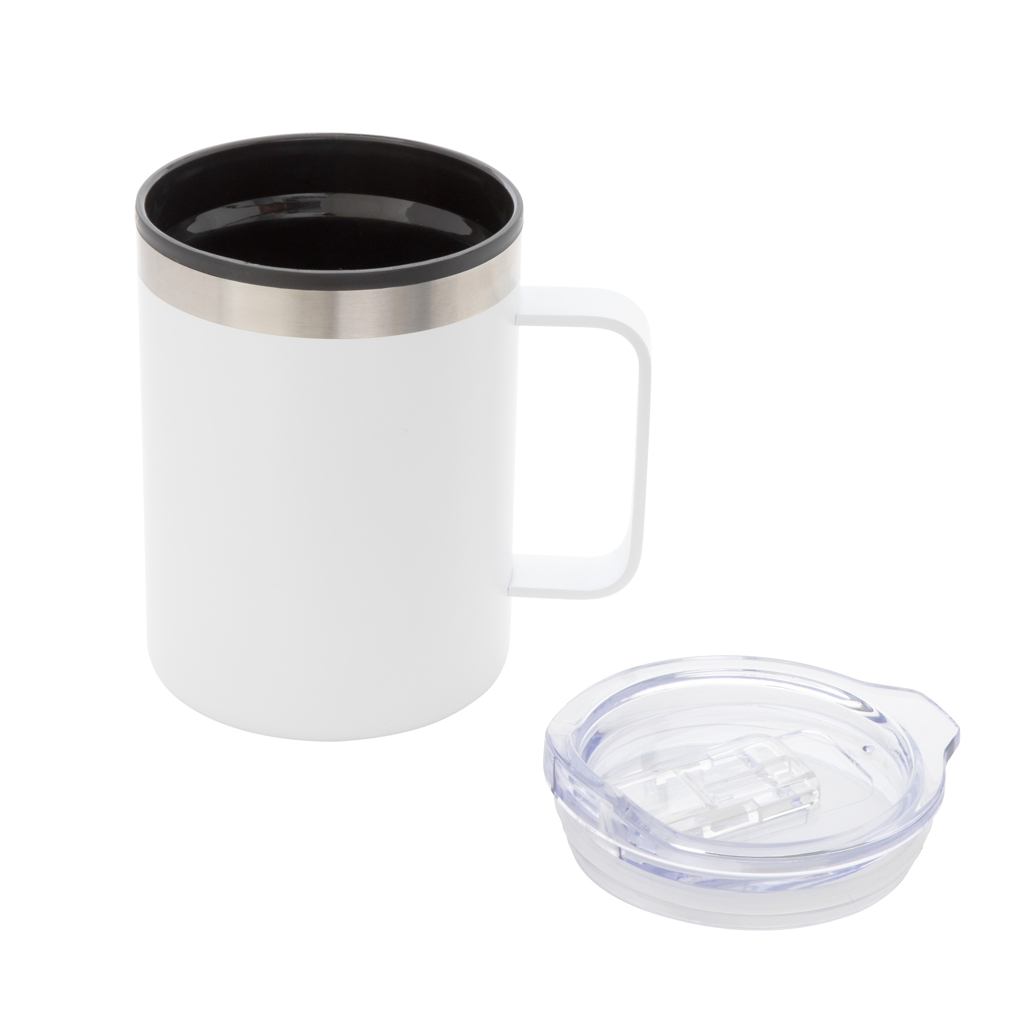 Mantén tus bebidas a la temperatura perfecta.Mug doble pared. Interior de polipropileno y exterior de acero 201. Tapa plástica transparente a presión con anillo de silicona. Pintura acabado semimate. Base negra antideslizante.Medidas: Ø 8,8 cm x 12,5 cm. Capacidad: 450 ml. Materiales: Acero inoxidable, plástico PP y PS. Presentación: en caja de regalo kraft.