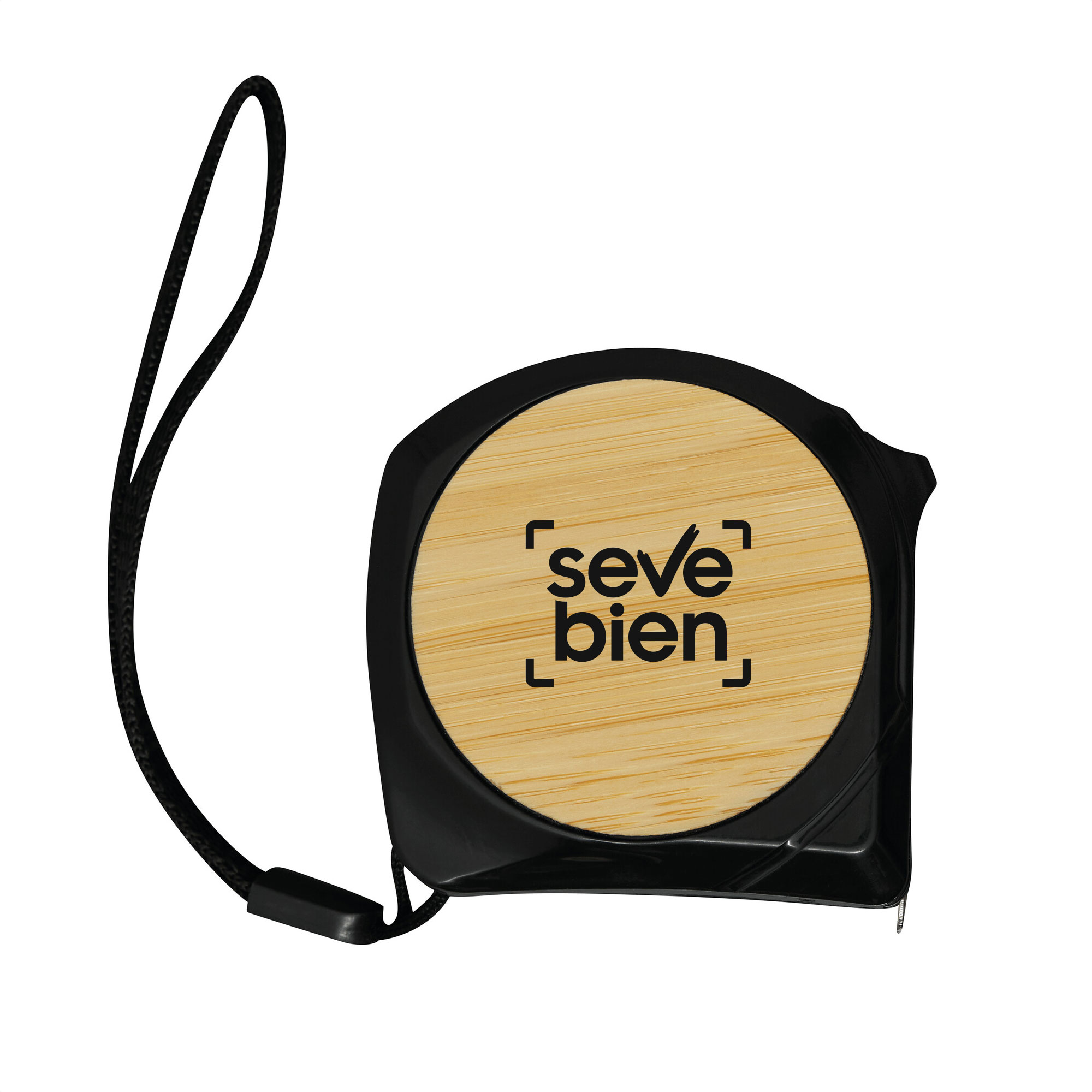 Compacta y lista para todo.Cinta métrica. 3 metros de longitud. Cinta de acero inoxidable con traba de seguridad y clip sujetador metálico. Estructura de ABS con detalle circular en bambú. Correa de poliéster. Medidas: 6 x 6 x 3,4 cm. Materiales: ABS, Acero inoxidable, poliéster y bambú. Longitud: 3 m. Presentación: en caja de regalo kraft