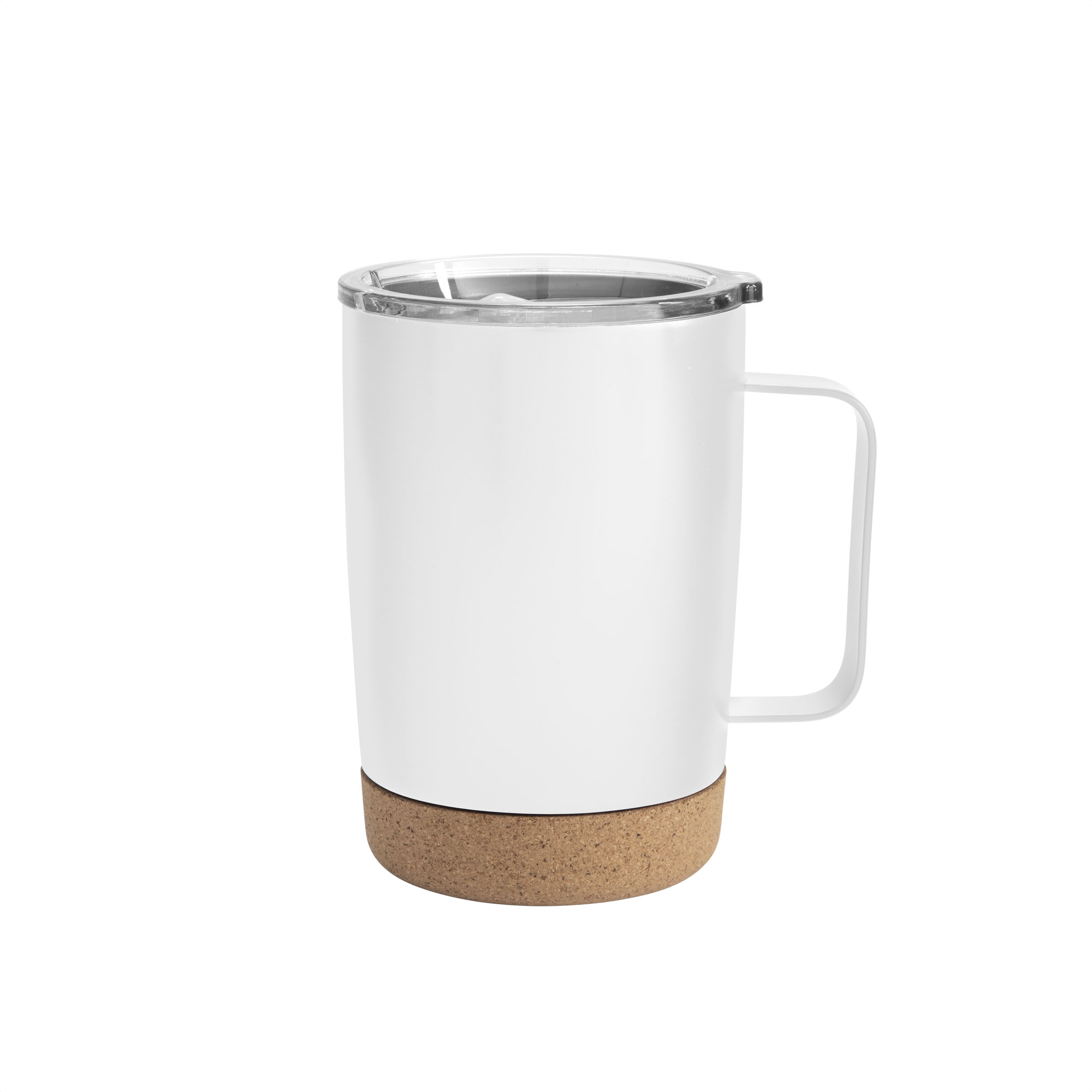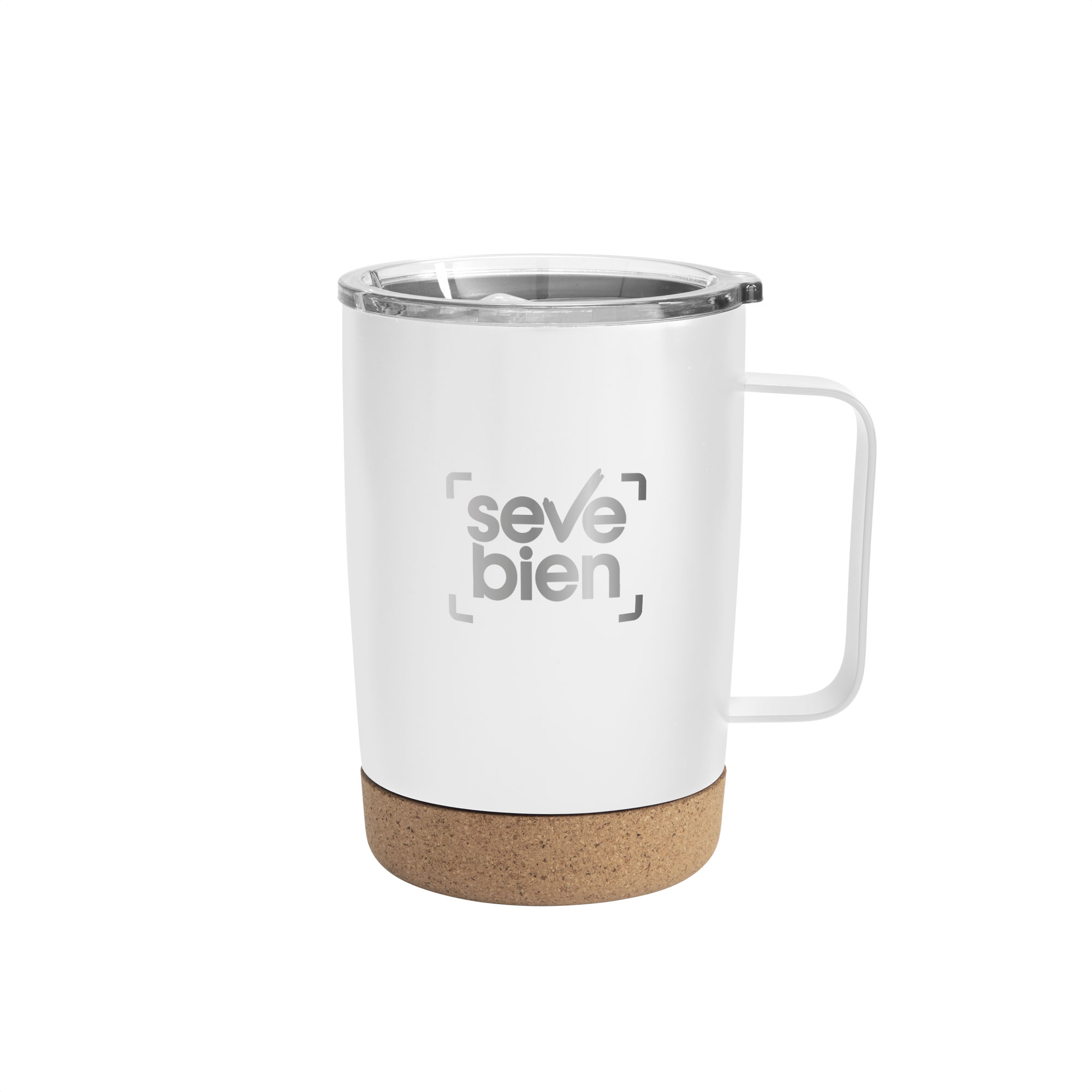 Diseño elegante con base de corcho.Mug doble pared con asa, sellado al vacío. Mug con aislamiento térmico. Tecnología vacuum. Interior en acero 304 y exterior en acero 201. Tapa de poliestireno con anillo de silicona. Asa metálica. Base de corcho. Pintura acabado semi mate. Mantiene hasta 12 hs la temperatura de las bebidas calientes y 24 hs de las bebidas frías.Medidas: Ø 8,5 cm x 13 cm. (no incluye asa) Capacidad: 350 ml. Materiales: Acero inoxidable, poliestireno y corcho. Presentación: en caja de regalo Kraft.