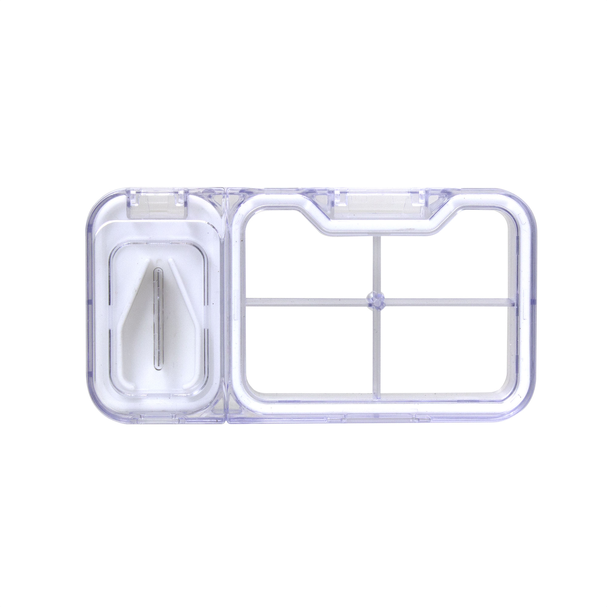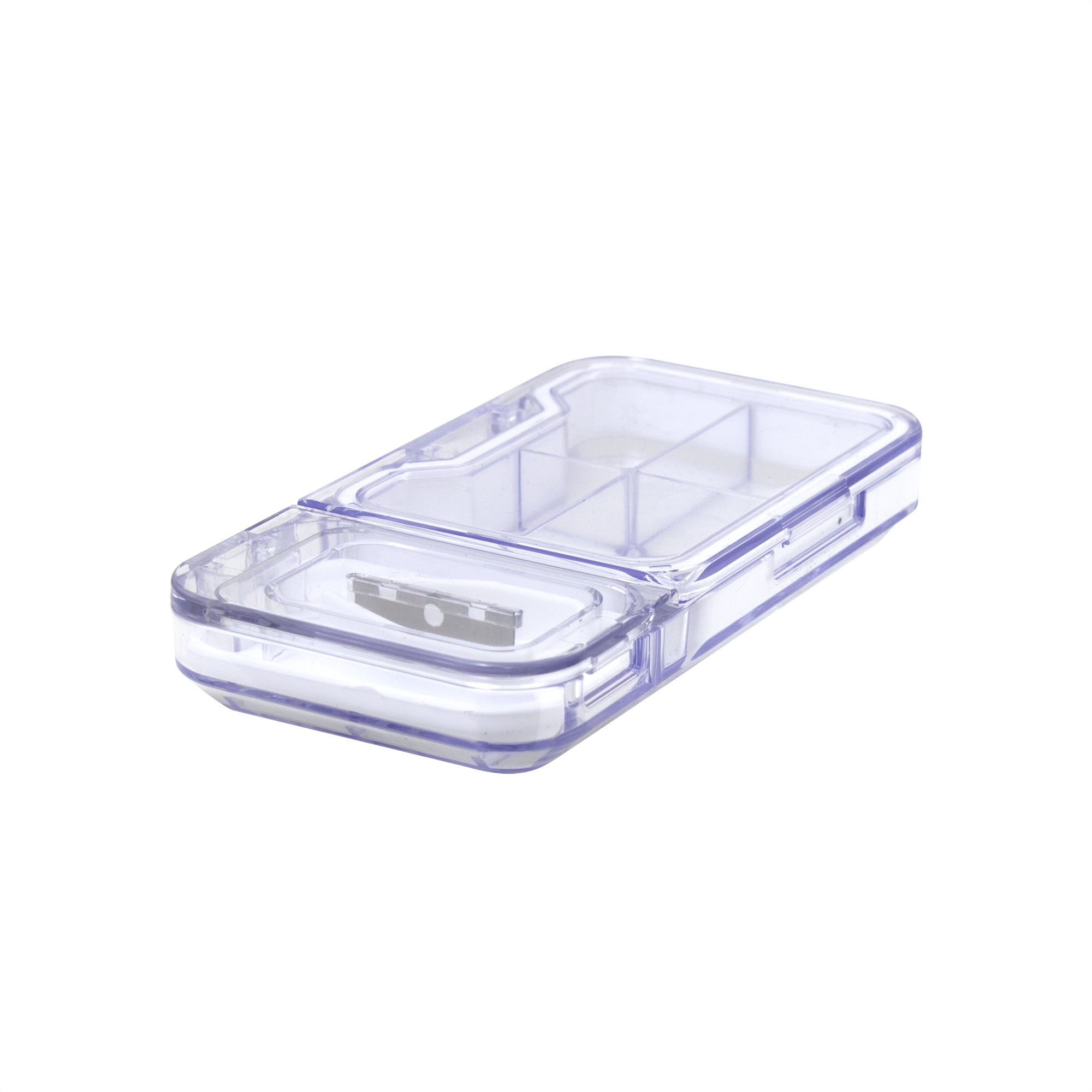 Compacto, práctico y seguro.Pastillero organizador corta pastilla. Compartimento principal con cuatro divisiones y recubrimiento perimetral de silicona. Compartimento secundario con base de silicona y soporte regulable de pastillas. Cuchilla de acero incorporada en la tapa. Ambos compartimentos con tapa rebatible y cierre a presión.Medidas: 12 x 6,3 x 1,8 cm Materiales: Plástico AS, silicona y acero inoxidable 420J2 (grado alimenticio) Peso: 71,3g