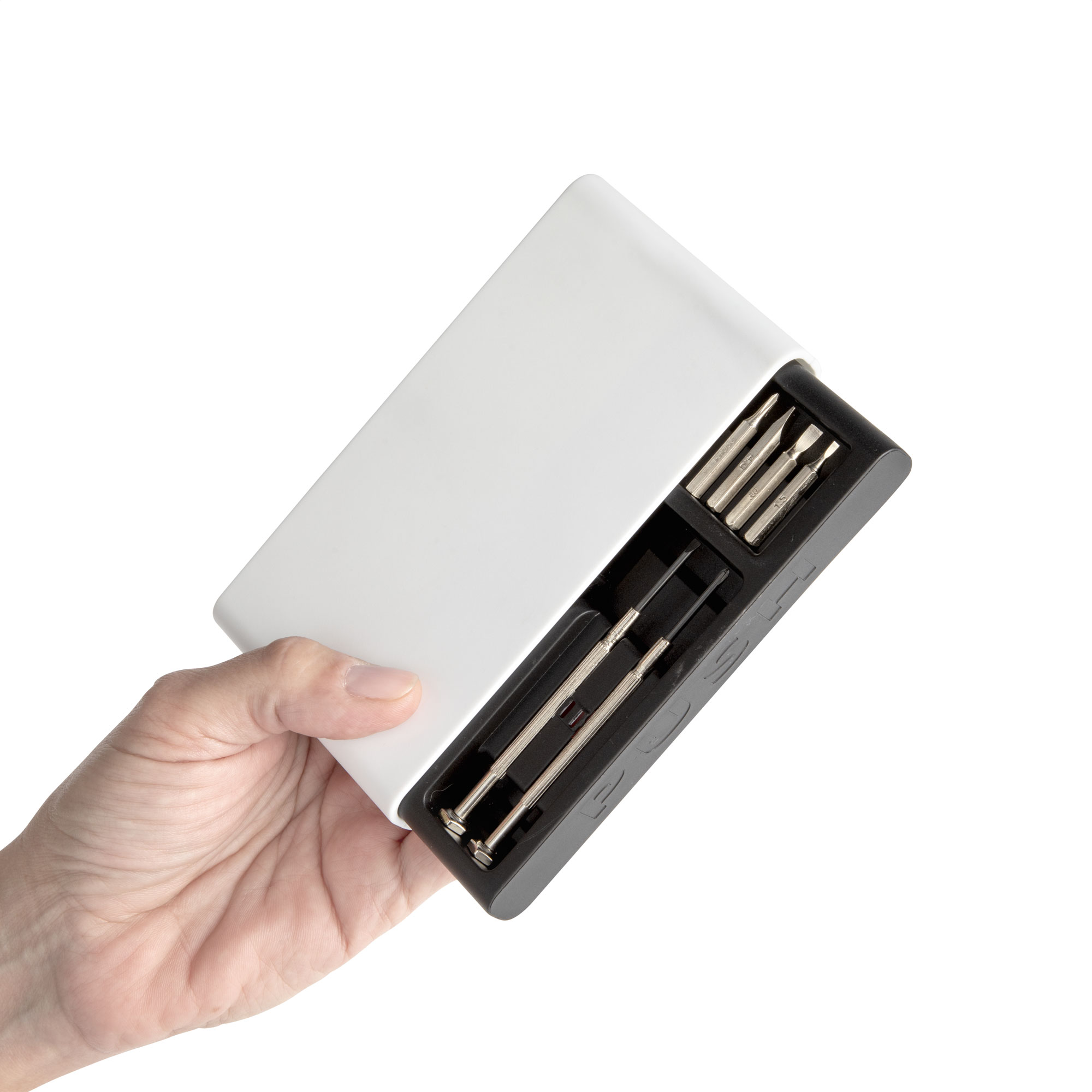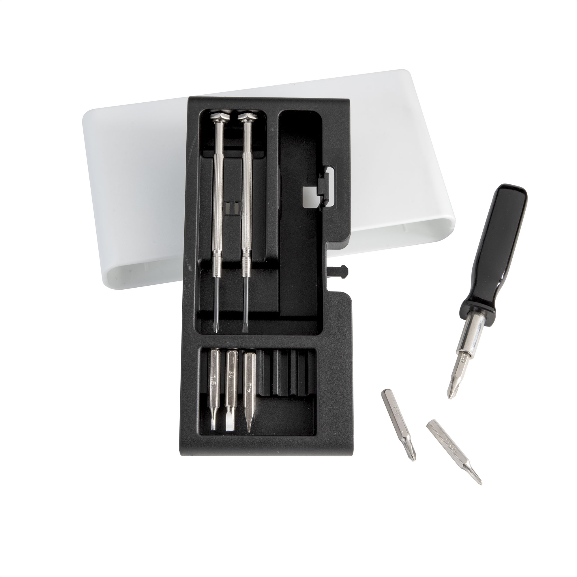 Todas las puntas en un solo estuche.Set de destornilladores. Incluye: 1 mango con punta imantada, 6 puntas diferentes (3 planas: 1,5 ; 3 y 4 mm. y 3 phillips: 0000, 0 y 1mm.) y 2 destornilladores de precisión (1 plano y 1 phillips). Base imantada que permite mantener ordenadas las diferentes puntas. Apertura push. Medidas: 7,3 x 13,7 x 2,1 cm. Materiales: ABS, polipropileno y acero. Presentación: en caja de regalo kraft