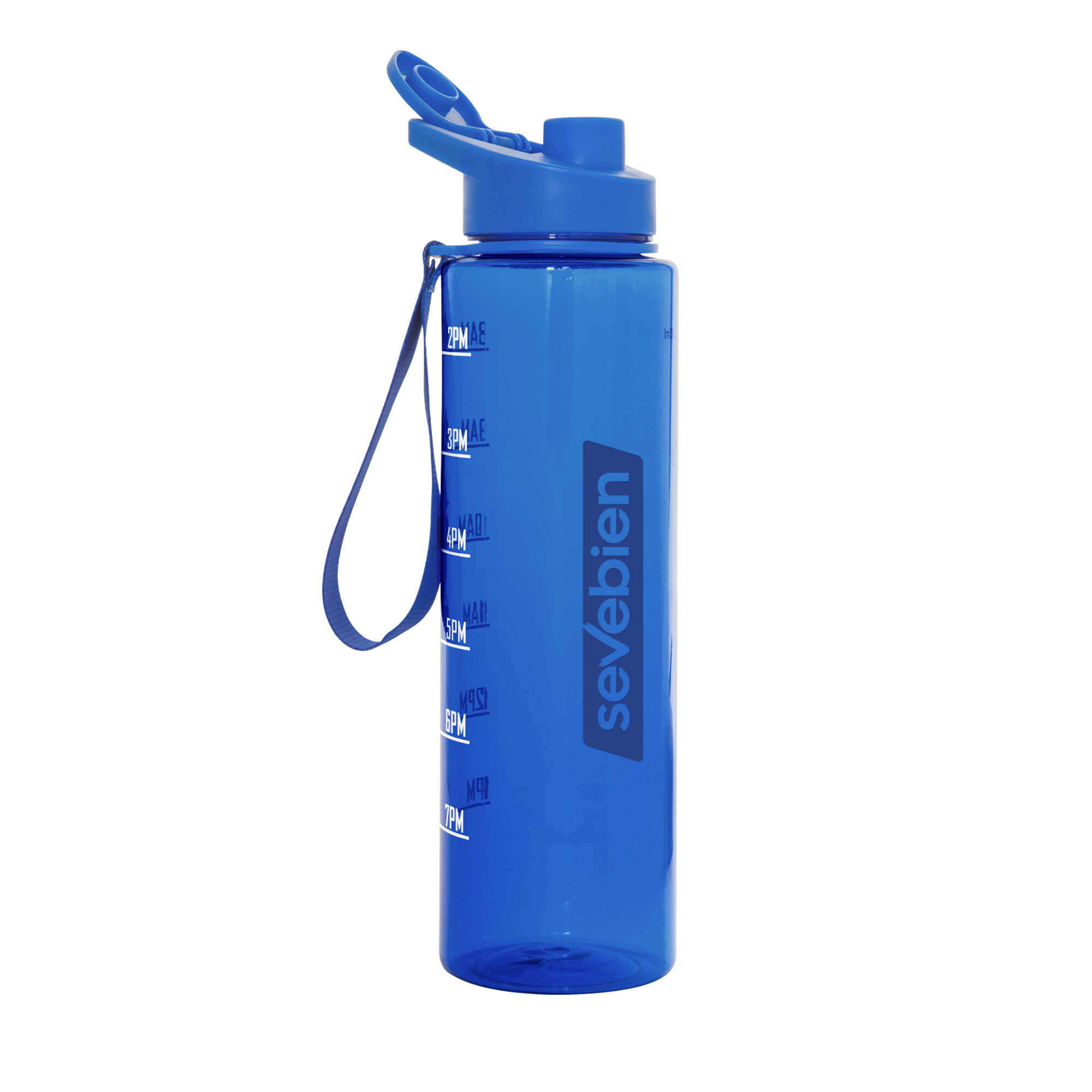 Tu meta en cada sorbo.Botella con marcador de tiempo y medida. Color translúcido con tapa plástica flip top con asa, boquilla y correa del mismo color de la botella.Medidas: Ø 7,5 x 27,5 cm. (con tapa) Capacidad: 1000 ml. Material: Plástico PETG, polipropileno y silicona.