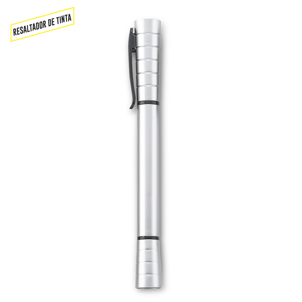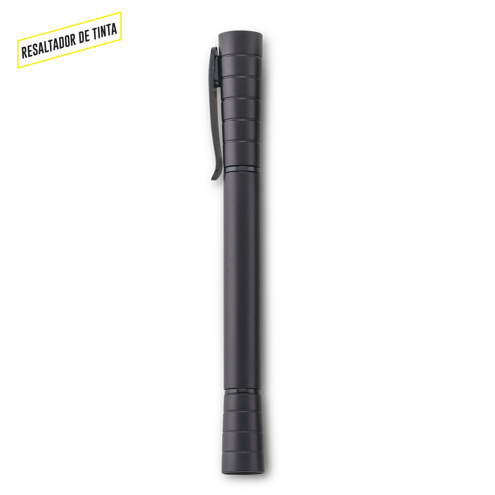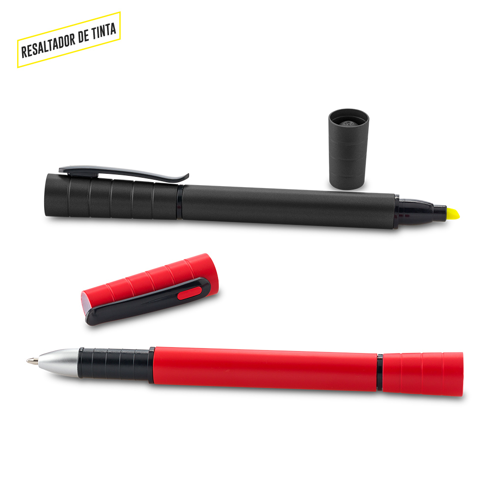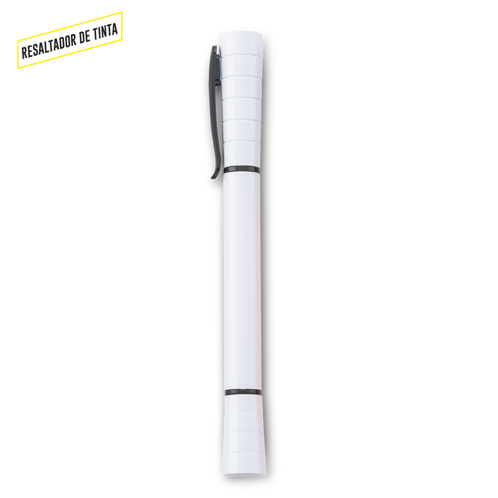 Bolígrafo plástico con resaltador de tinta.