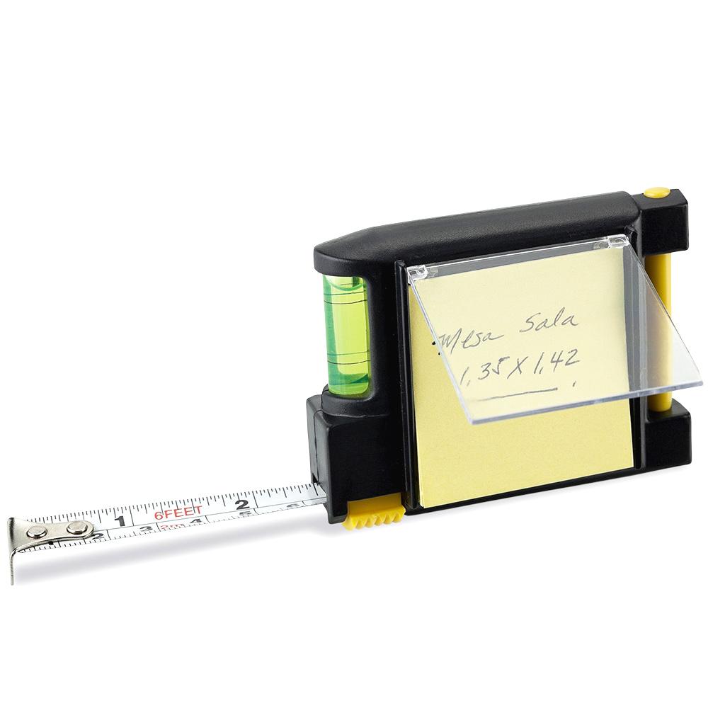 Cinta metálica de 2 metros. Incluye nivelador, minibolígrafo, minipad de notas adhesivas y gancho para portar en la cintura. Empaque Caja Individual.