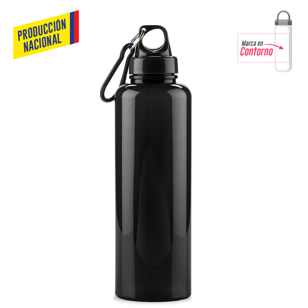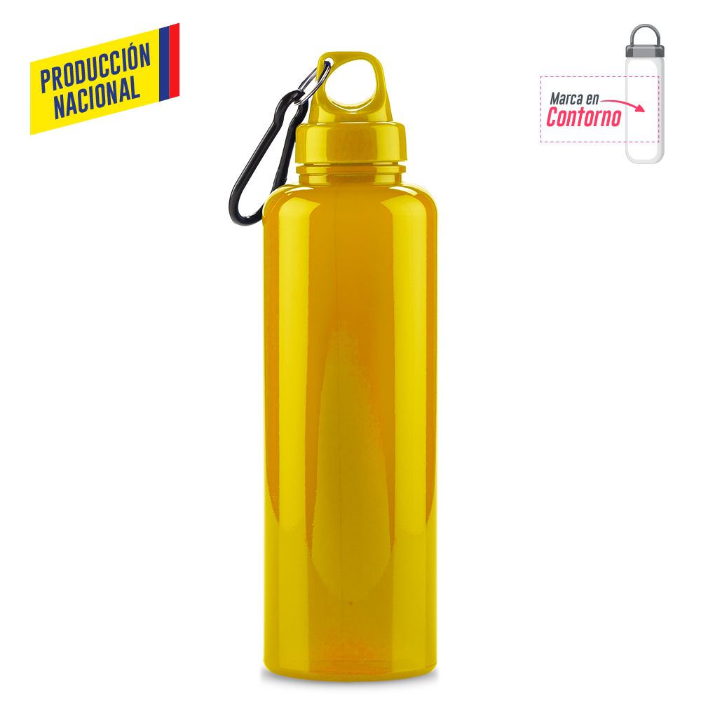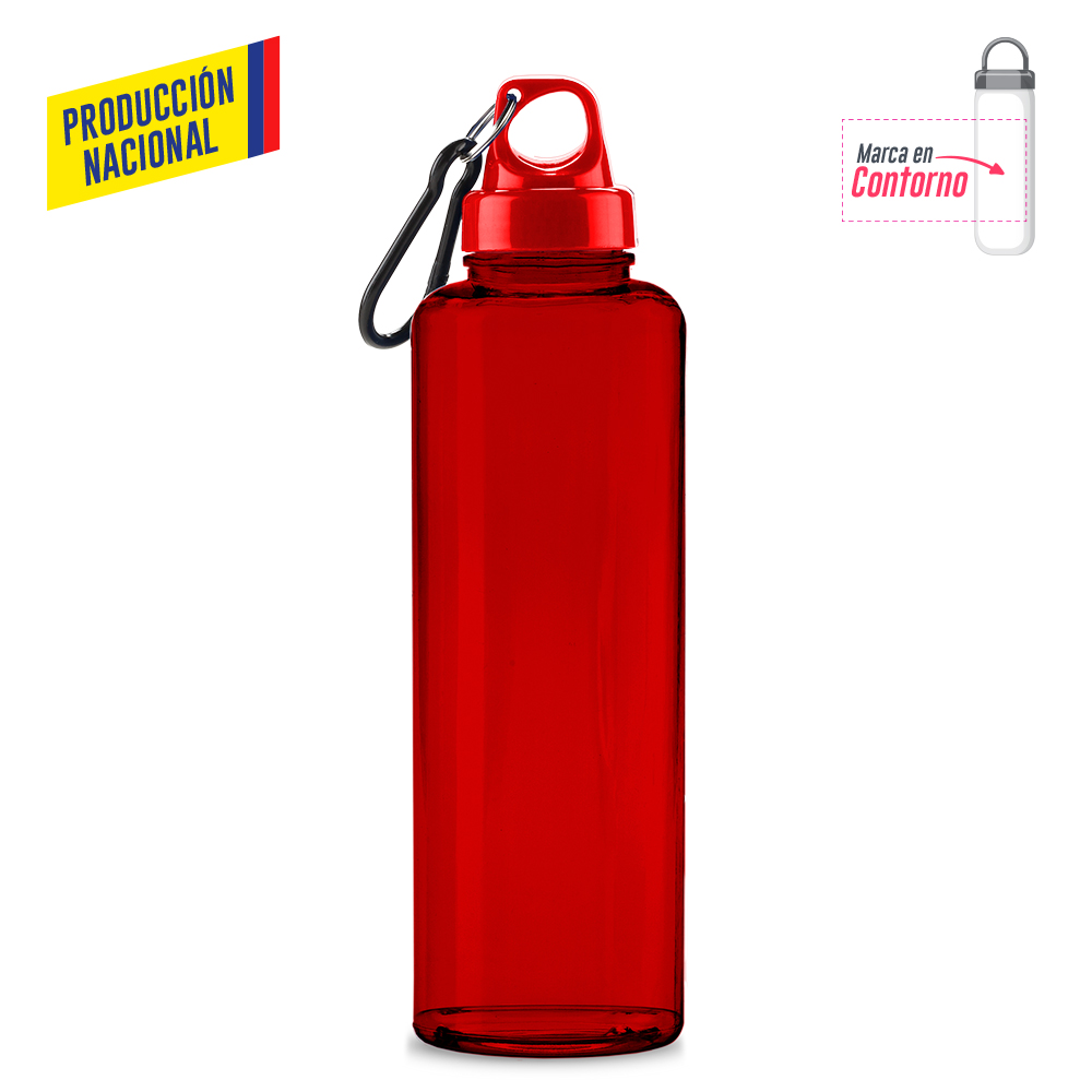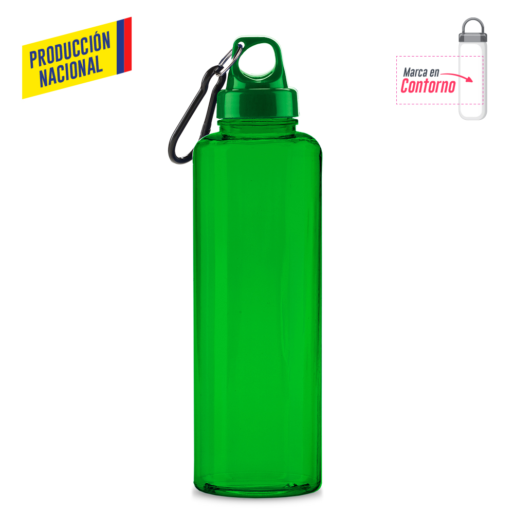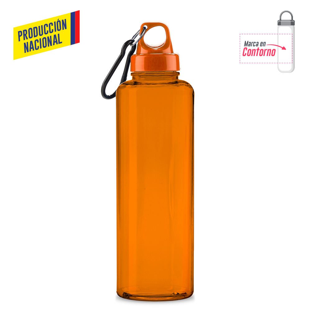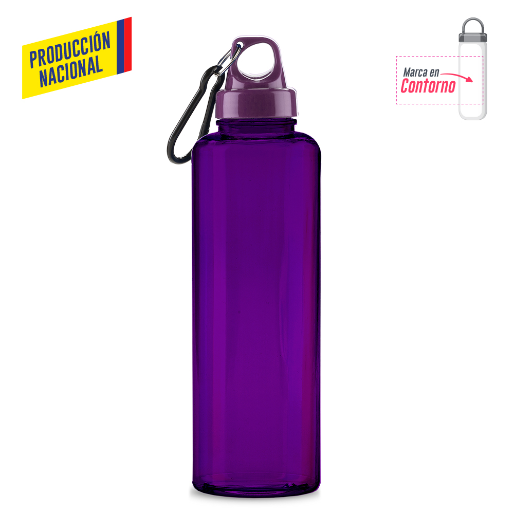 Botilito en PVC atóxico, tapa plástica y carabinero plástico. 750 ml. Atóxico. Tapa en color Sólido, botilito acabado sólido o acabado translúcido.