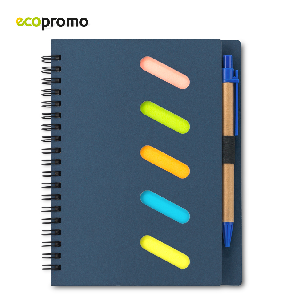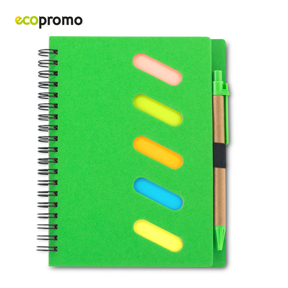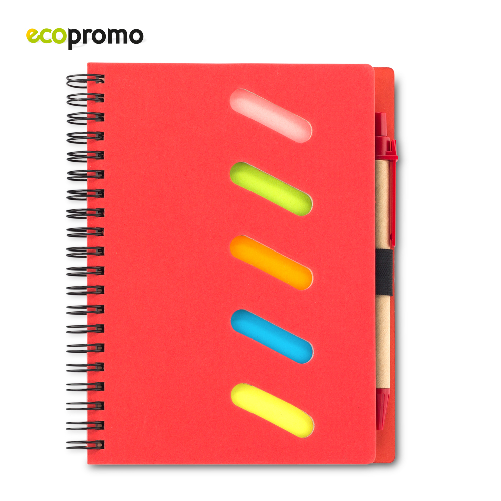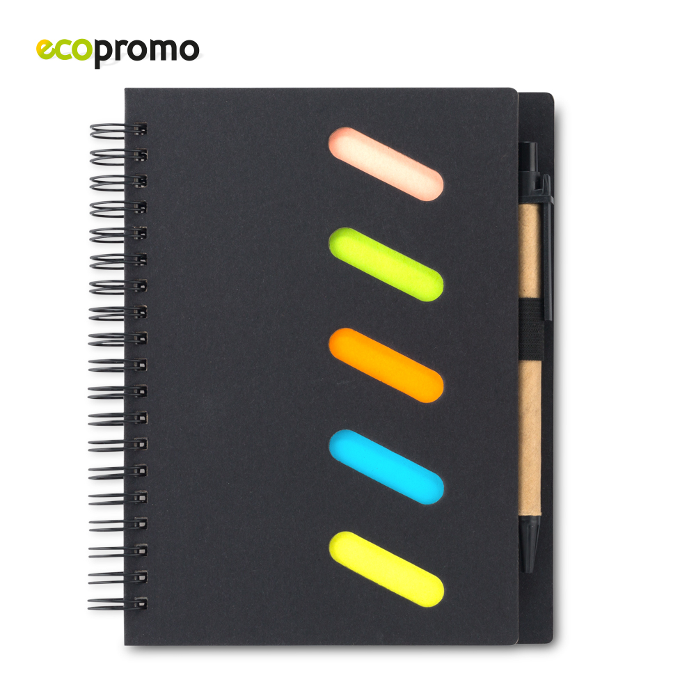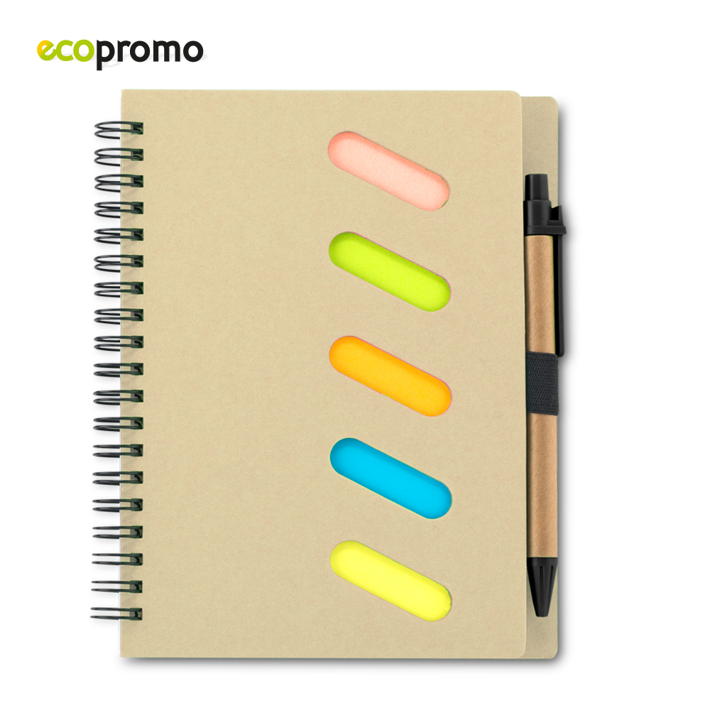 Libreta doble argolla y bolígrafo de cartón. 50 hojas. Cinco stickies de colores – 20 hojas cada uno.