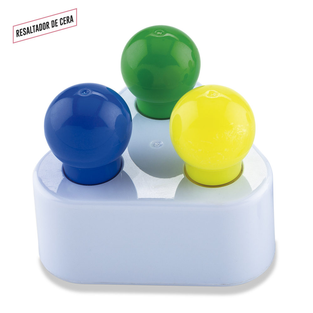 Base triangular en plástico, con 3 resaltadores en cera. No se seca.