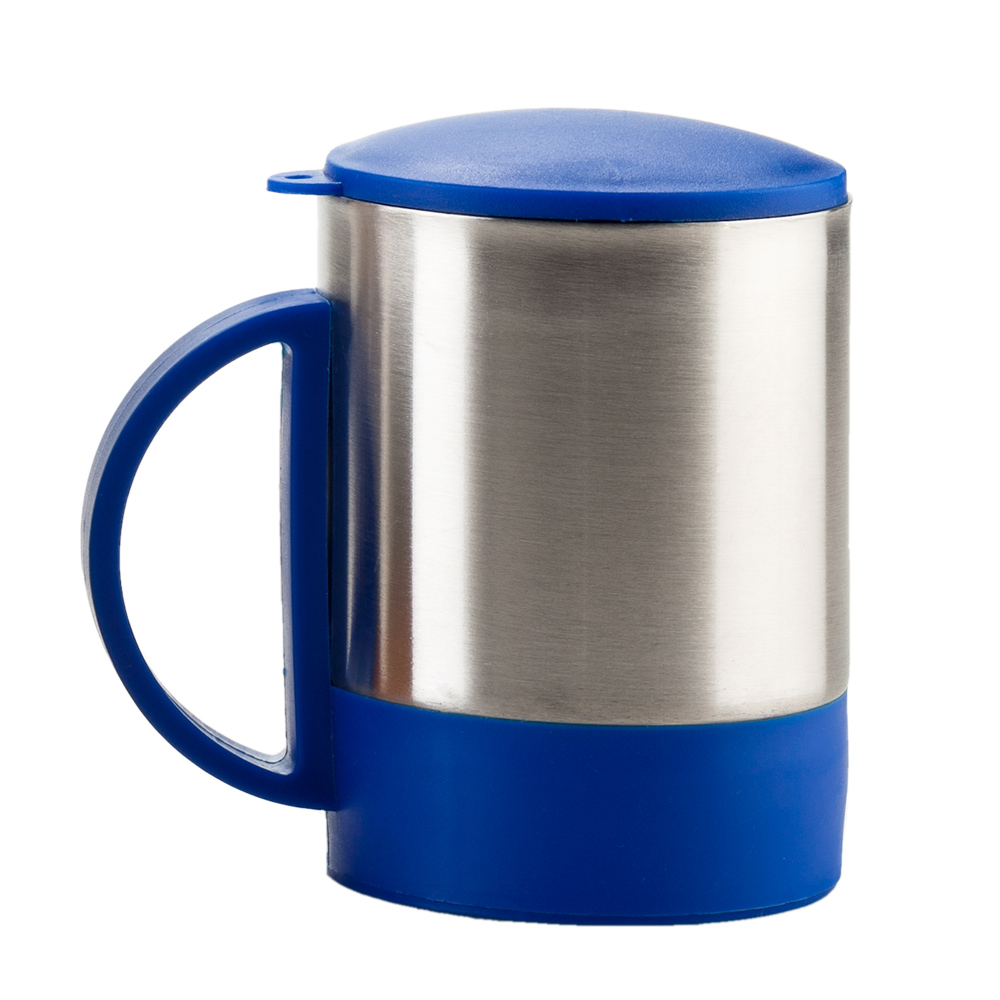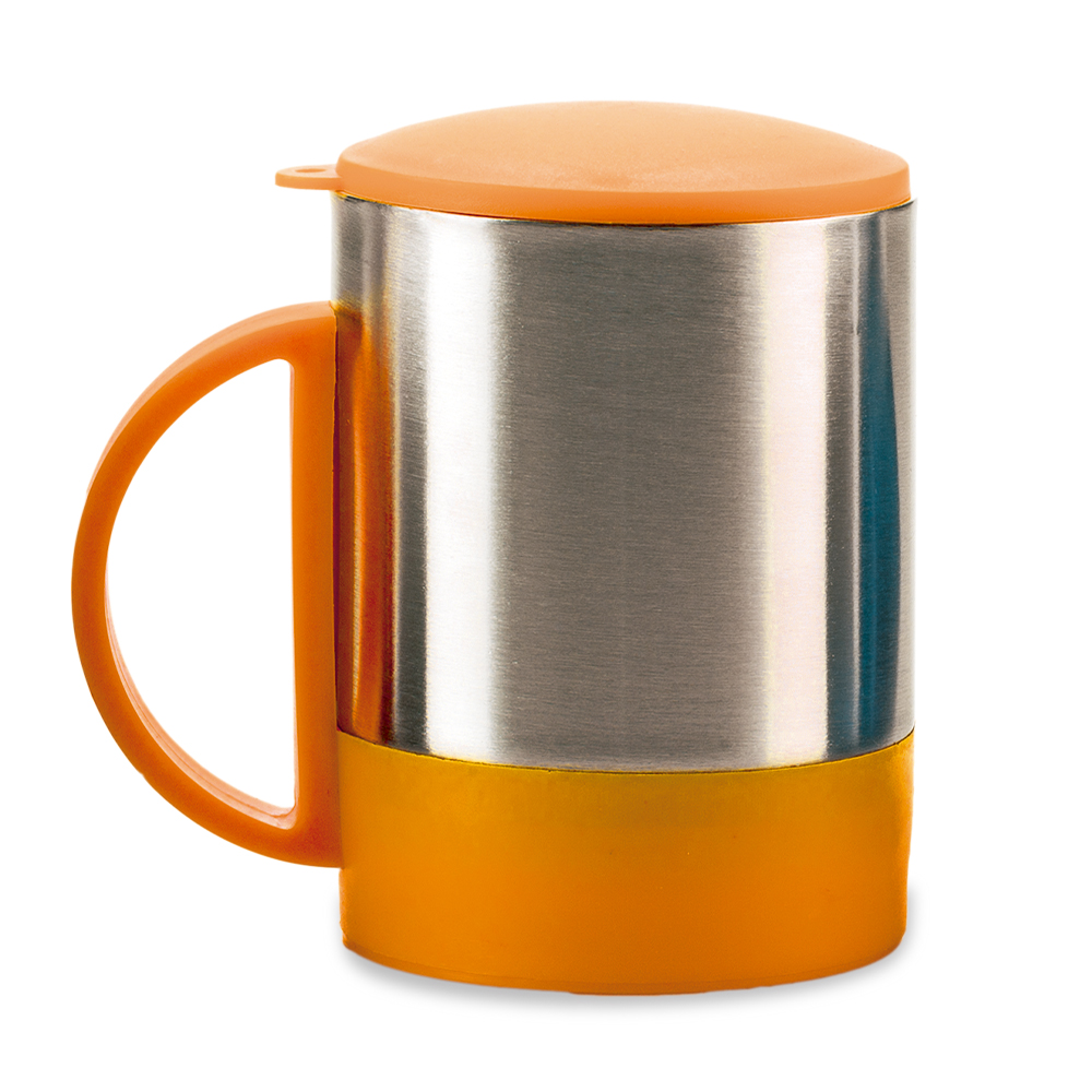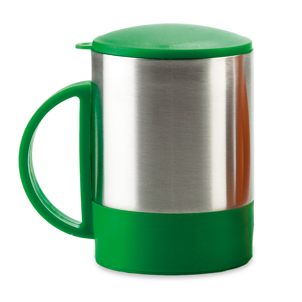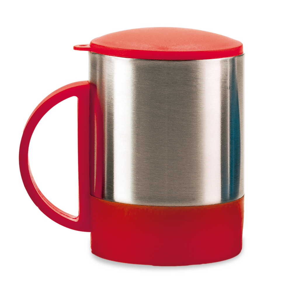 Mug en acero con base y tapa de color. La tapa es una tapa protectora de cierre a presión, no es tapa de seguridad. Empaque Caja Individual.
