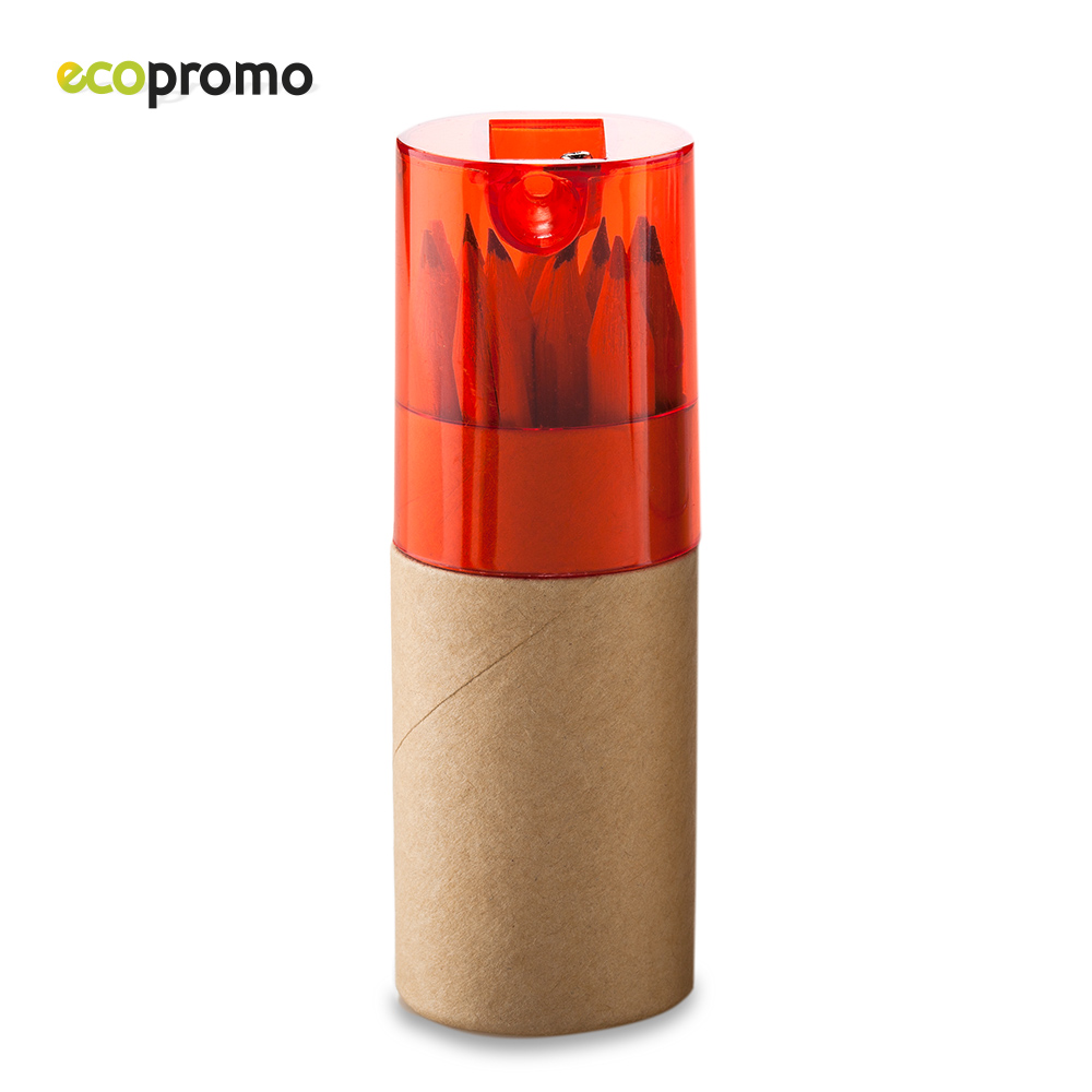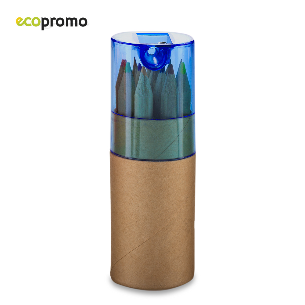 Estuche de cartón con 12 colores y tajalápiz plástico.