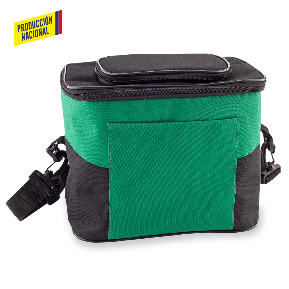 En poliéster con bolsillo frontal y recubrimiento interior que conserva las bebidas o alimentos fríos por más tiempo. Parte superior con cremallera para fácil acceso al interior. Correa ajustable para cargar.