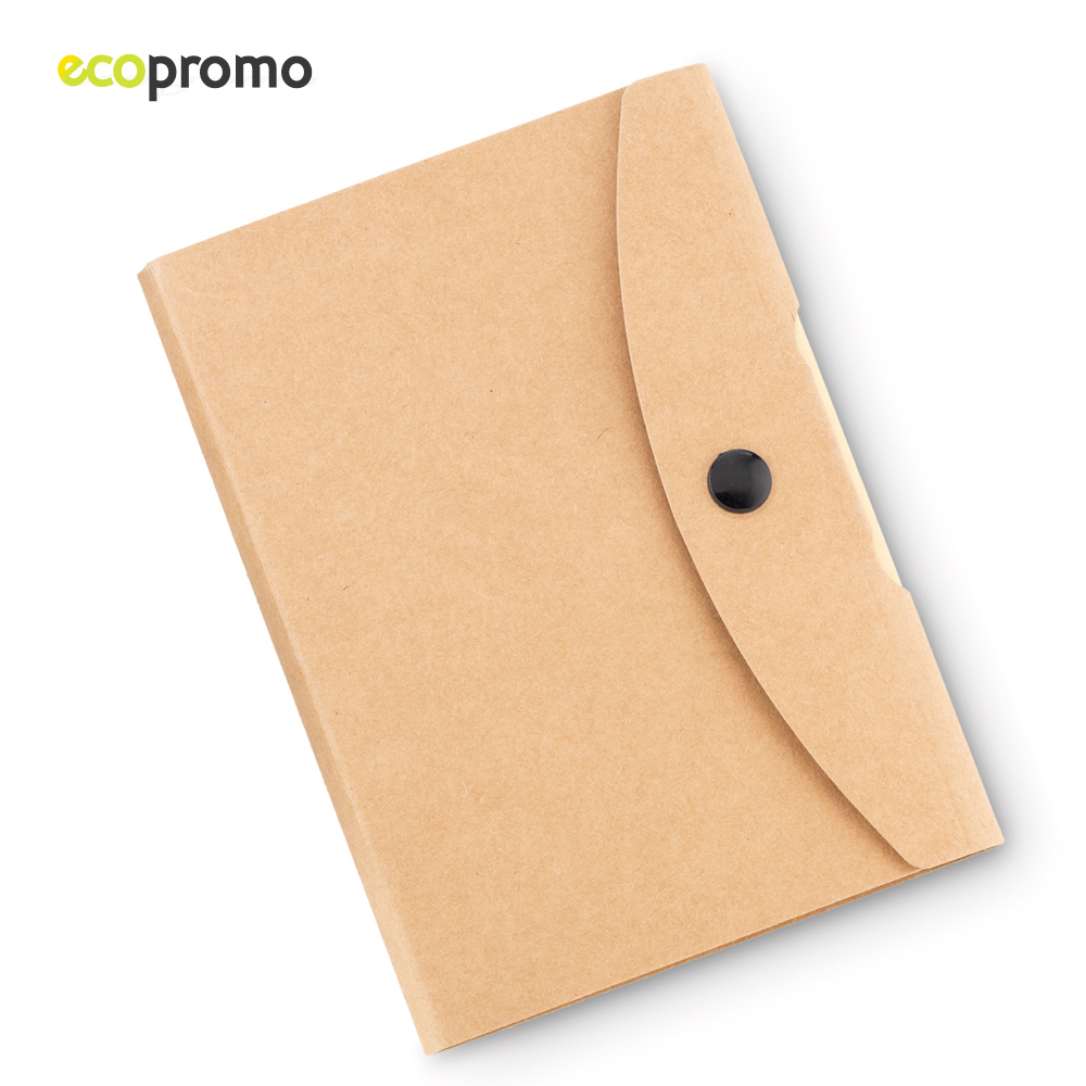 Libreta en cartón reciclable con botón de presión y bolígrafo; taco de 70 hojas rayadas, taco de notas autoadhesivos y set de 5 stickies de colores.