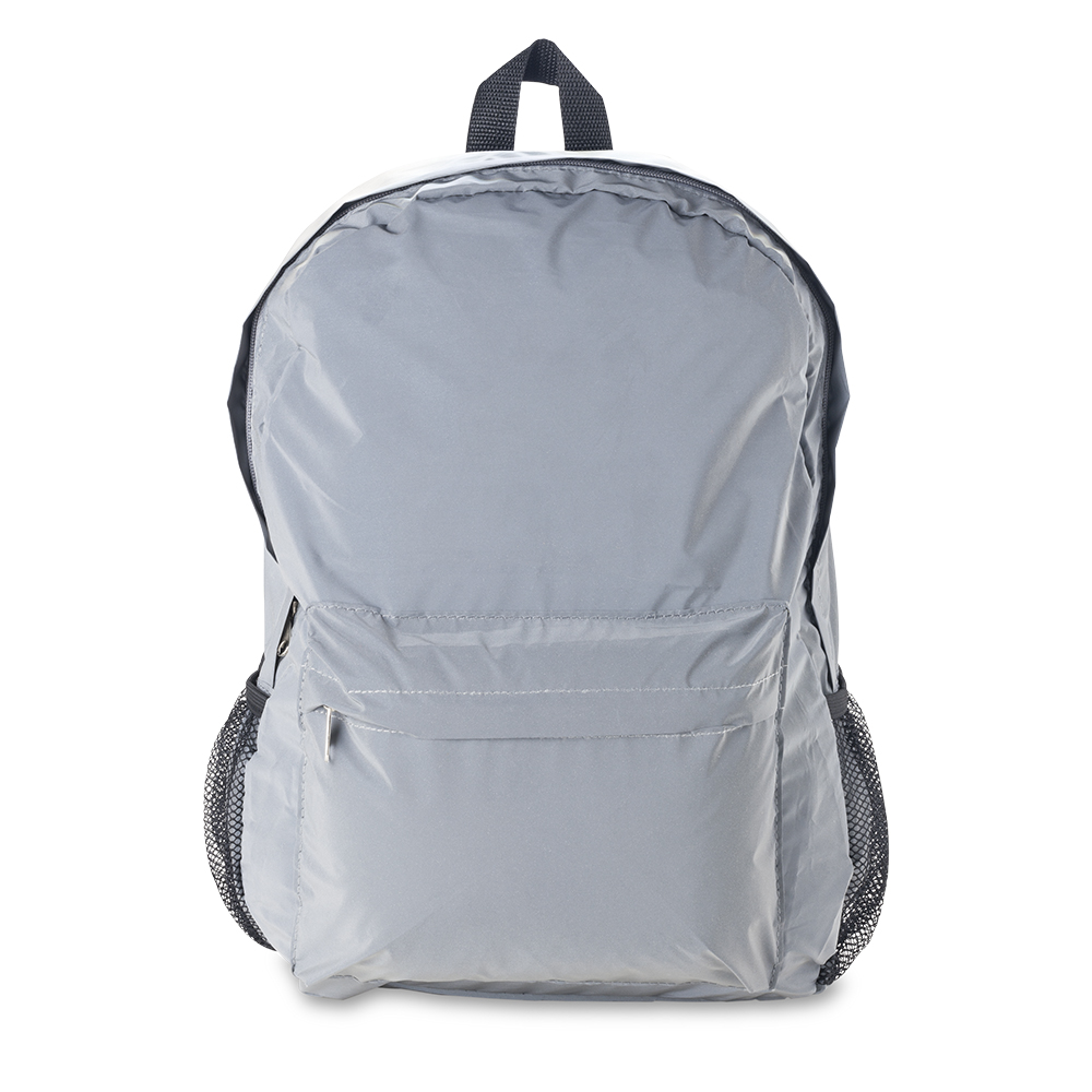 Morral backpack en poliéster reflectivo con dos bolsillos, y dos bolsillos de malla.
