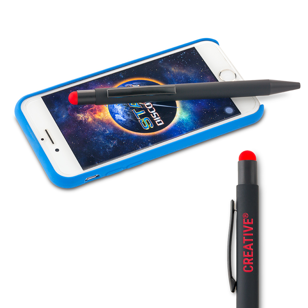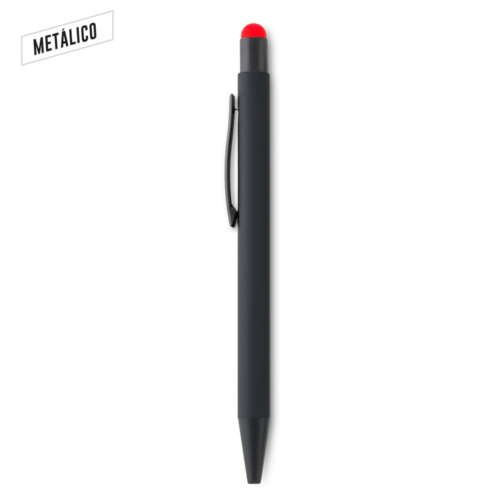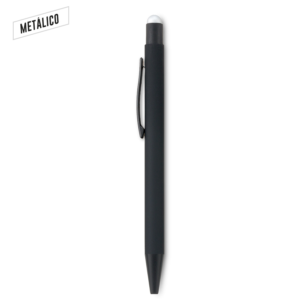 Bolígrafo metálico con stylus. Acabado caucho. Mecanismo push. Puede ver el logo del mismo color del pulsador al marcar en láser.