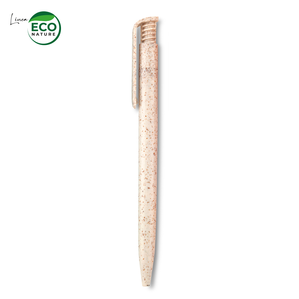 Bolígrafo plástico. Mecanismo push. Mezcla con material ecológico en fibra de trigo (50%-60% aprox). El porcentaje de material ecológico tiene un promedio de biodegradabilidad de 2-3 años después del fin de su vida útil.