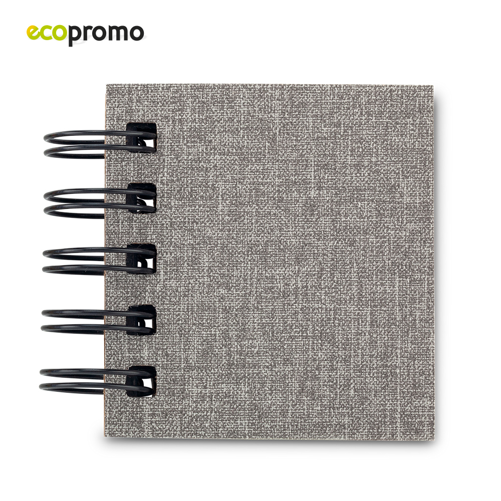 Set de portastickies de cartón con cubierta de tela, argollado doble O. 3 tacos de hojas autoadhesivas x 25 und. 5 stickies de colores.