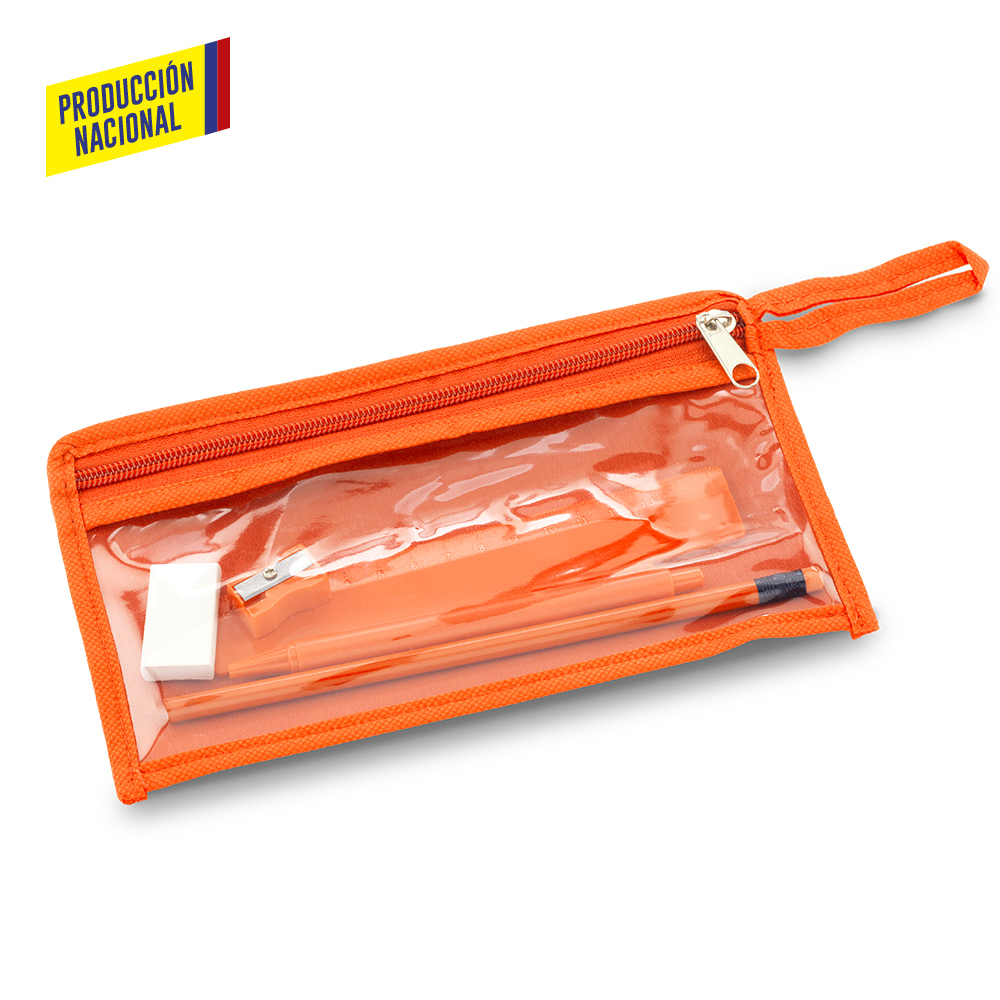 Set escolar en cartuchera en poliéster 600D con cierre de cremallera. Incluye: Lápiz, tajalápiz, bolígrafo, regla de 15cm y borrador.