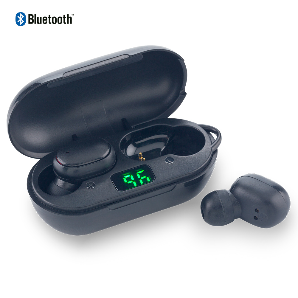 Audífonos inalámbricos plásticos Bluetooth. Funciona como manos libres. Resistente a la humedad. Hasta 5 horas de carga. Con estuche portátil de recarga y display que muestra el porcentaje de carga.