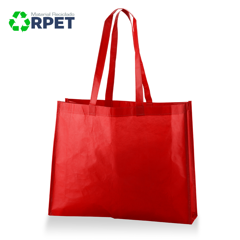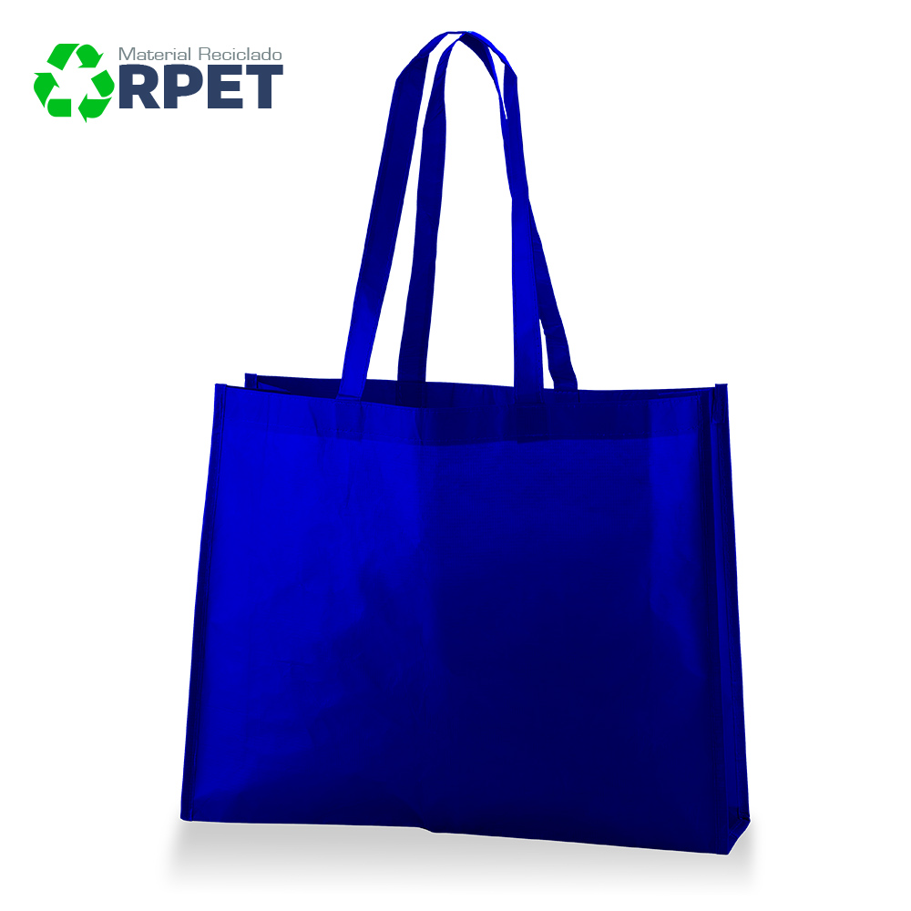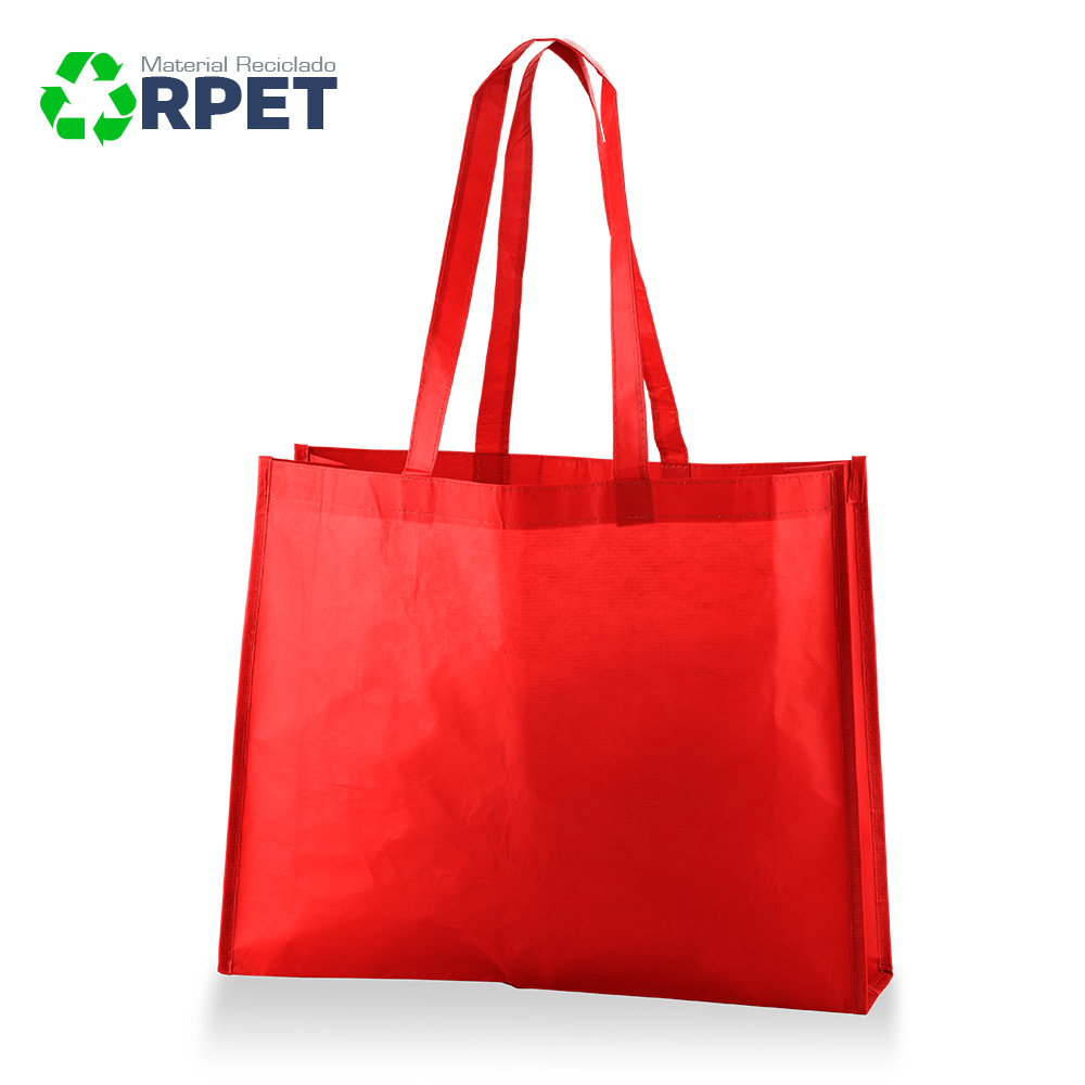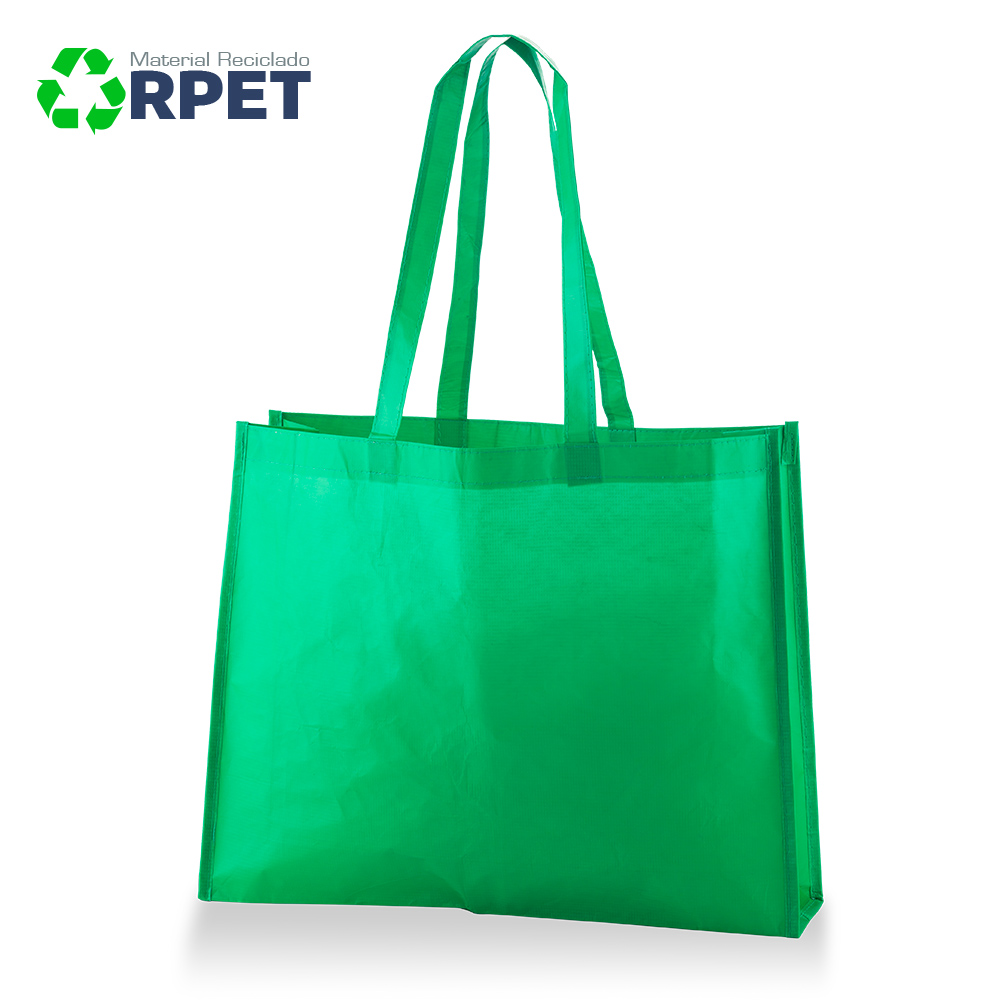 Bolsa fabricada 100% RPET (PET reciclado de botellas de agua) y manijas largas, laminado mate. Con costuras de refuerzo en X en las manijas. 100% ecológica.