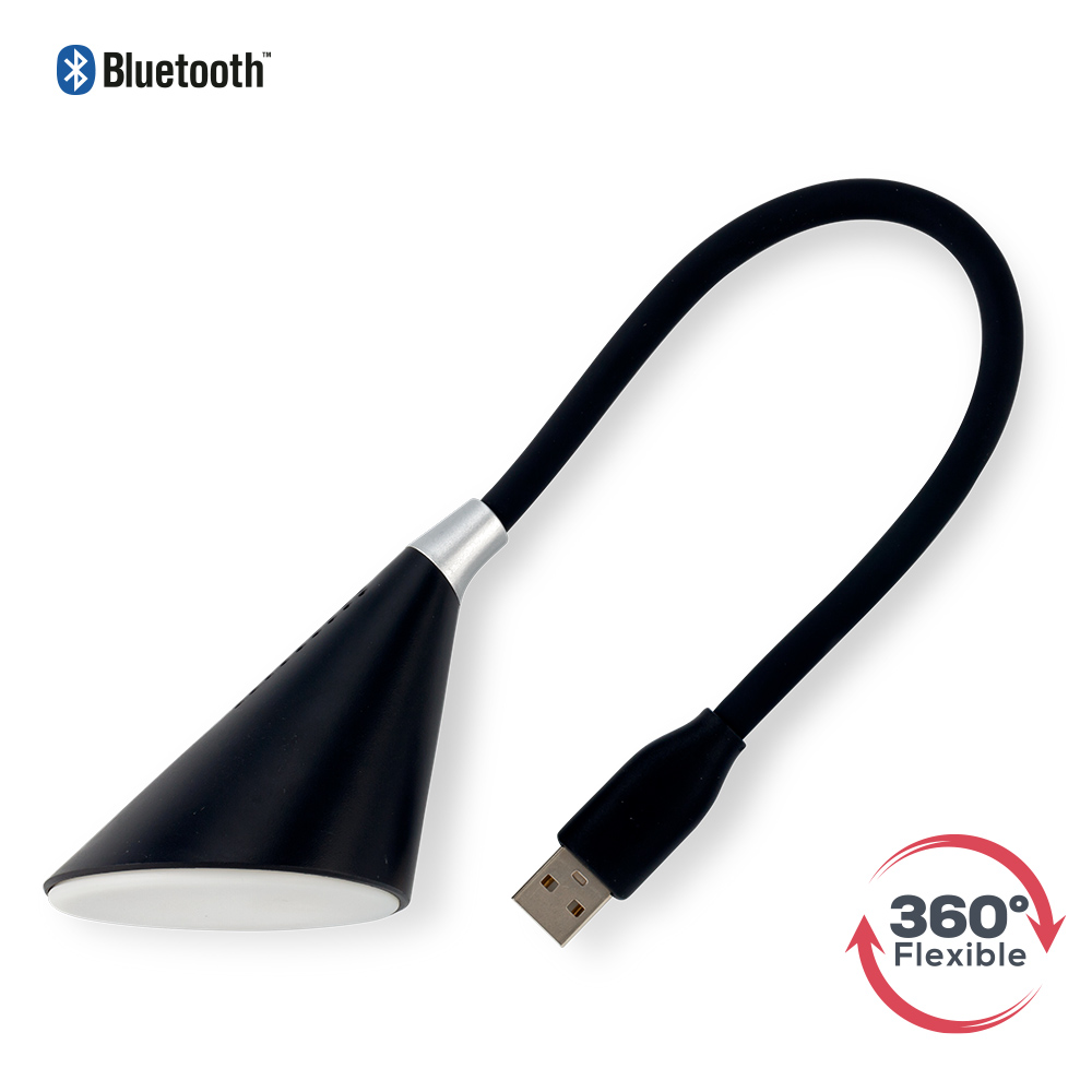 Speaker plástico ABS + PC. Bluetooth V4.2 1X2W, compatible con IOS y Android. Con alimentación de energía por USB, se activa automáticamente. Interruptor táctil y cuello de cisne flexible 360°. No necesita baterías.