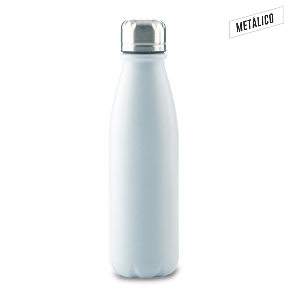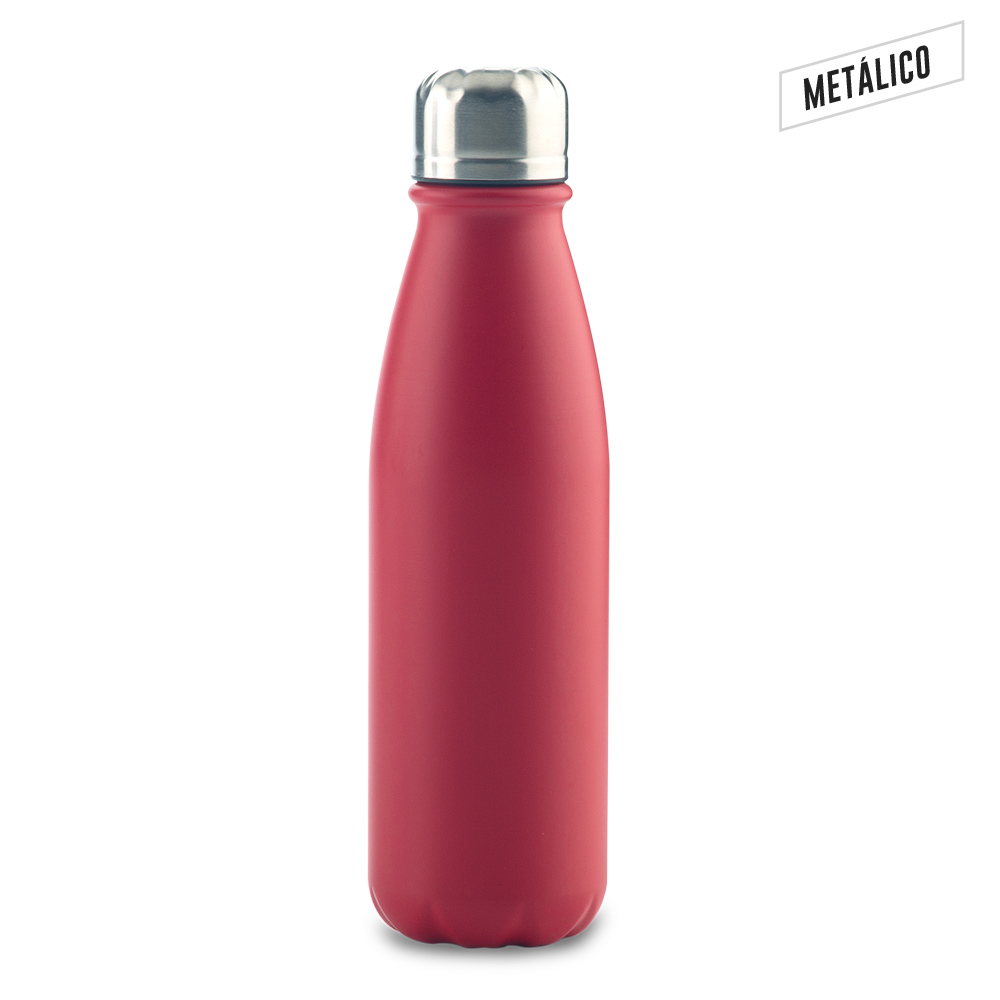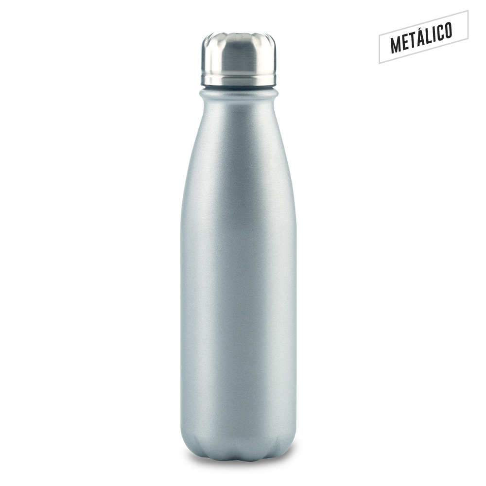 Metálico, en Aluminio. Con tapa rosca. No apto para bebidas calientes.
