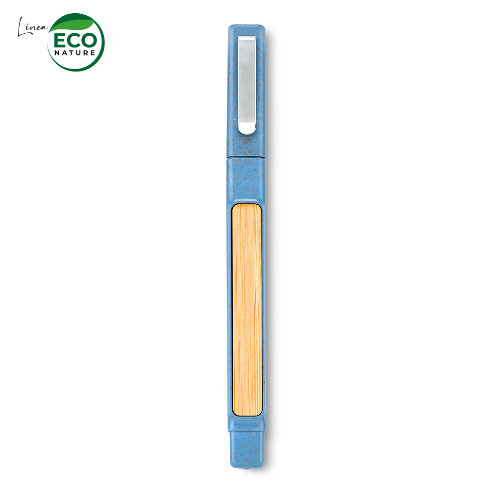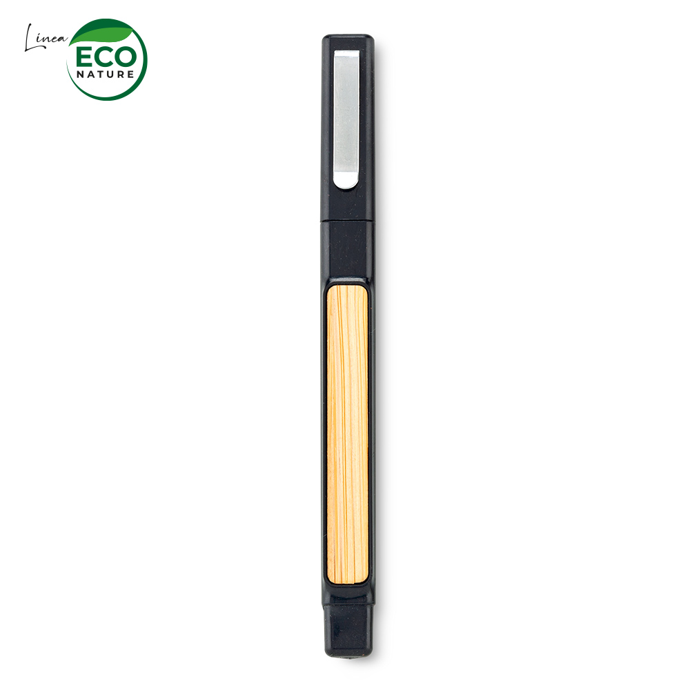Bolígrafo plástico mezclado con material ecológico en fibra de trigo (50%-60% aprox). El porcentaje de material ecológico tiene un promedio de biodegradabilidad de 2-3 años después del fin de su vida útil. Clip metálico, con tapa y parte en bambú natural.