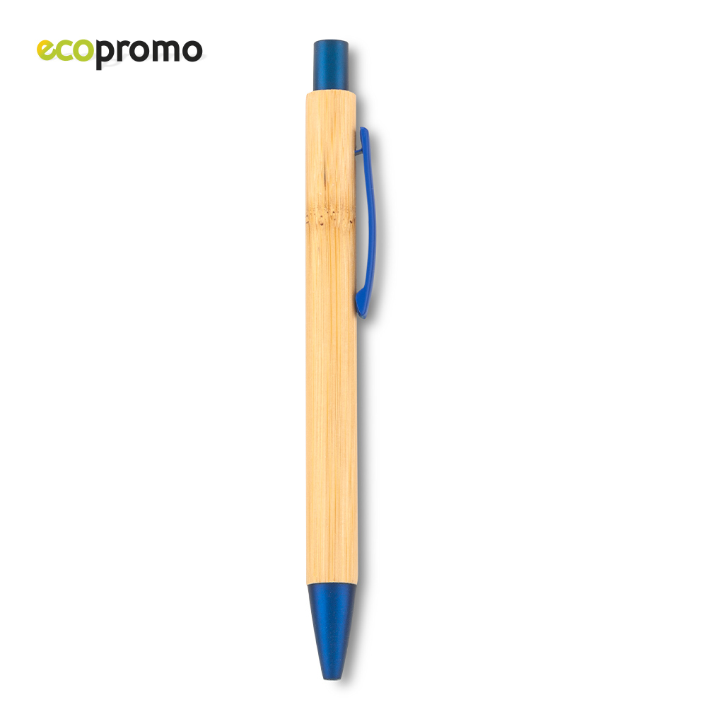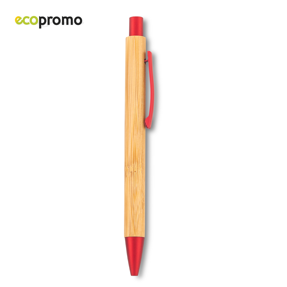 Bolígrafo con partes plásticas, clip metálico y barril en bambú. Mecanismo push.