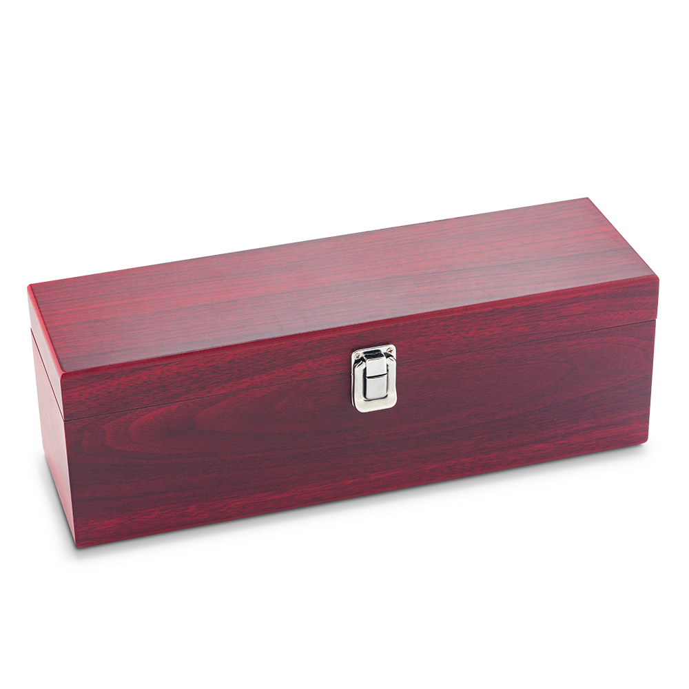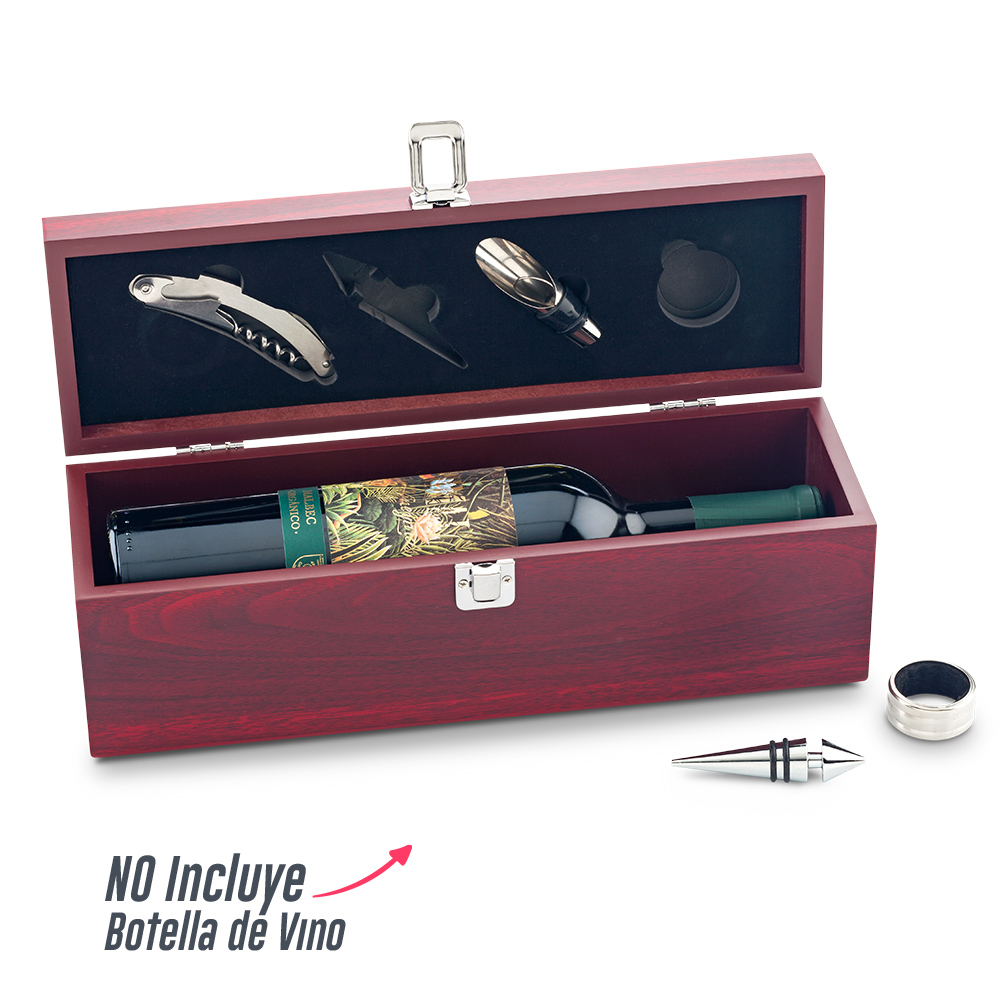 Estuche en madera con argolla antigoteo, 2 corchos, boquilla y descorchador con navaja de sierra y destapador.