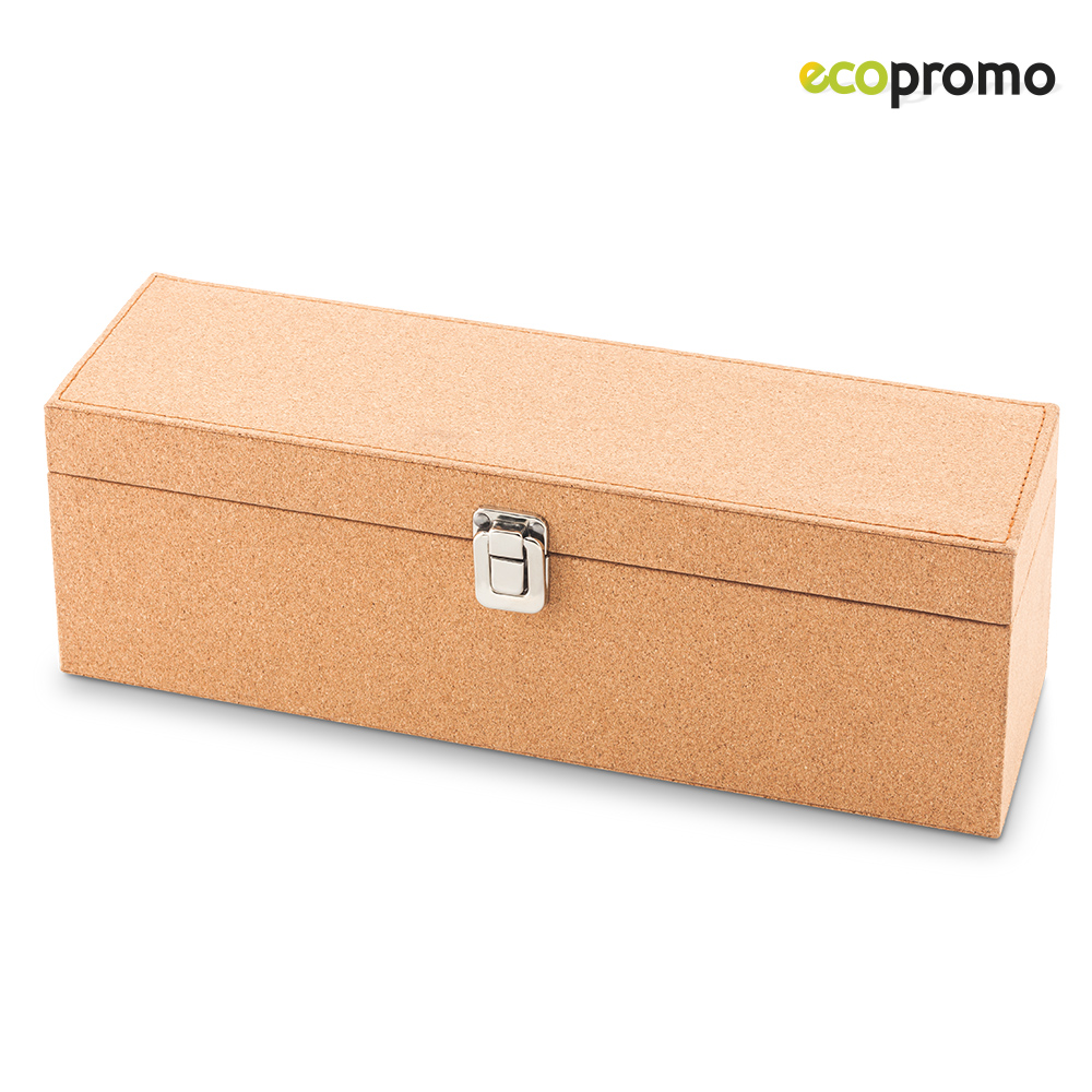 Estuche en corcho con argolla antigoteo, corcho, boquilla y descorchador con navaja de sierra y destapador. Espacio para una botella de vino. No incluye botella de vino.Empaque Caja Individual.