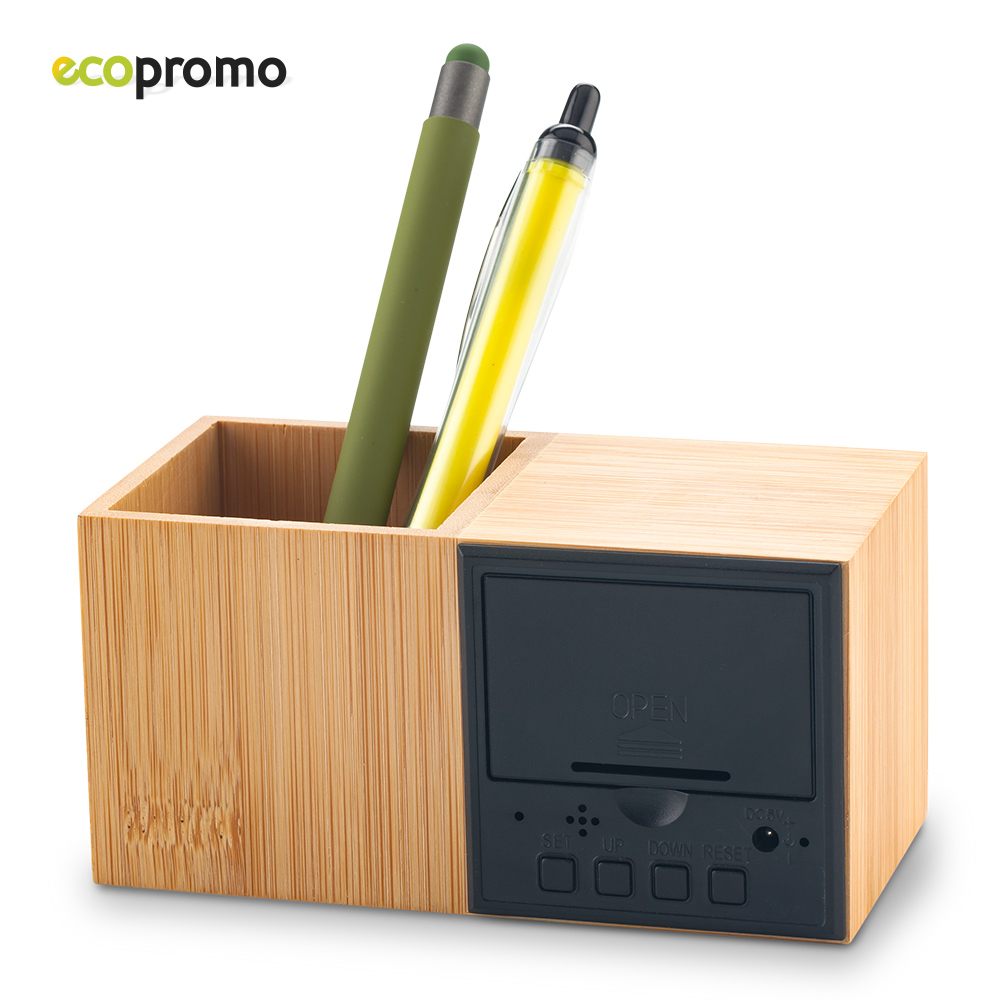 Reloj digital con portabolígrafo en bambú natural. Con reloj, alarma y temperatura. 3 pilas AAA (no incluidas). Empaque caja individual.