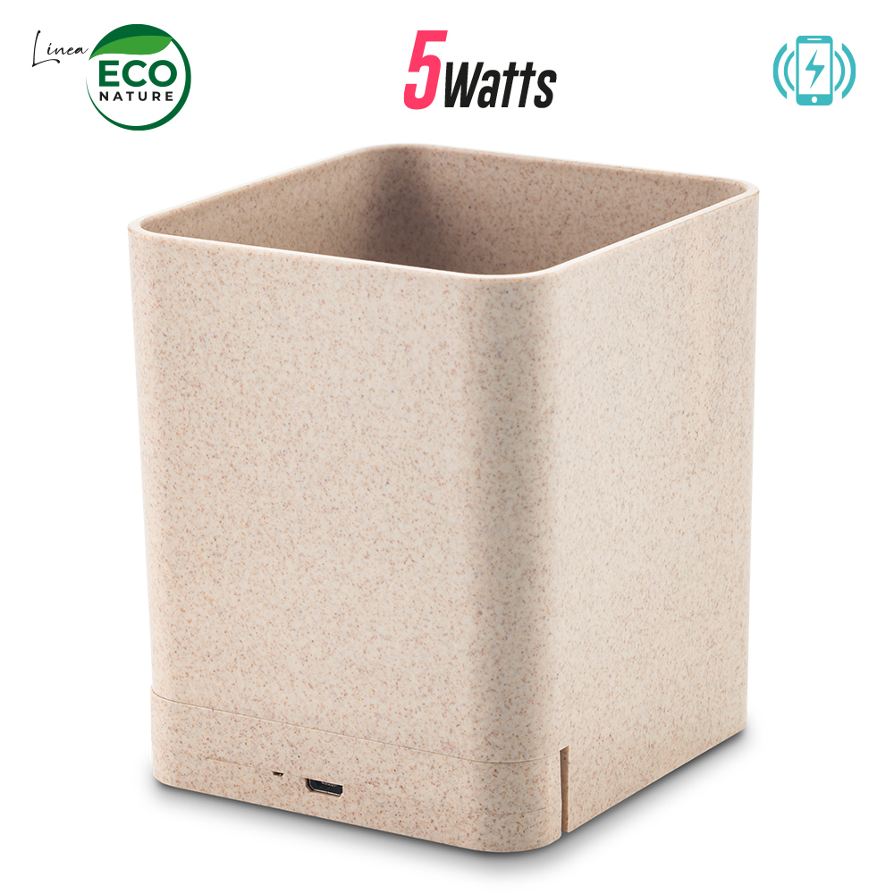Cargador inalámbrico de 5W en la base, plástico con material ecológico de fibra de trigo, portabolígrafos y 3 salidas USB (aptos para carga y para transmisión de datos cuando se usa con el cable que está incluido). Empaque caja individual.