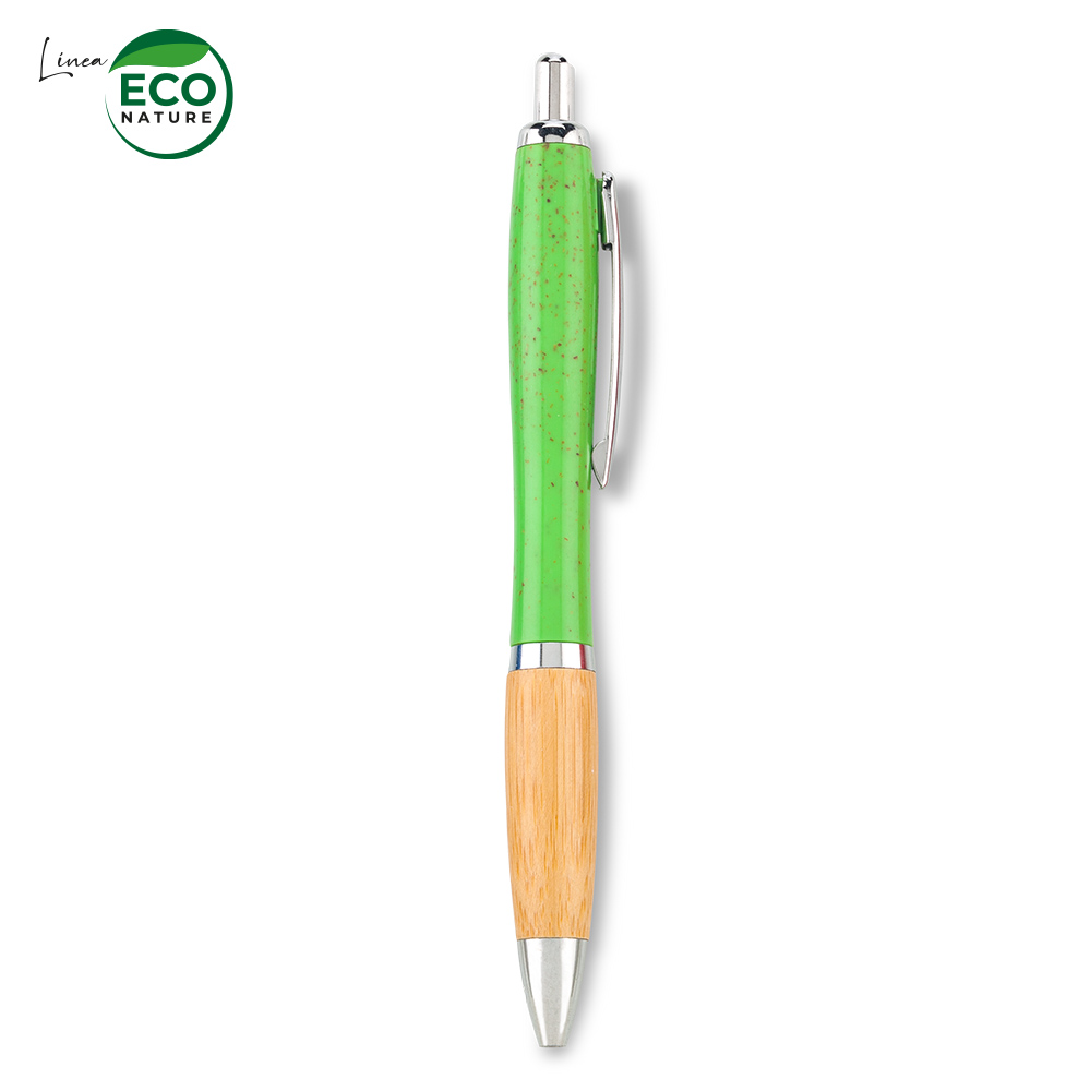 Bolígrafo plástico con parte inferior con bambú natural. Clip metálico. Mezcla con material ecológico en fibra de trigo (50%-60% aprox). El porcentaje de material ecológico tiene un promedio de biodegradabilidad de 2-3 años después del fin de su vida útil. Mecanismo push.