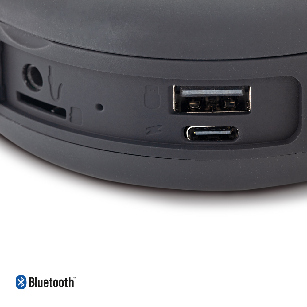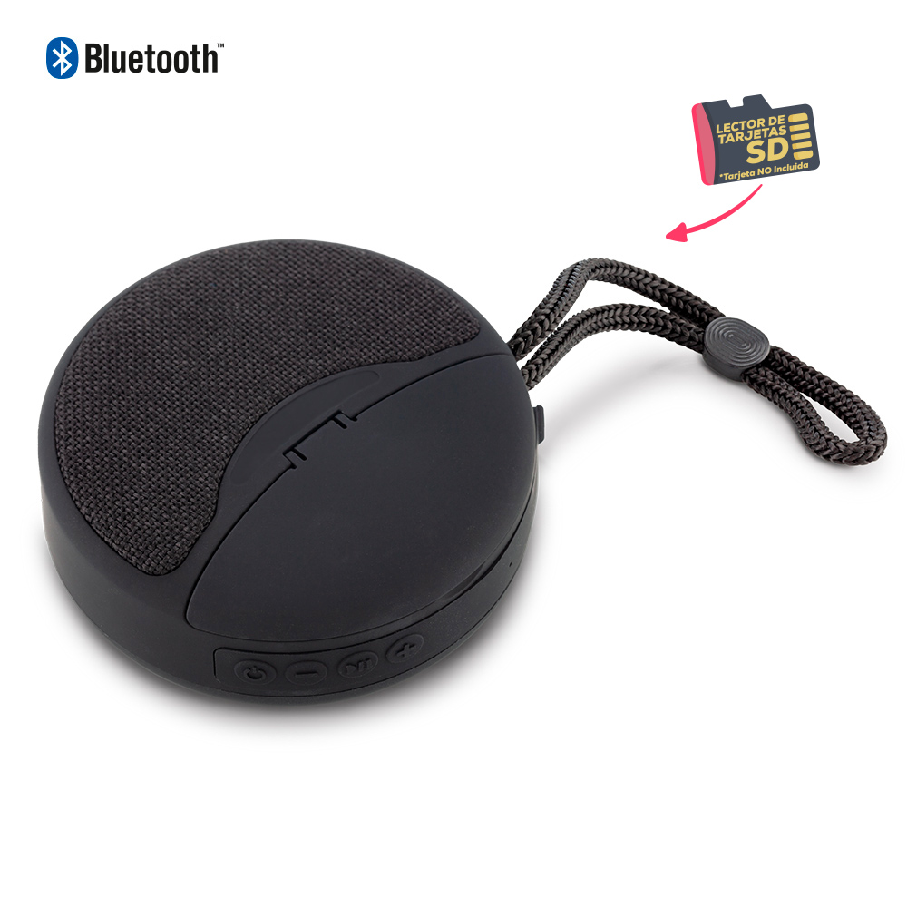 Speaker Bluetooth plástico de 3W con lector de tarjeta y USB (no incluidas). Cuenta con audífonos bluetooth incorporados en la parte superior. Funciona como manos libres.
