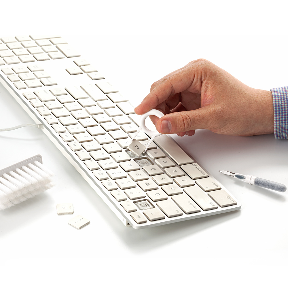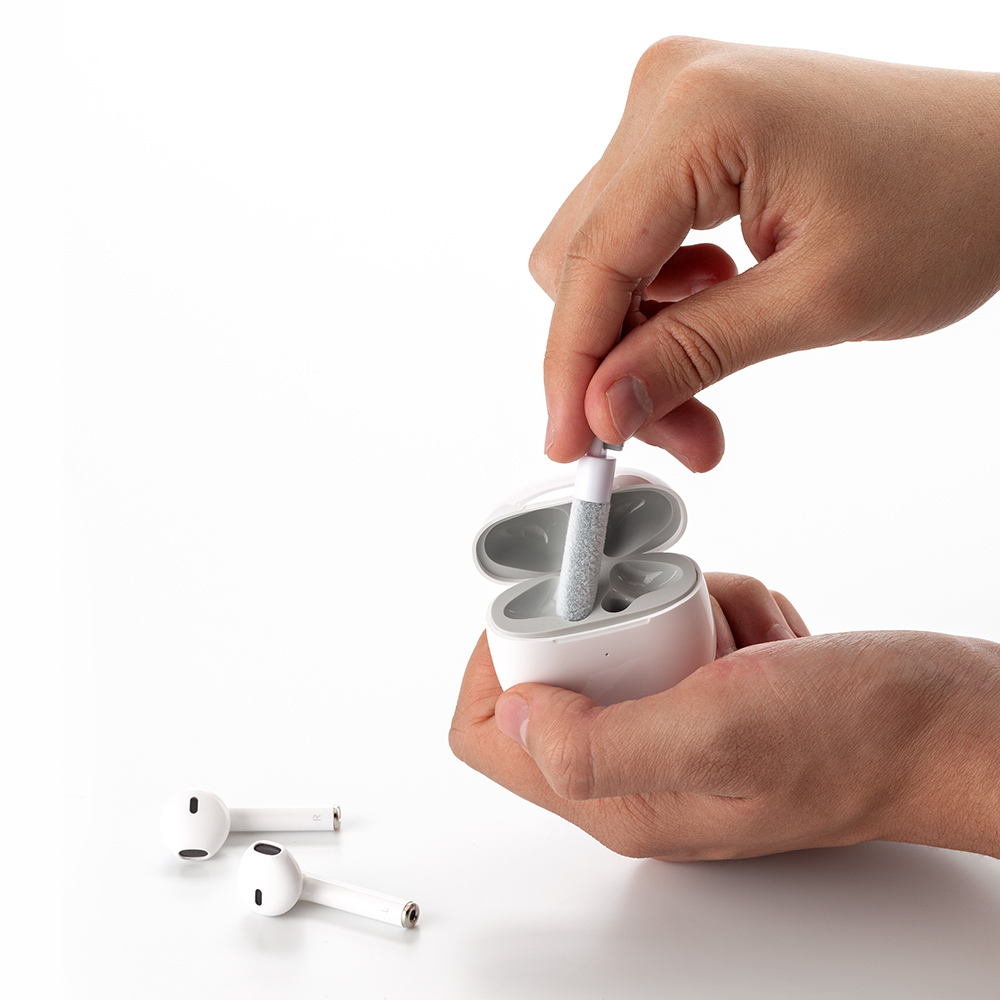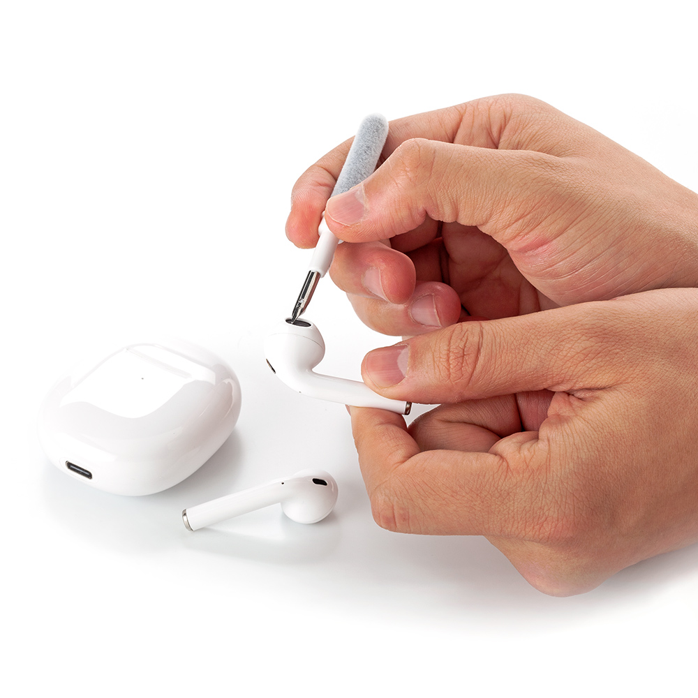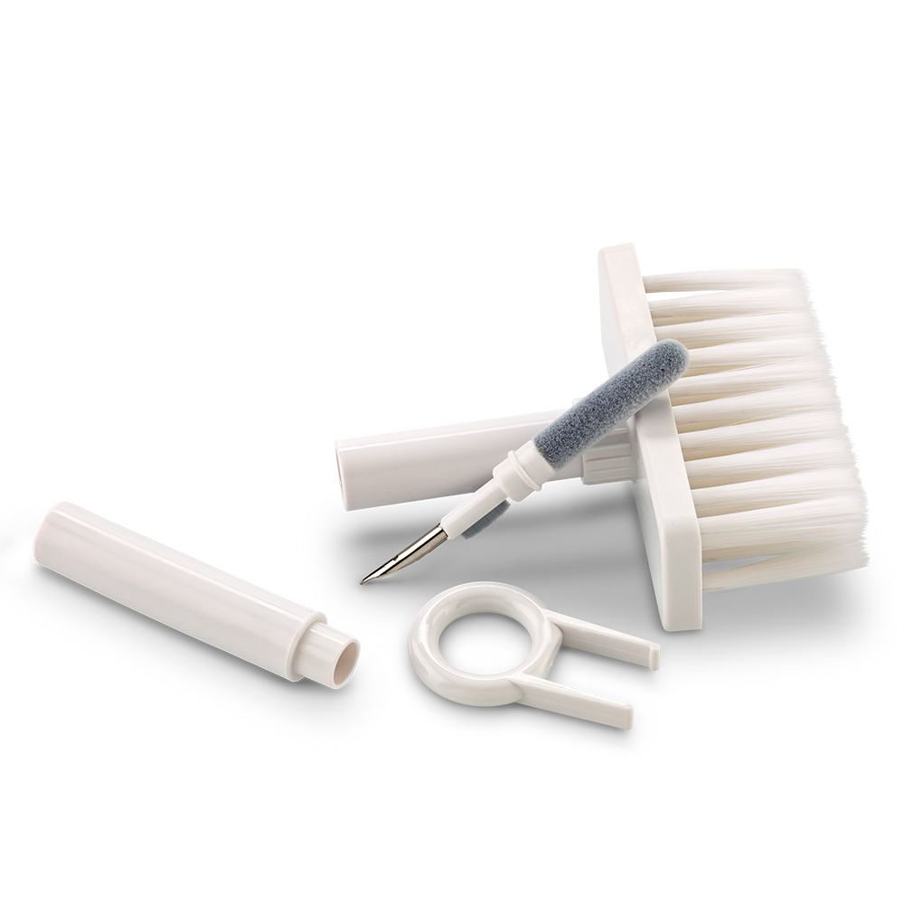 Set de limpieza multiusos que contiene un cepillo externo de cerdas suaves, un mini cepillo fino y suave, que limpia el compartimento de carga de la funda de auriculares, un cabezal de cerdas densas para una fácil limpieza del orificio de sonido de los auriculares y otras partes de los auriculares; una punta de metal para una limpieza profunda de grietas y suciedad de limpieza difícil y extractor de teclas. Se usa como multiusos y para limpieza profunda de cada esquina del teclado y auriculares.